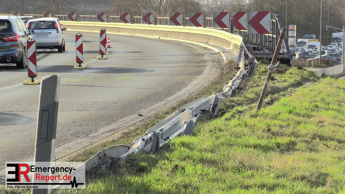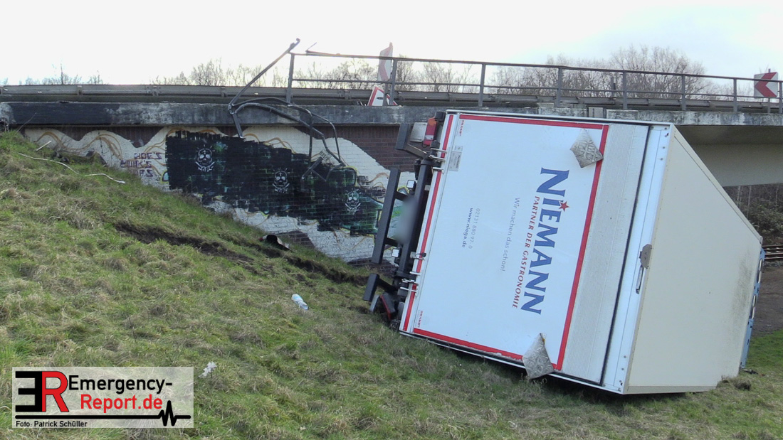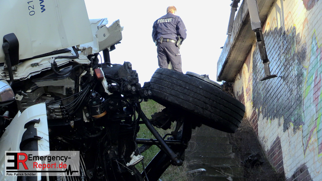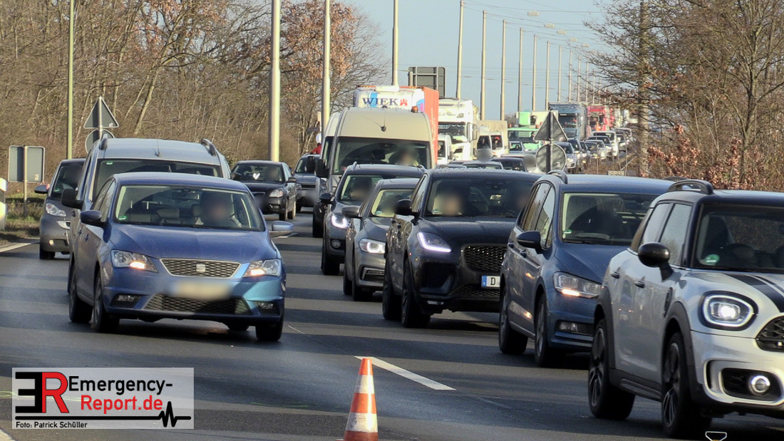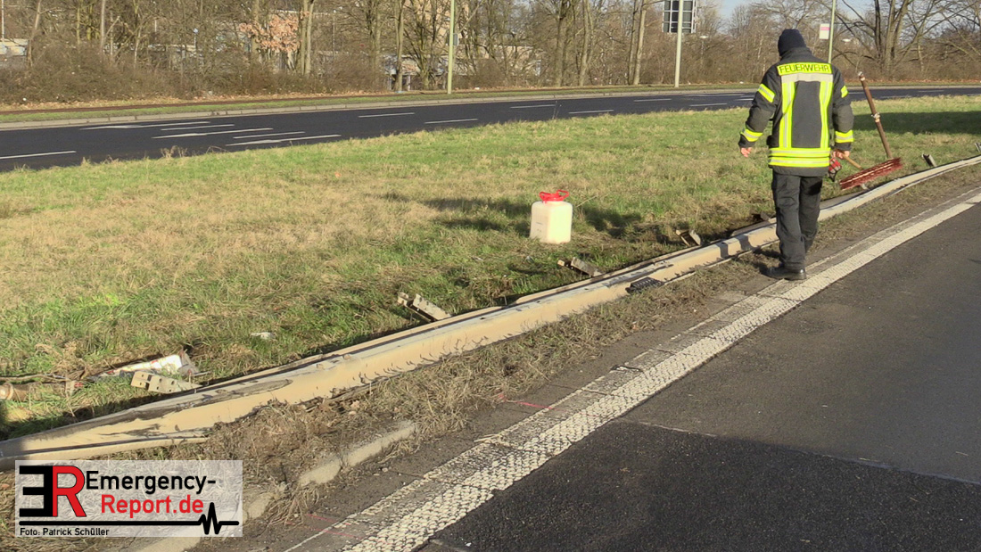 Am Donnerstag (20.01.2022), gegen 13:25 Uhr, kam es auf der Bundesstraße 1 aus Richtung Düsseldorf kommend zu einem Verkehrsunfall. Ein LKW war aus noch ungeklärter Ursache etwa 150 Meter hinter der Ausfahrt Rheinparkcenter nach rechts von der Fahrbahn abgekommen; das Fahrzeug stürzte etwa 6 Meter in die Tiefe. Der Fahrer wurde dabei schwer verletzt, der Beifahrer leicht. Beide wurden in ein Krankenhaus gebracht. Lebensgefahr besteht nicht. Während der Verkehrsunfallaufnahme musste die Bundesstraße 1 gesperrt werden. Für die Unfallaufnahme ist zusätzlich das zentrale Verkehrsunfallaufnahmeteam im Einsatz.
