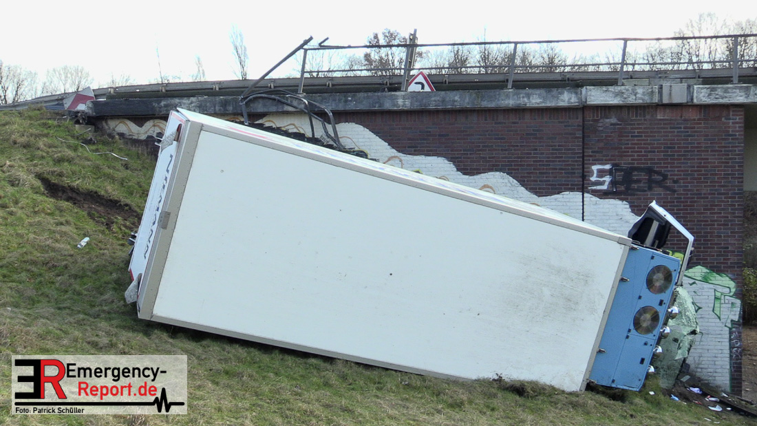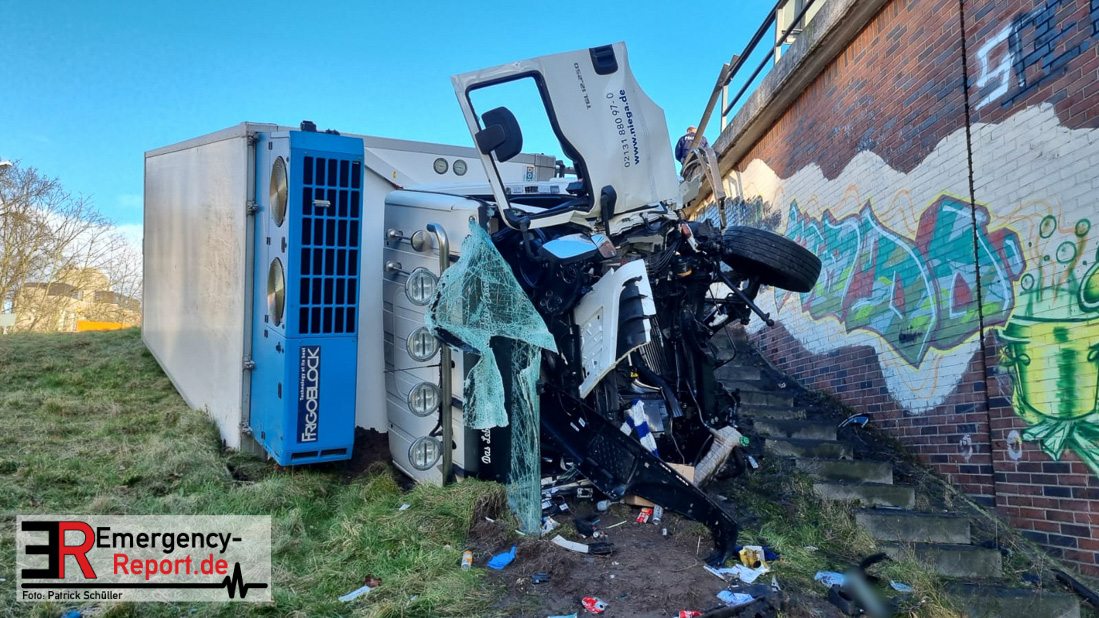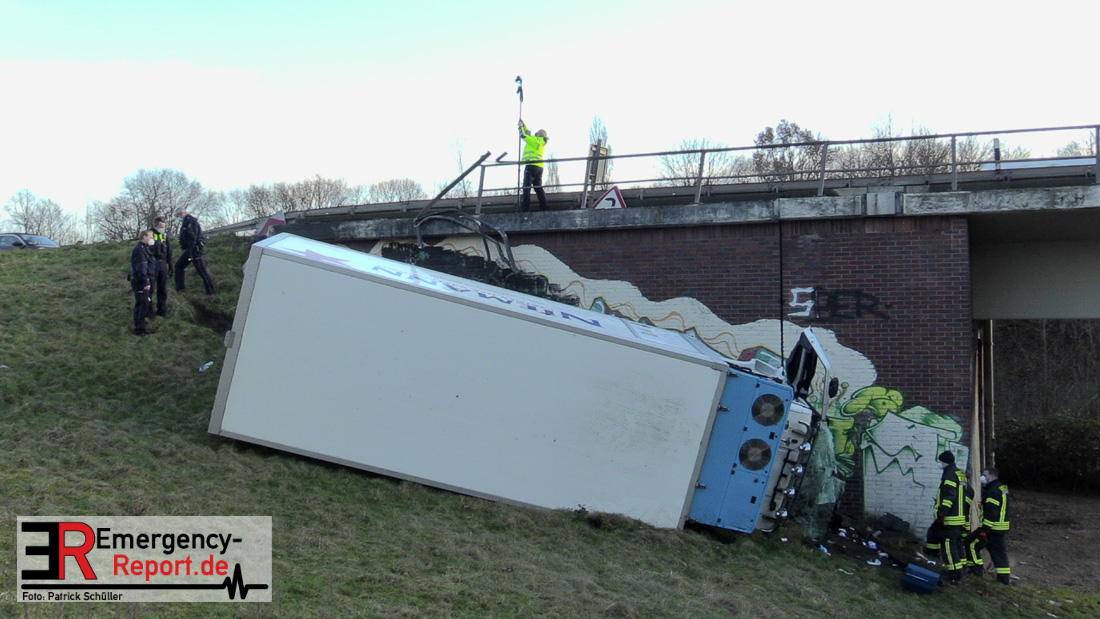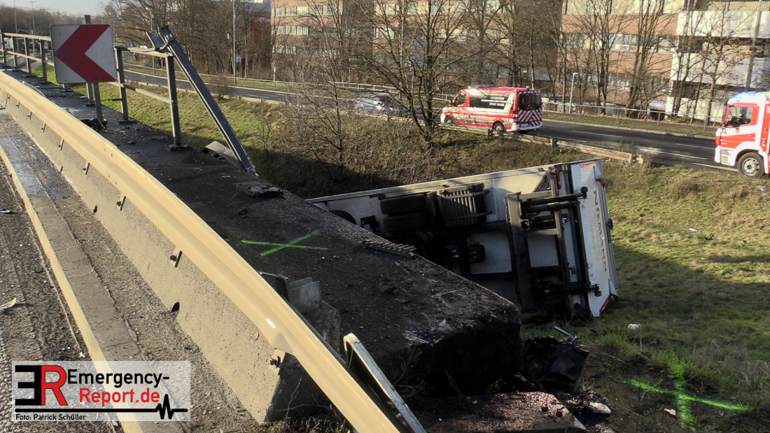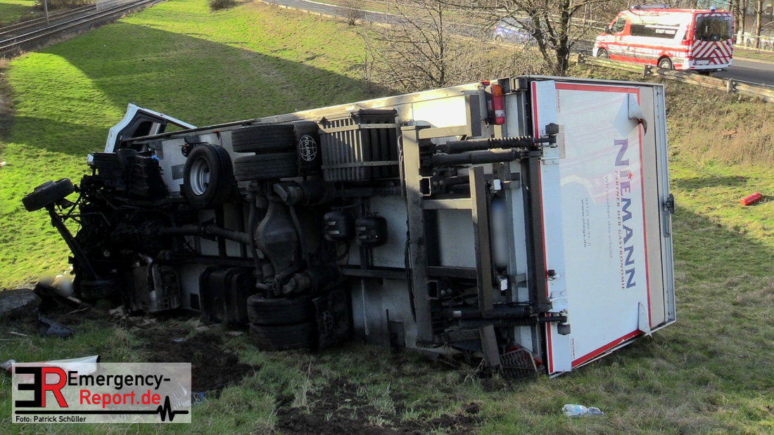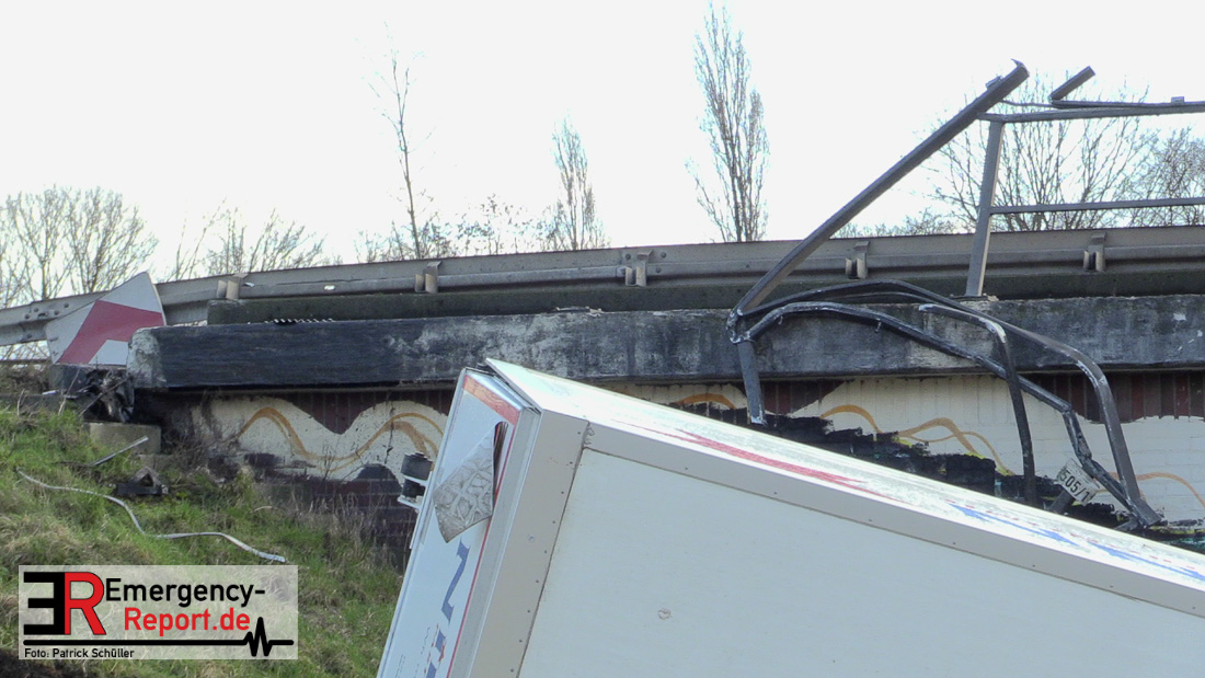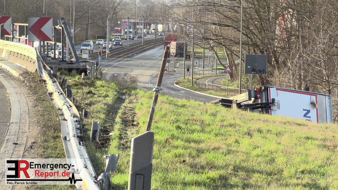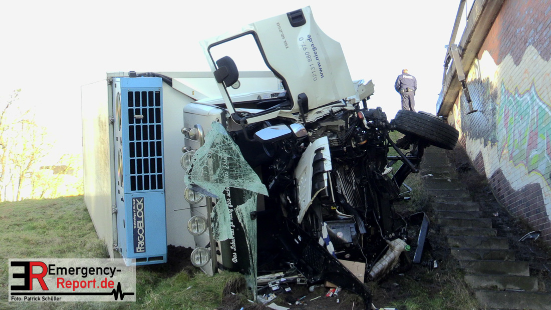 Noch während dieser Maßnahmen erreichte die Leitstelle gegen 13:30 Uhr erneut ein Notruf, diesmal von der Josef-Kardinal-Frings Brücke. Dort sollte nun auch ein LKW von der Fahrbahn abgekommen und eine Brücke herabgestürzt sein, die auf die B1 führte. Die unverzüglich alarmierten Kräfte, teils von der Einsatzstelle A57 und teils von der Hauptwache, trafen nach wenigen Minuten ein und bestätigten auch hier die Meldung. Ein Kühltransporter war nach rechts von der Straße abgekommen, etwa 6 m in die Tiefe gestürzt und auf der Seite liegen geblieben. Sowohl der Fahrer als auch der Beifahrer waren in ihrer Fahrzeugkabine eingeschlossen. Sofort begannen die eingetroffenen Kräfte mit der technischen Rettung und konnten beide Insassen befreien. Der Beifahrer wurde leicht, der Fahrer schwer verletzt an den Rettungsdienst übergeben.