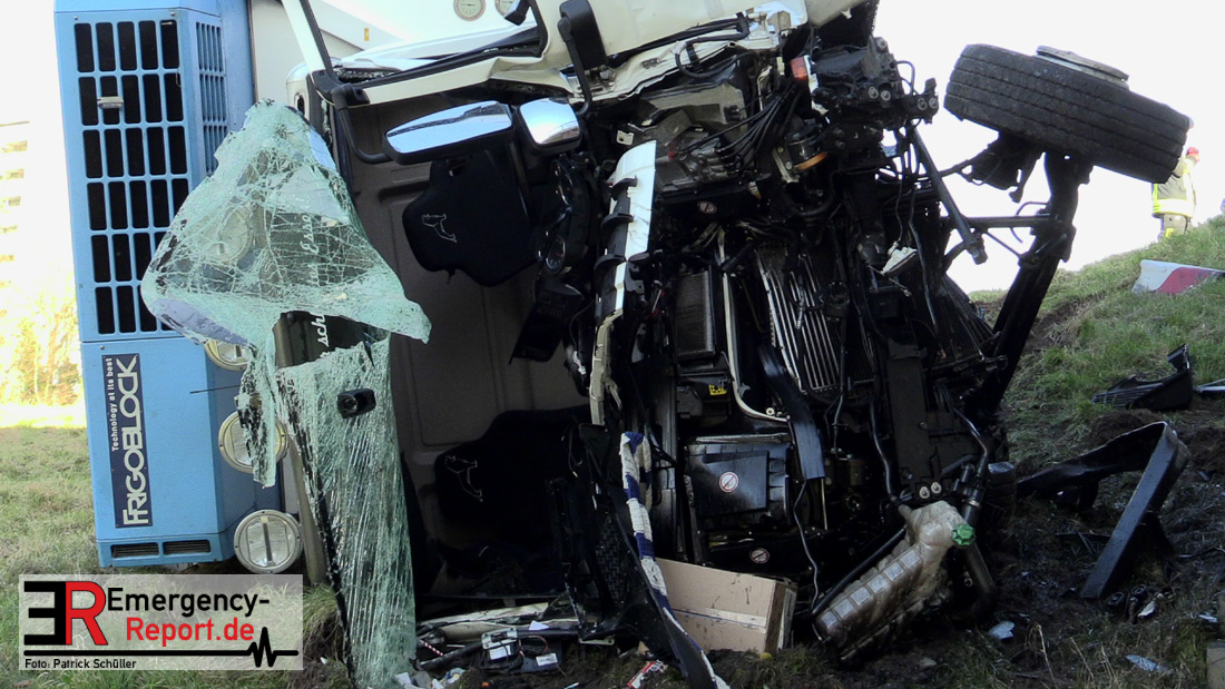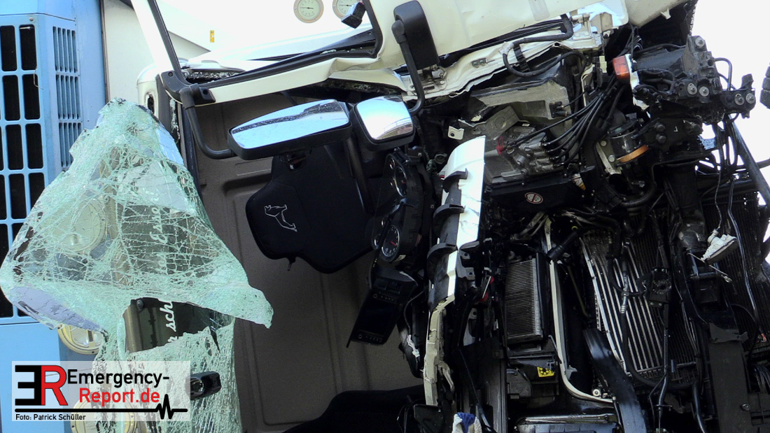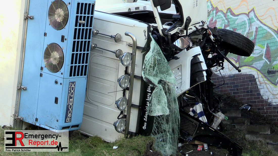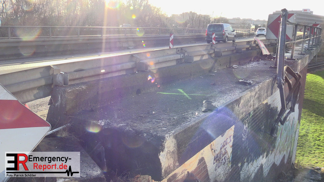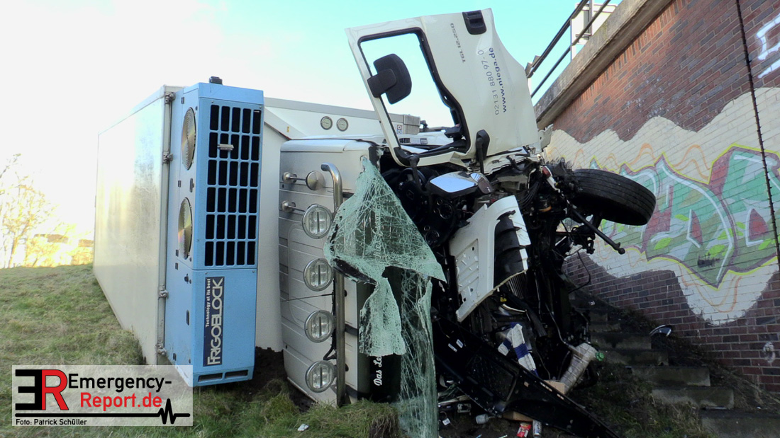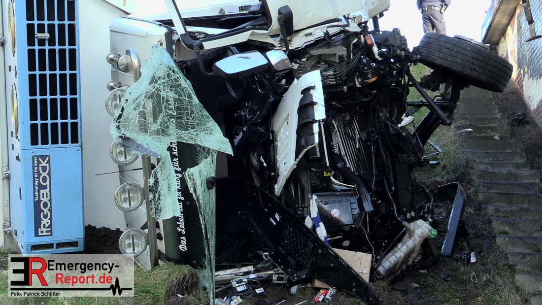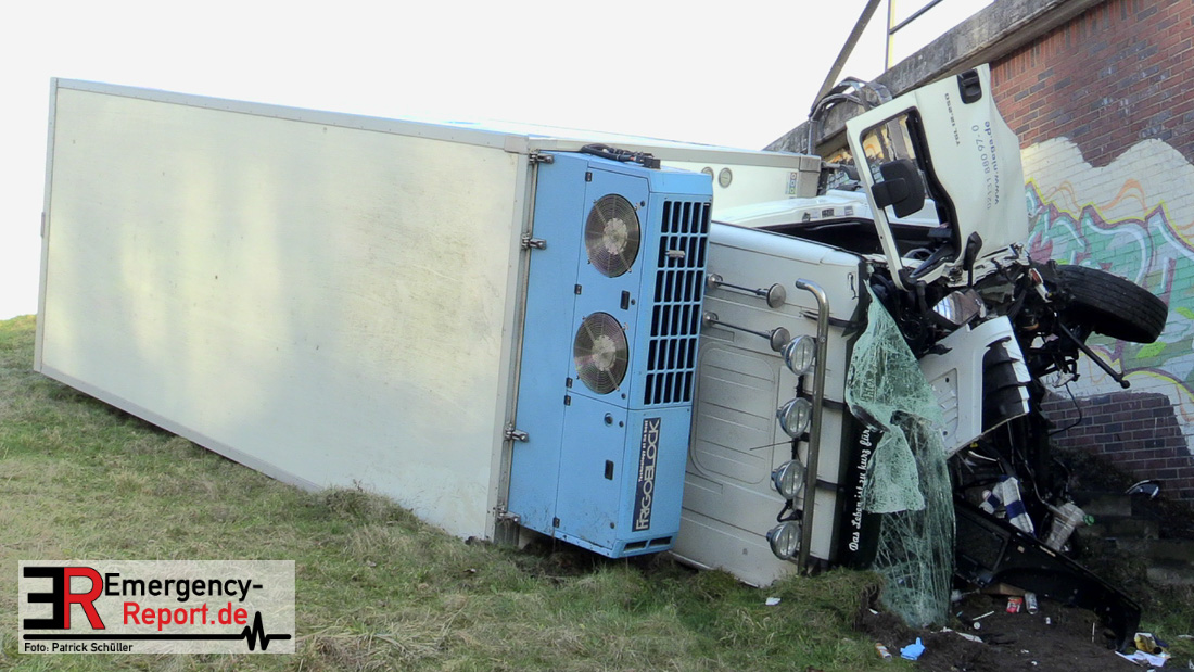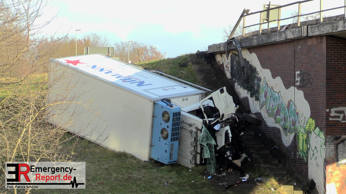 Noch während dieser Maßnahmen erreichte die Leitstelle gegen 13:30 Uhr erneut ein Notruf, diesmal von der Josef-Kardinal-Frings Brücke. Dort sollte nun auch ein LKW von der Fahrbahn abgekommen und eine Brücke herabgestürzt sein, die auf die B1 führte. Die unverzüglich alarmierten Kräfte, teils von der Einsatzstelle A57 und teils von der Hauptwache, trafen nach wenigen Minuten ein und bestätigten auch hier die Meldung. Ein Kühltransporter war nach rechts von der Straße abgekommen, etwa 6 m in die Tiefe gestürzt und auf der Seite liegen geblieben. Sowohl der Fahrer als auch der Beifahrer waren in ihrer Fahrzeugkabine eingeschlossen. Sofort begannen die eingetroffenen Kräfte mit der technischen Rettung und konnten beide Insassen befreien. Der Beifahrer wurde leicht, der Fahrer schwer verletzt an den Rettungsdienst übergeben.