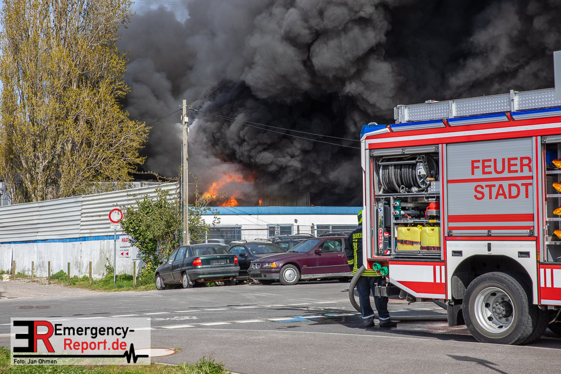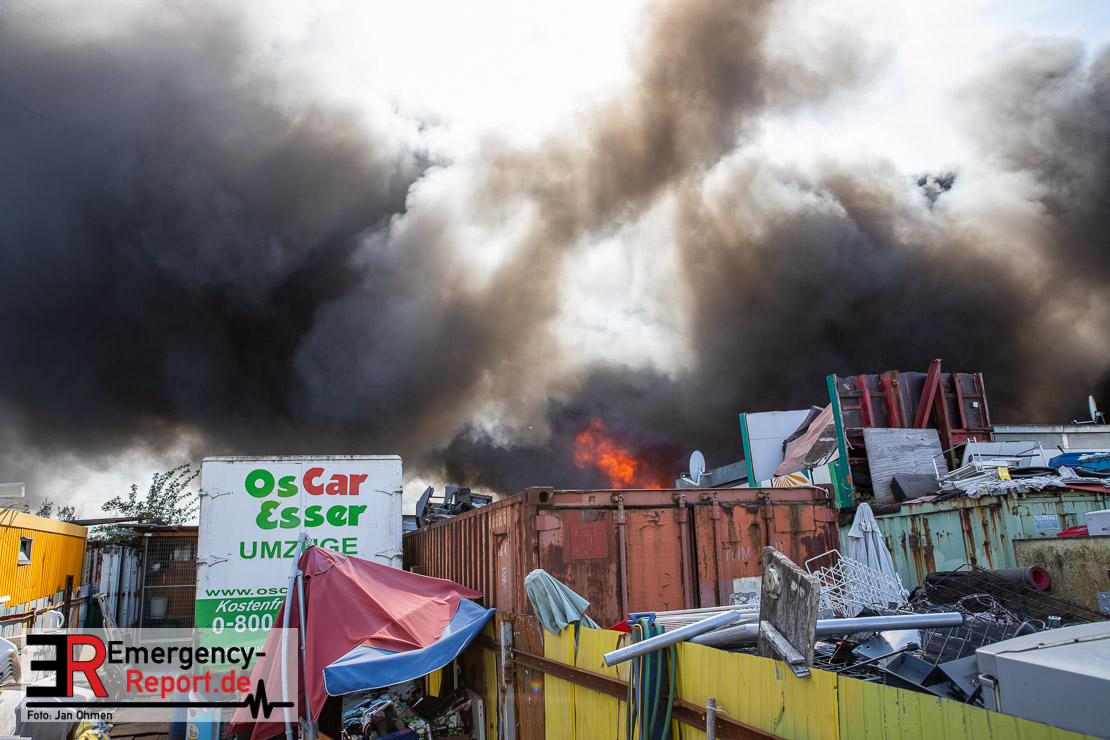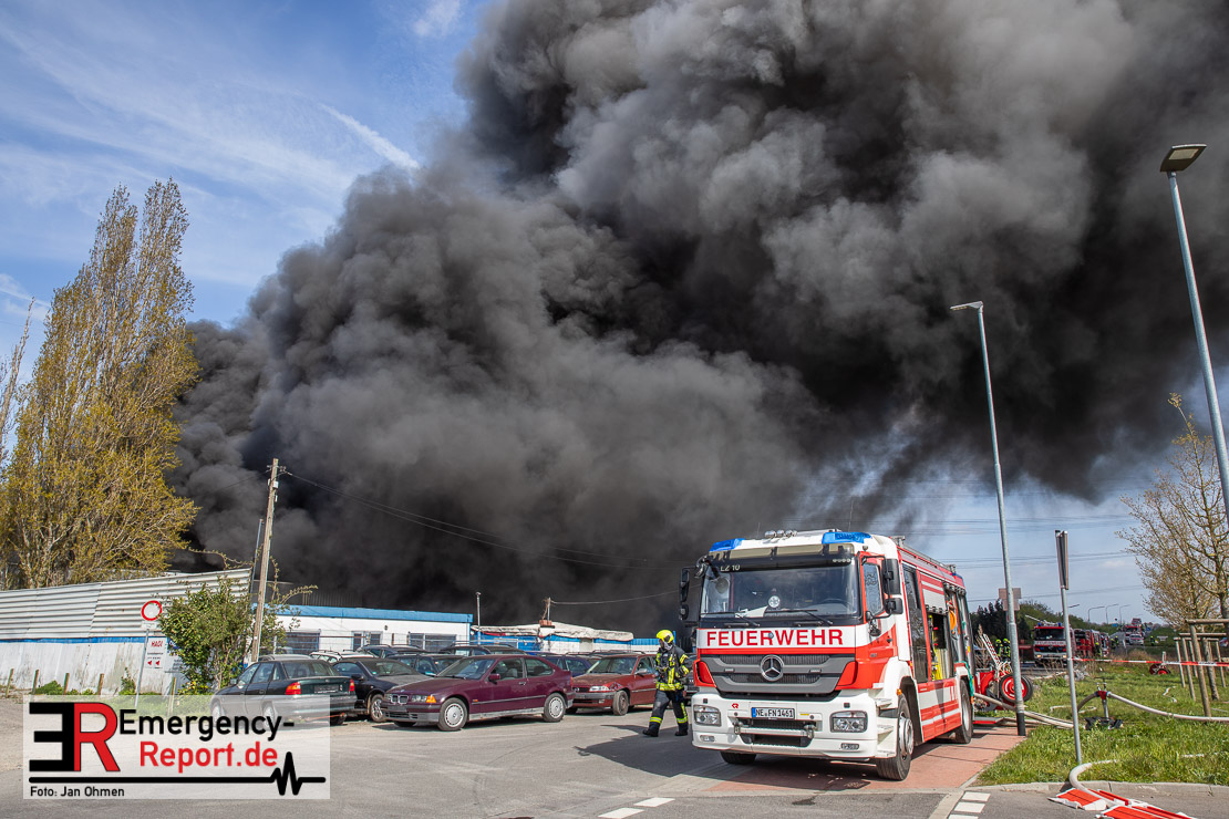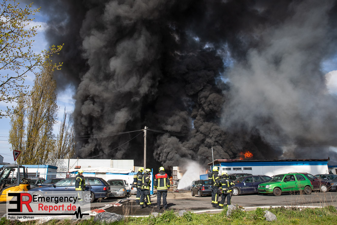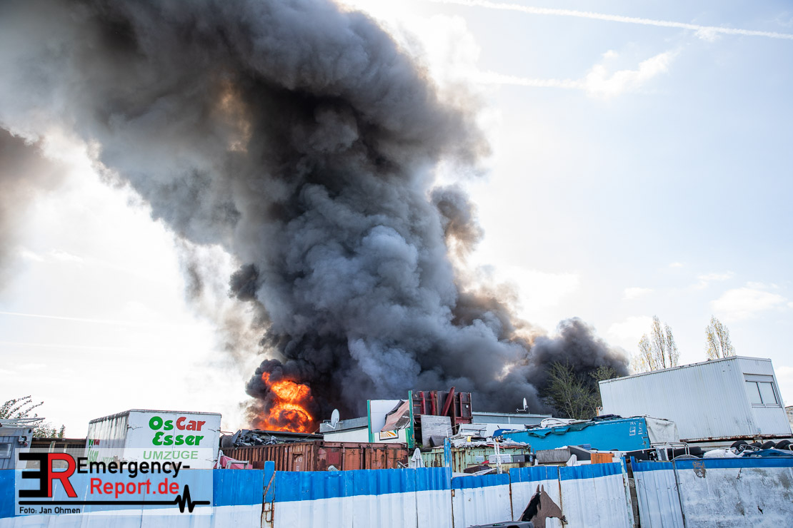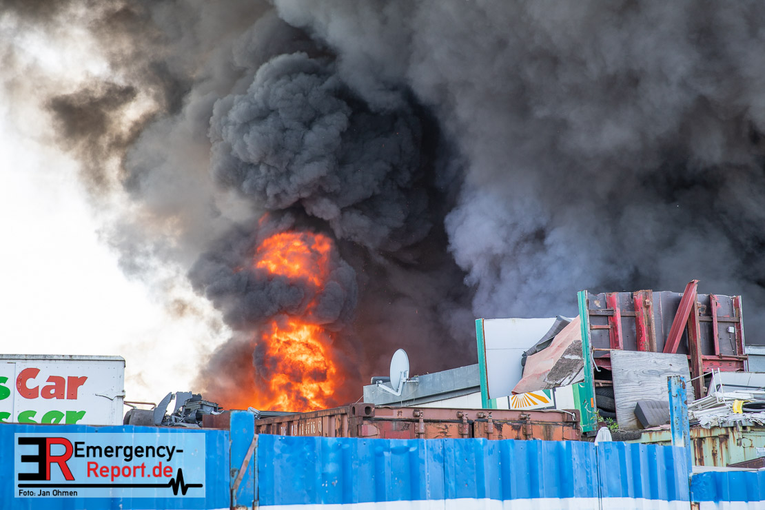 Es brennt aktuell auf einer Fläche von 120x100m. Trotz Riegelstellungen und massivem Einsatz von Kräften sowie mehreren Drehleitern und Wasserwerfern ist der Brand schwer unter Kontrolle zu halten. Das Feuer wird mit allen verfügbaren Kräften auf den Bereich des Schrottplatzes begrenzt. Weiterhin ist es gelungen, ein am Schrottplatz gelegenes Wohnhaus zu schützen.