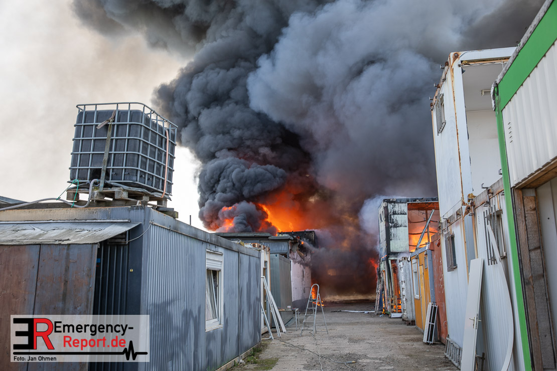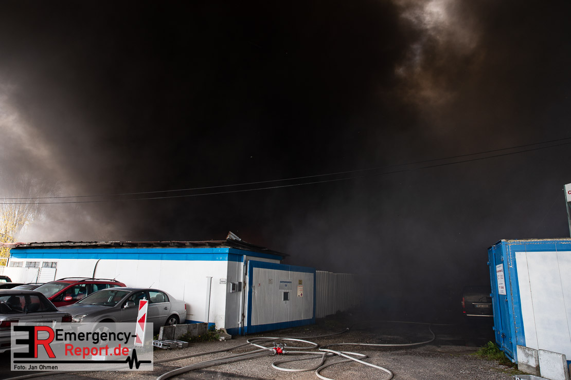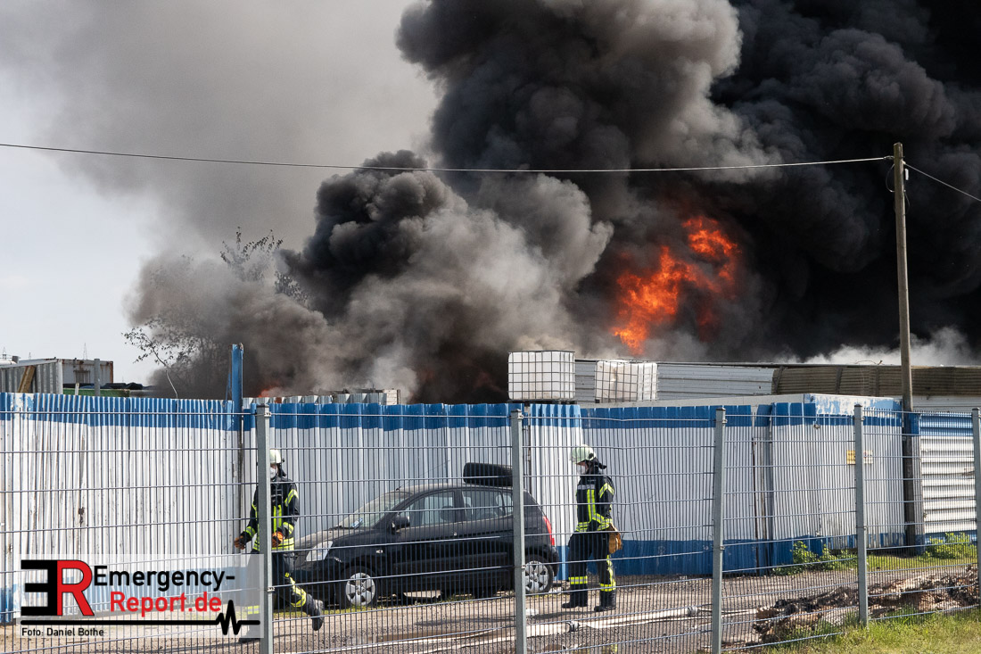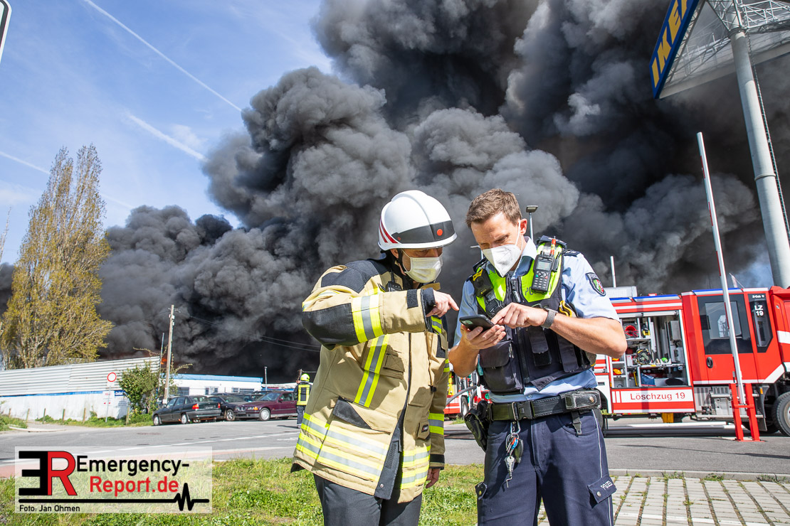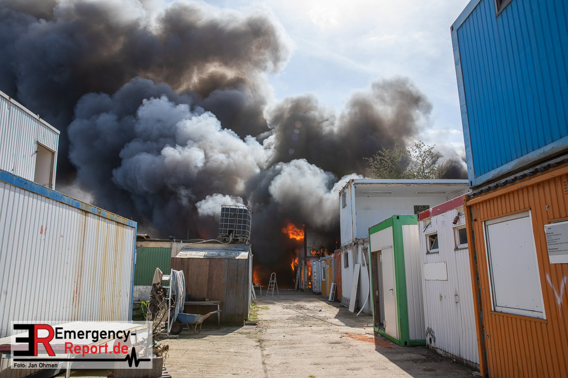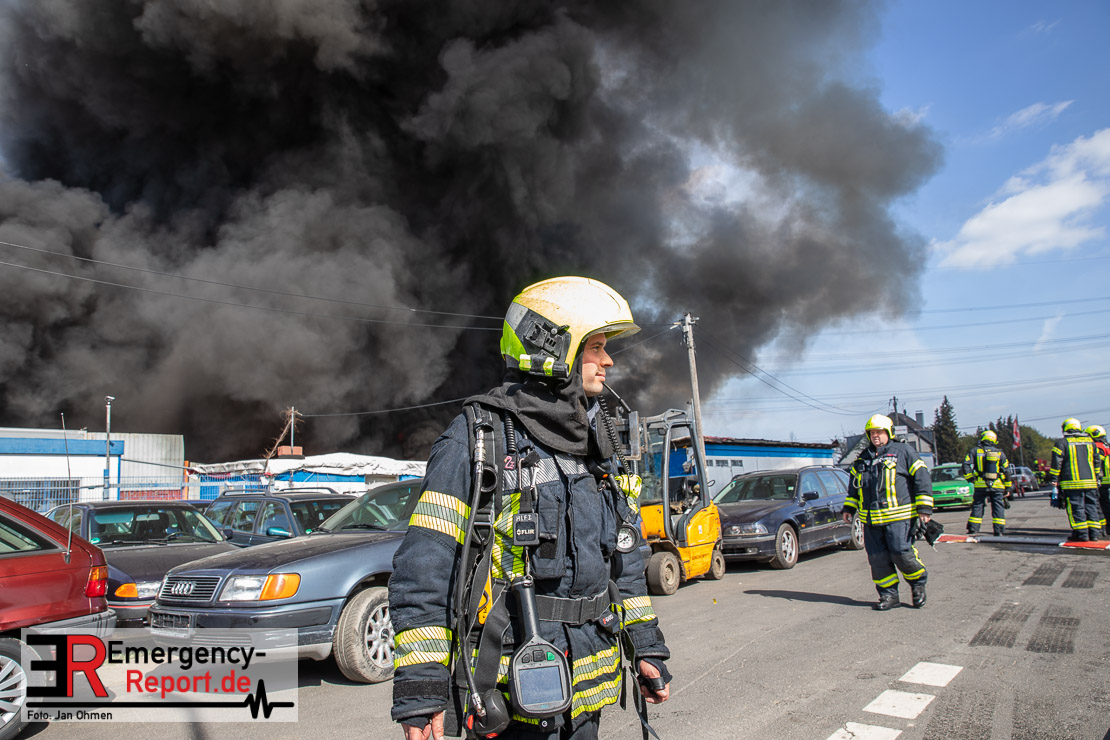 Es brennt aktuell auf einer Fläche von 120x100m. Trotz Riegelstellungen und massivem Einsatz von Kräften sowie mehreren Drehleitern und Wasserwerfern ist der Brand schwer unter Kontrolle zu halten. Das Feuer wird mit allen verfügbaren Kräften auf den Bereich des Schrottplatzes begrenzt. Weiterhin ist es gelungen, ein am Schrottplatz gelegenes Wohnhaus zu schützen.
