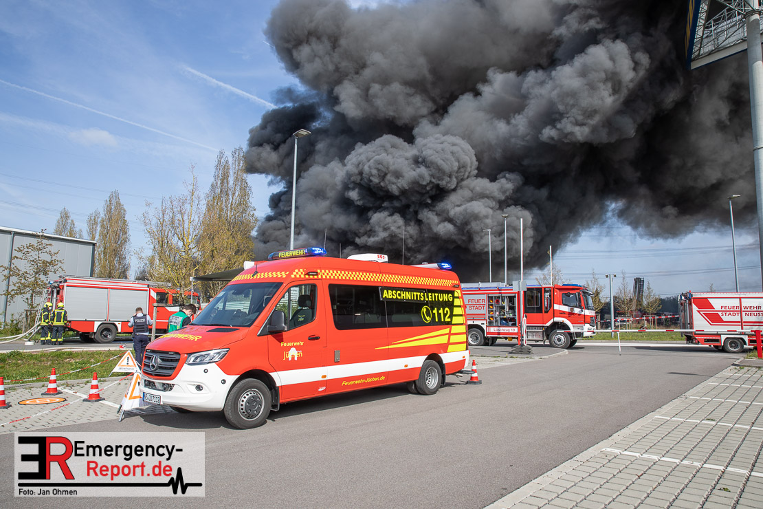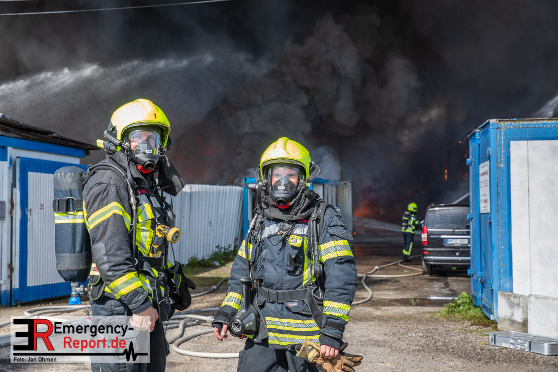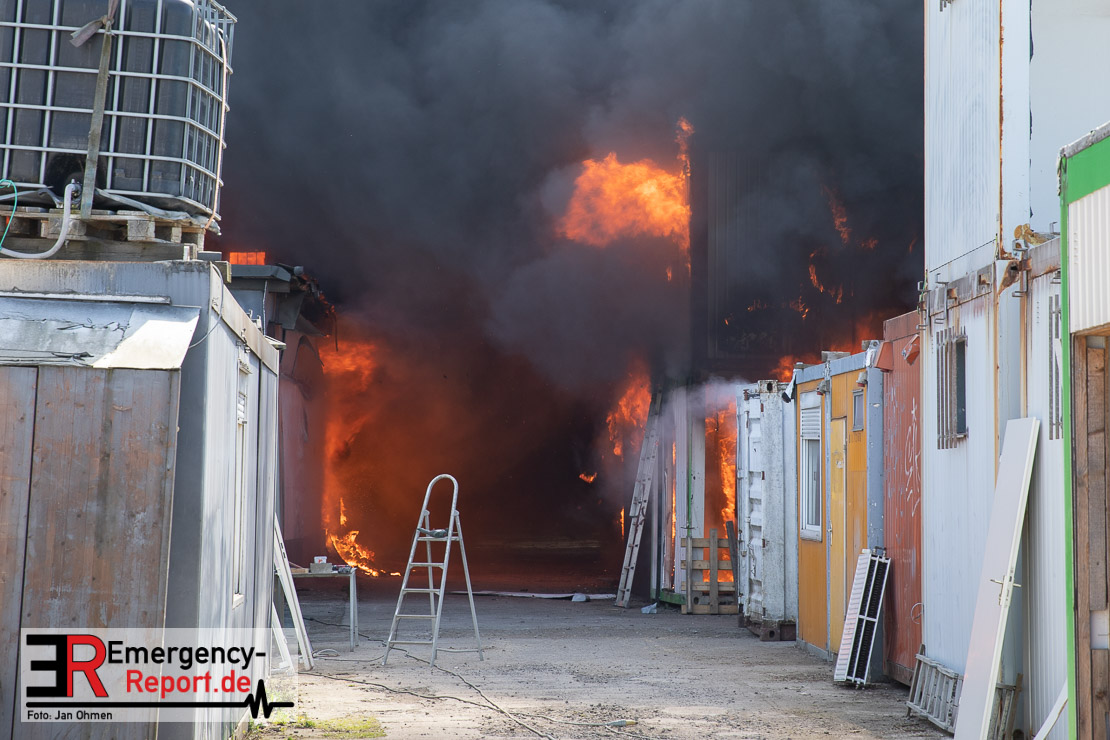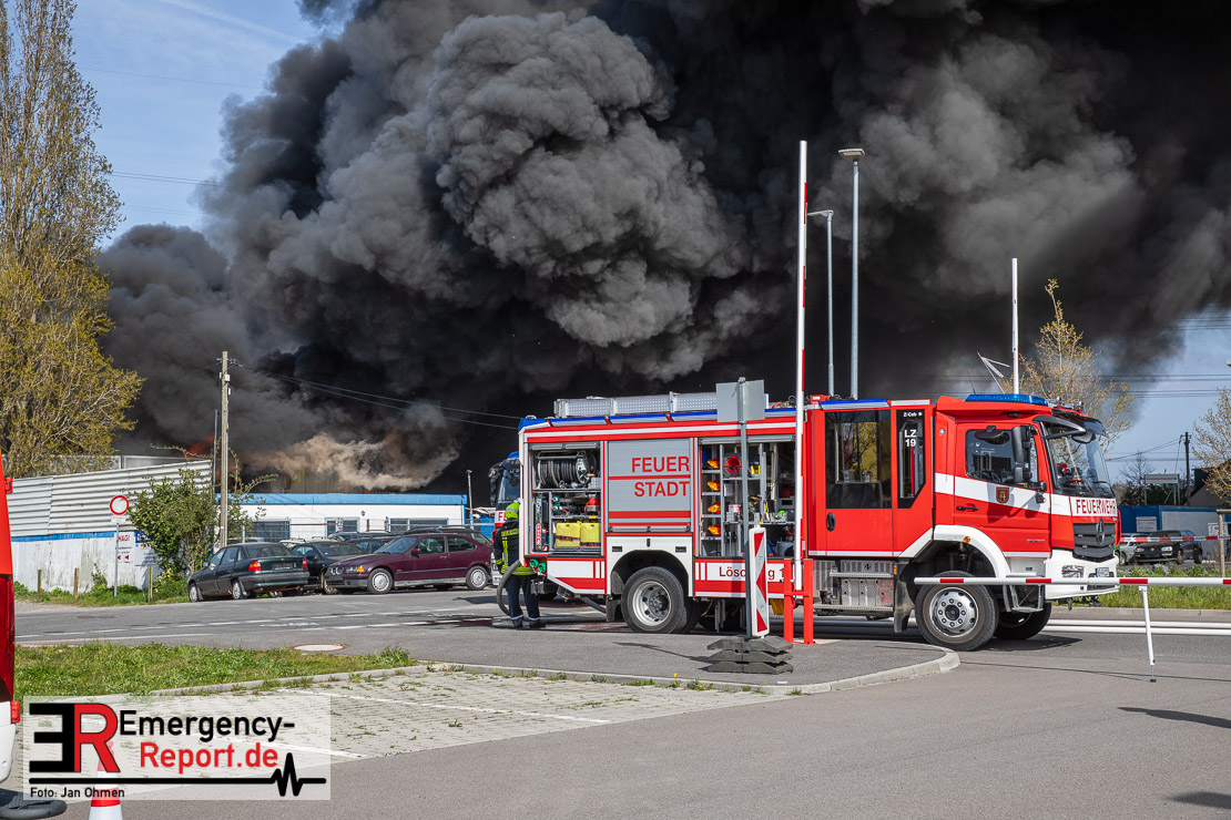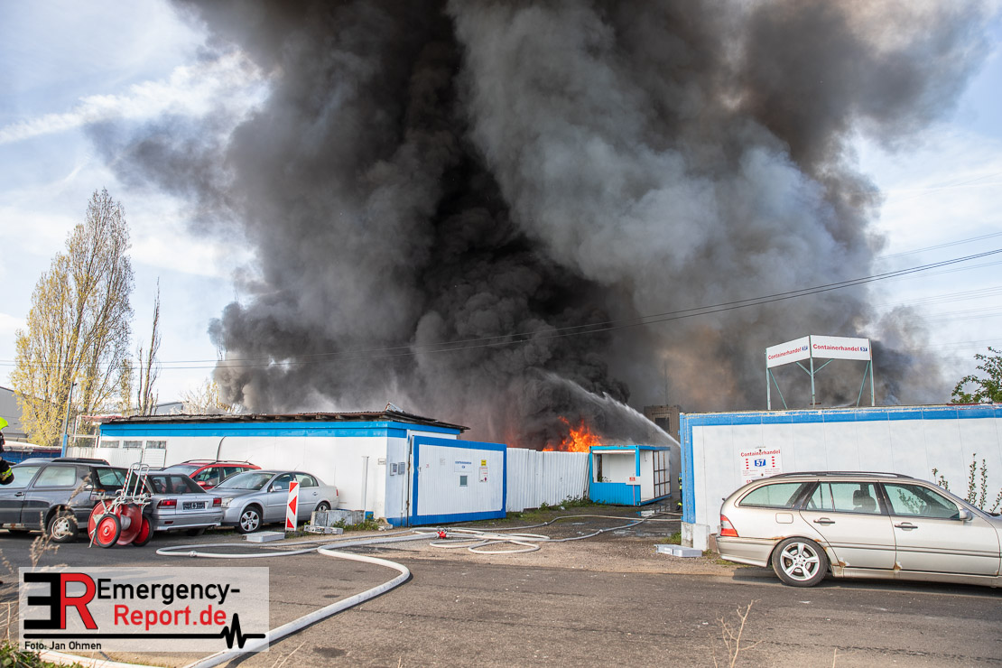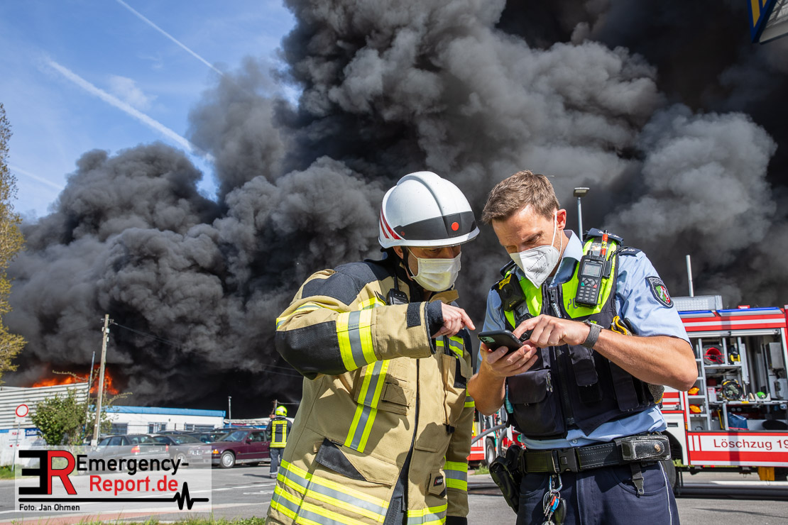 Es brennt aktuell auf einer Fläche von 120x100m. Trotz Riegelstellungen und massivem Einsatz von Kräften sowie mehreren Drehleitern und Wasserwerfern ist der Brand schwer unter Kontrolle zu halten. Das Feuer wird mit allen verfügbaren Kräften auf den Bereich des Schrottplatzes begrenzt. Weiterhin ist es gelungen, ein am Schrottplatz gelegenes Wohnhaus zu schützen.
