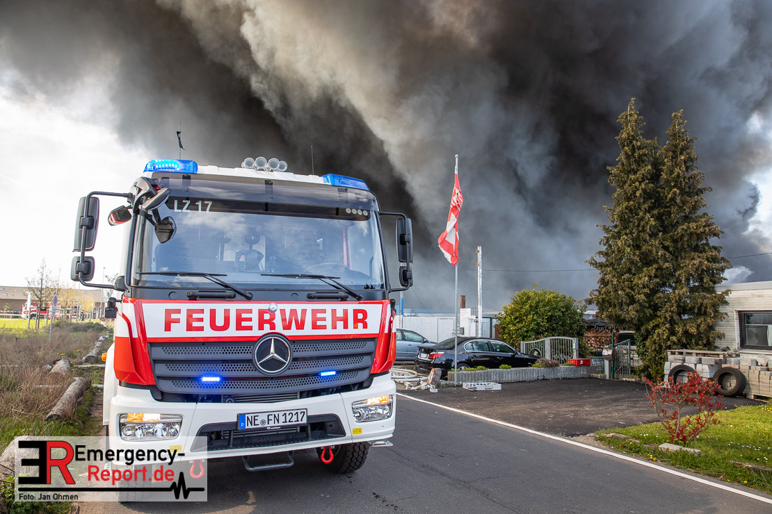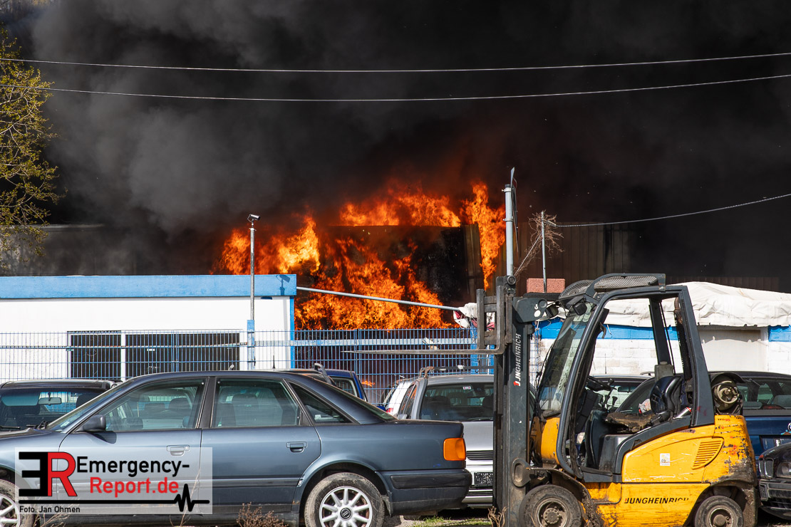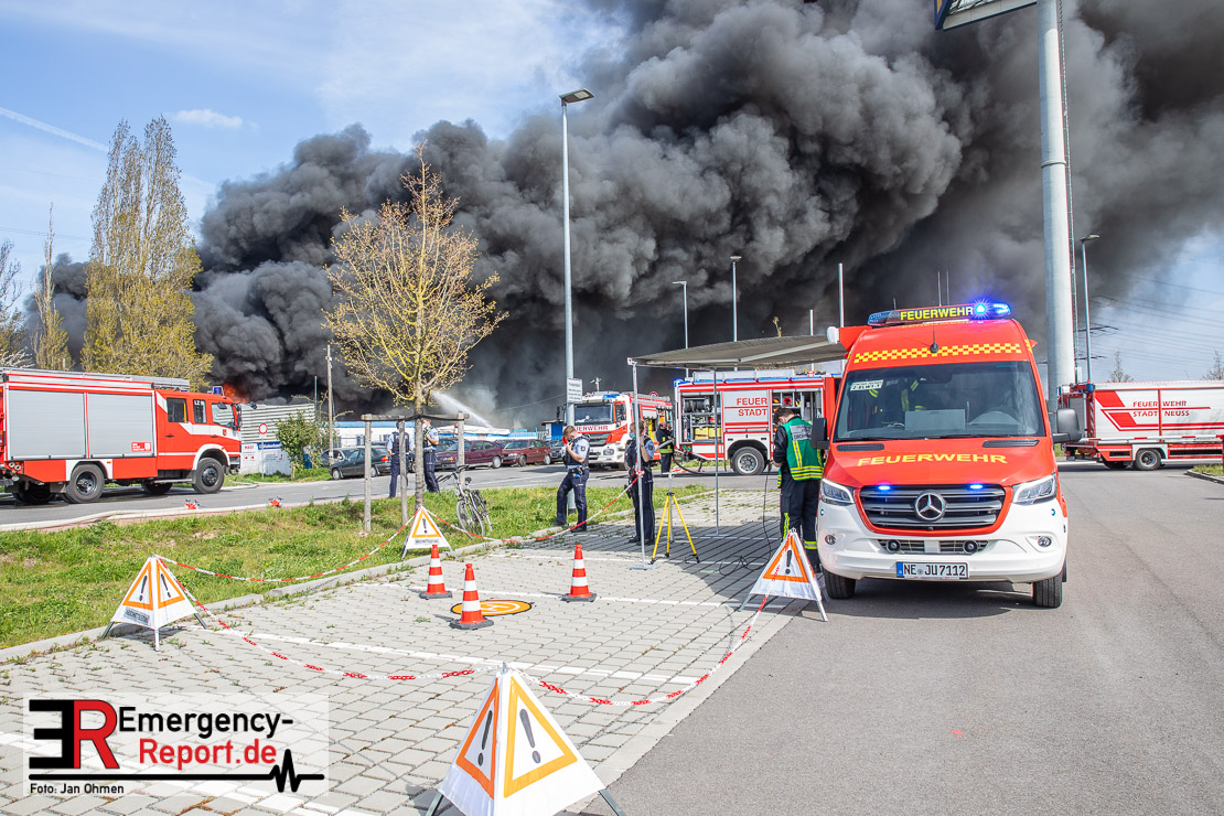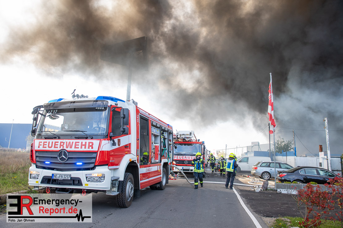 Das Feuer auf dem Schrottplatz begann um 14:26 Uhr am 22.04.2021 mit der Meldung „FEU_PKW“ und forderte im weiteren Verlauf die Feuerwehren aus dem Rhein-Kreis Neuss in vielerlei Hinsicht. So mussten in der Anfangszeit des Einsatzes mit etwa 180 Kräften vor Ort eine Ausbreitung auf weitere Teile des Schrottplatzes verhindert werden. Das Feuer breitete sich rasant aus, da die auf dem Schrottplatz gelagerten Autowracks, Autoteile, Reifen sowie Wohn- und Arbeitscontainer eine optimale Grundlage für das Feuer boten.