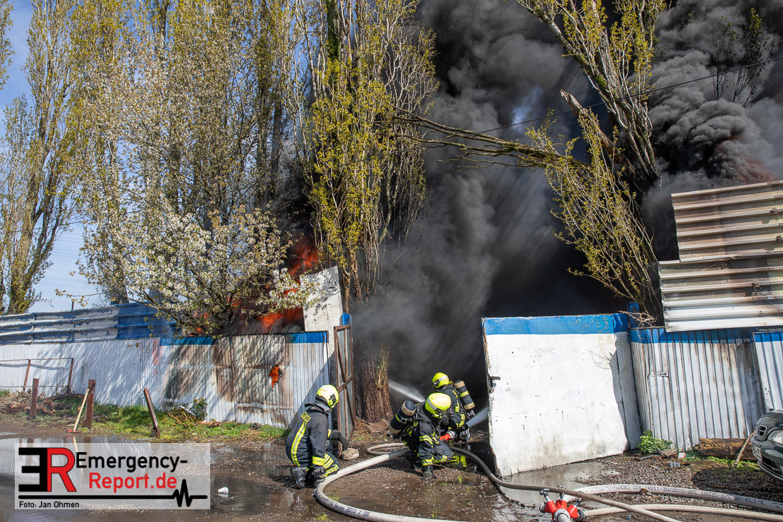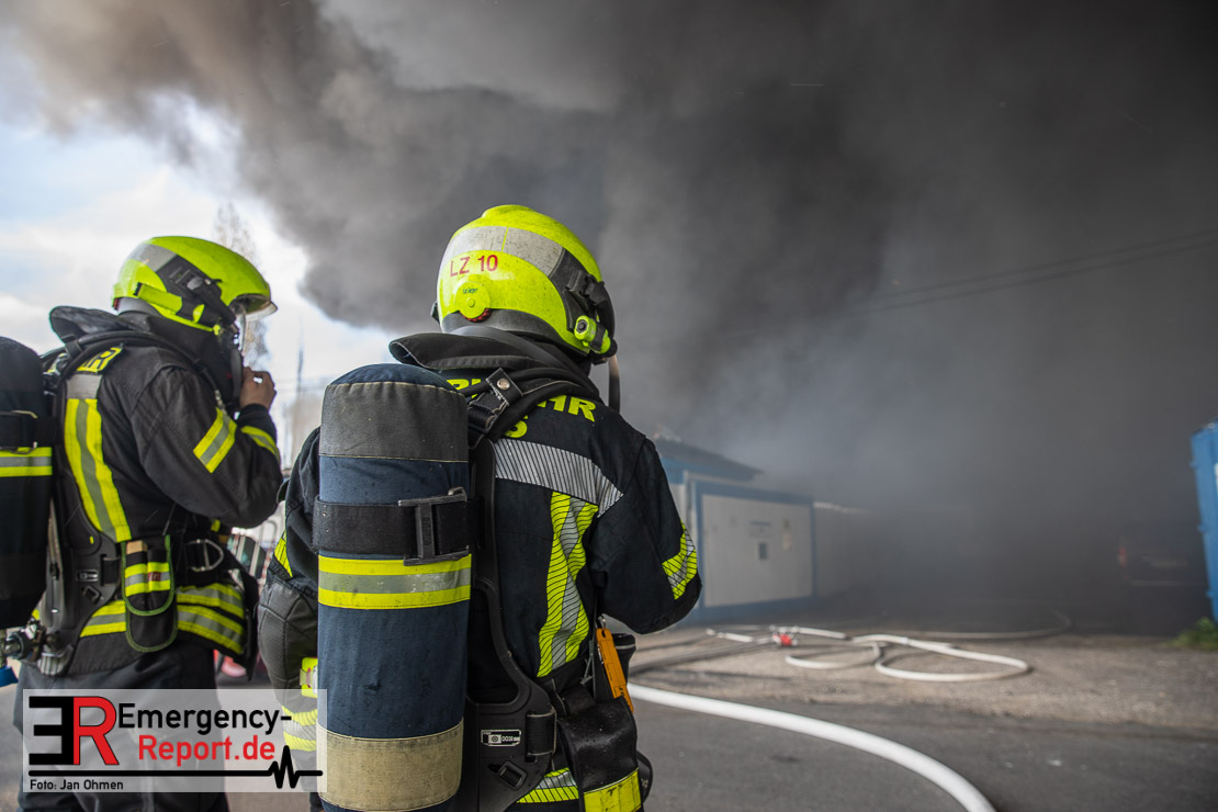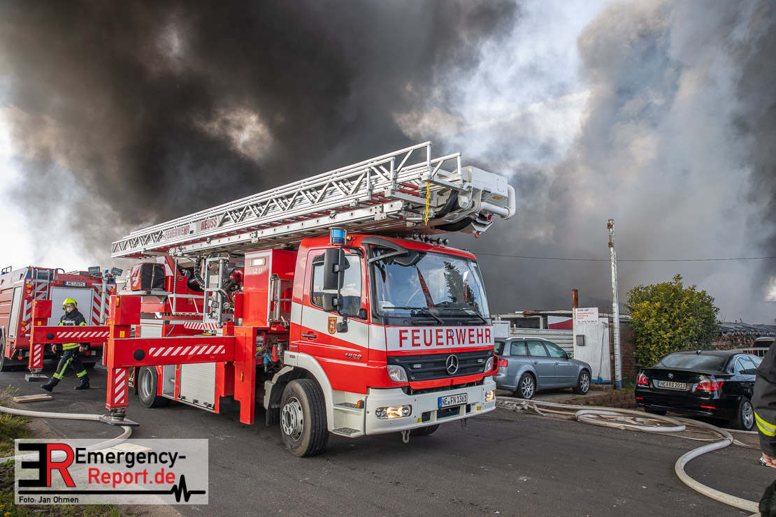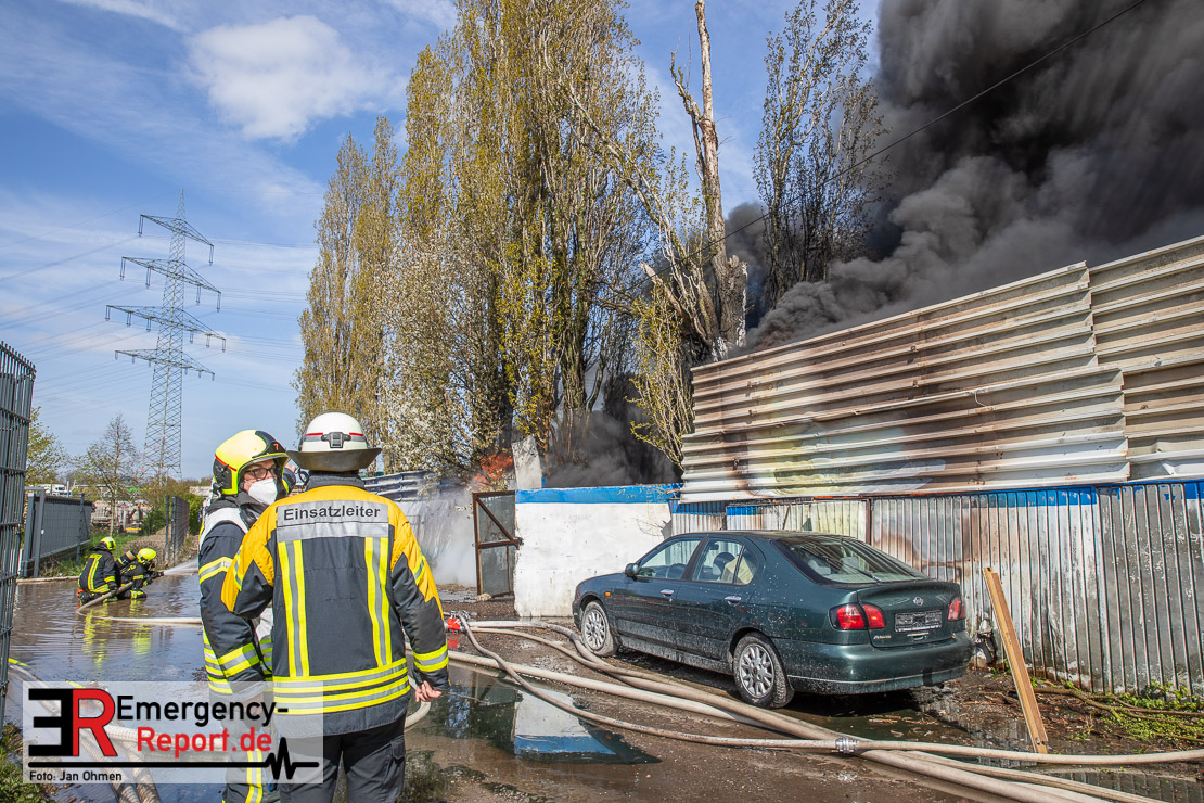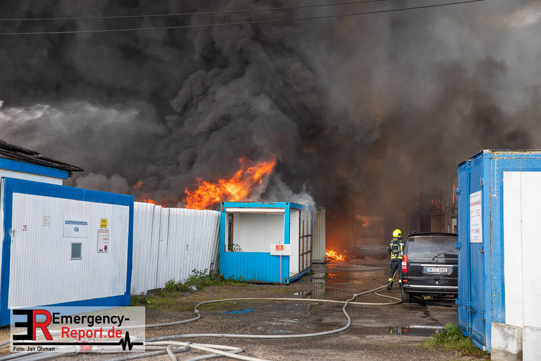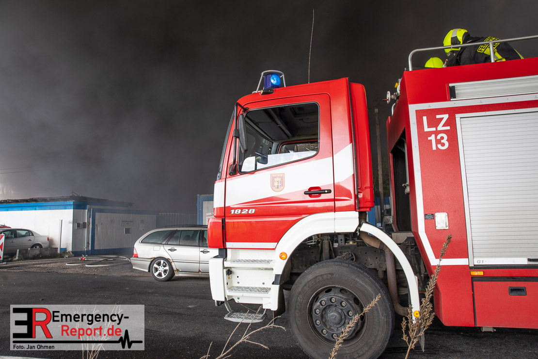 Folgemeldung 23:06 Uhr: Zur Stunde dauert der Einsatz auf dem Schrottplatz am Holzbüttgener Weg weiterhin an. Die Feuerwehr konnte den Vollbrand erfolgreich bekämpfen und ein anliegendes Wohnhaus, bei dem bereits die Garage in Brand geraten war, vor den Flammen schützen. Aktuell gehen Trupps unter schwerem Atemschutz auf dem Gelände vor und löschen einzelne verbliebene Brände ab. Diese Arbeiten werden vermutlich noch mehrere Stunden andauern. Das Technische Hilfswerk unterstützt diese Arbeiten mit schwerem Gerät und setzt hier einen Greifbagger und zwei Radlader zur Unterstützung der Feuerwehr ein.