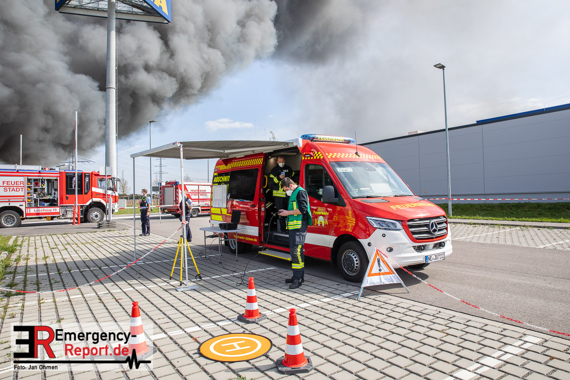 Dank dem massivem Kräfteansatz und dem Einsatz jedes Einzelnen konnte eine Ausbreitung auf ein Wohnhaus sowie weitere Teile des Schrottplatzes verhindert werden. Eine Herausforderung stellte die Löschwasserversorgung vor Ort dar, da der Wasserverbrauch von etwa 10.000 Litern Wasser pro Minute das Leitungsnetz überforderte. Zur Abhilfe unterstützte uns temporär ein in direkter Nachbarschaft liegendes „blaues Möbelhaus“ mit Wasser aus ihrer Löschanlage. Doch waren auch diese Ressourcen in Form von etwa 400 Kubikmetern Löschwasser nach einiger Zeit aufgebraucht. Sie halfen aber dabei, Zeit zu gewinnen und parallel eine weitere Löschwasserversorgung über das Hydranten-Netz aufzubauen.
