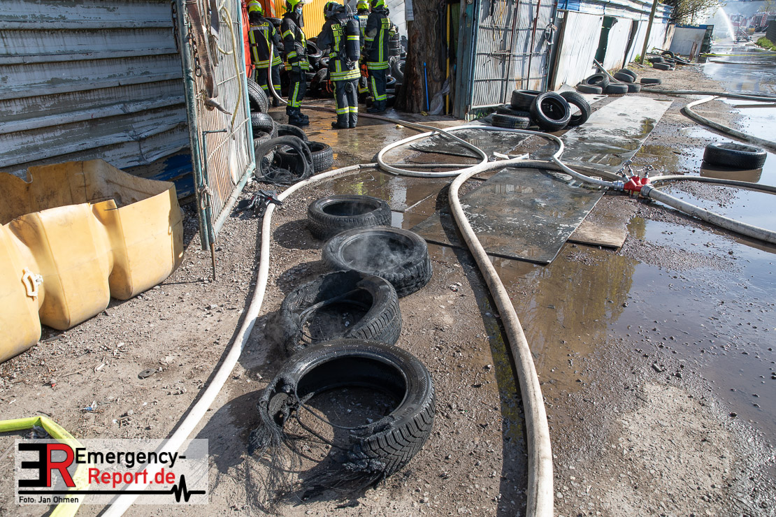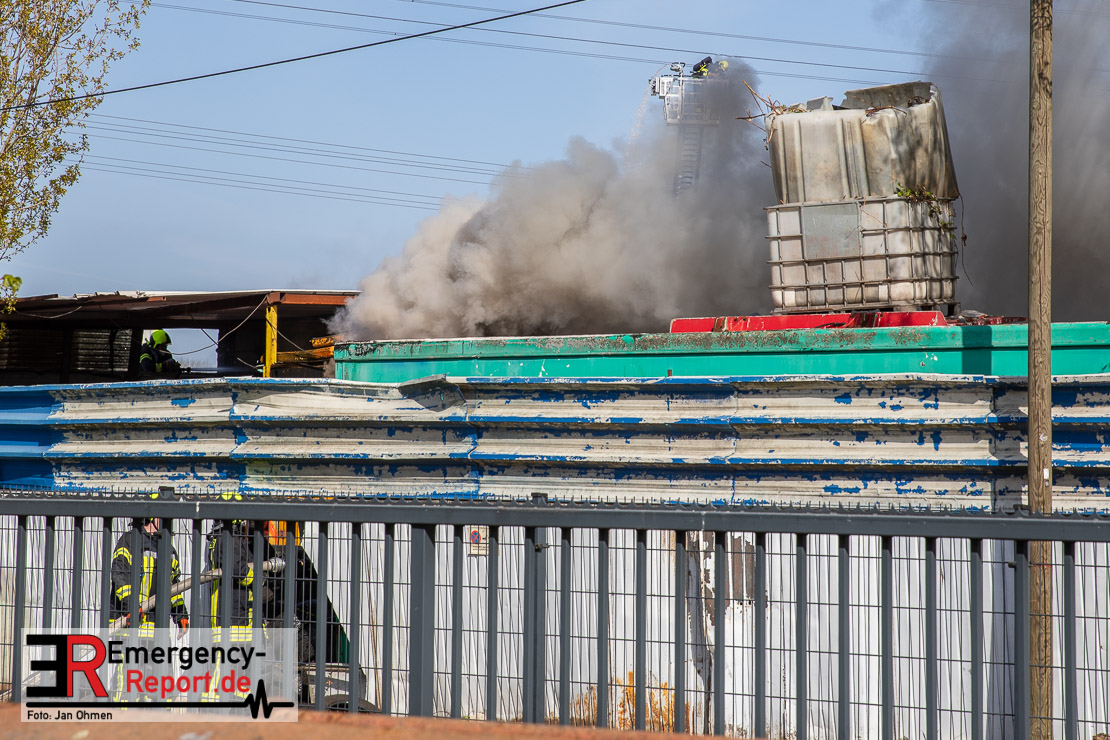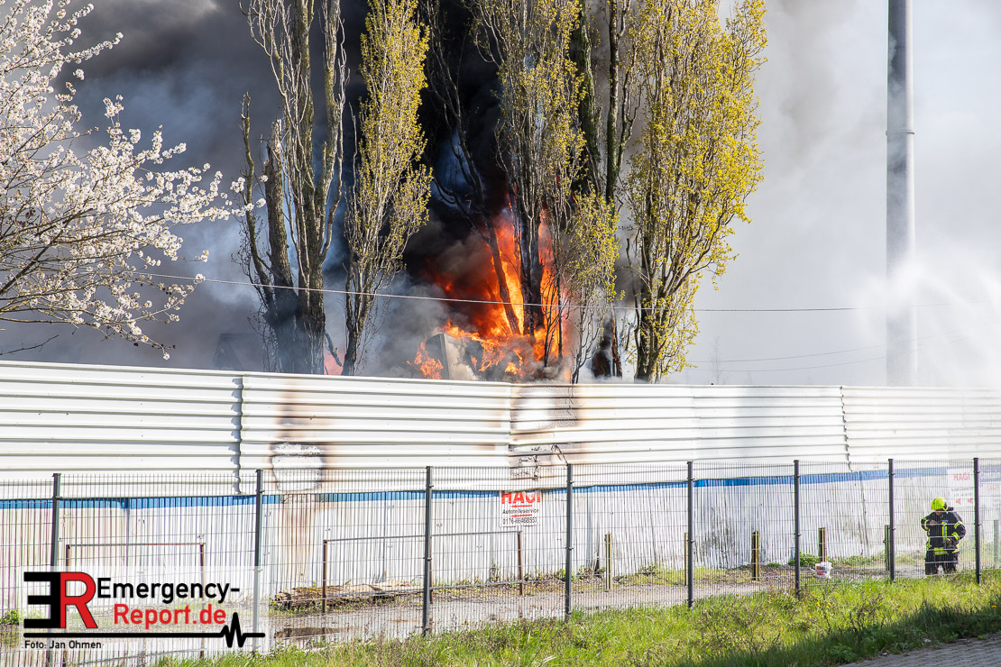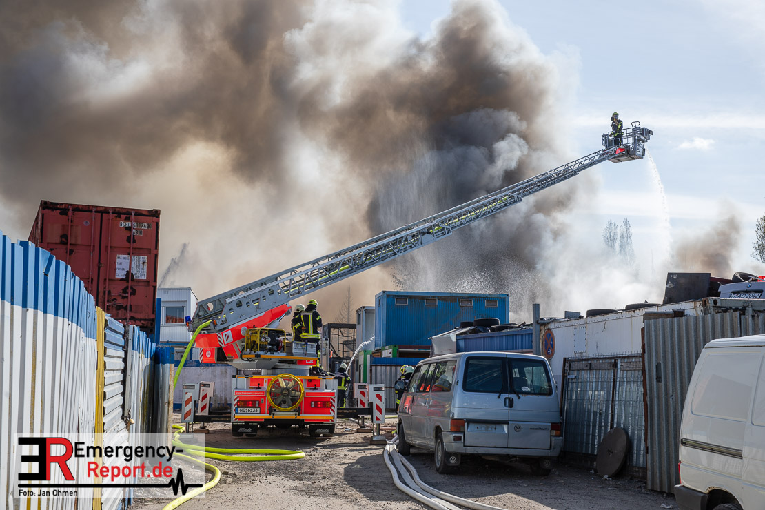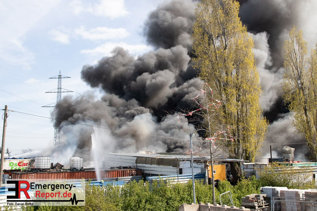 Es brennt aktuell auf einer Fläche von 120x100m. Trotz Riegelstellungen und massivem Einsatz von Kräften sowie mehreren Drehleitern und Wasserwerfern ist der Brand schwer unter Kontrolle zu halten. Das Feuer wird mit allen verfügbaren Kräften auf den Bereich des Schrottplatzes begrenzt. Weiterhin ist es gelungen, ein am Schrottplatz gelegenes Wohnhaus zu schützen.