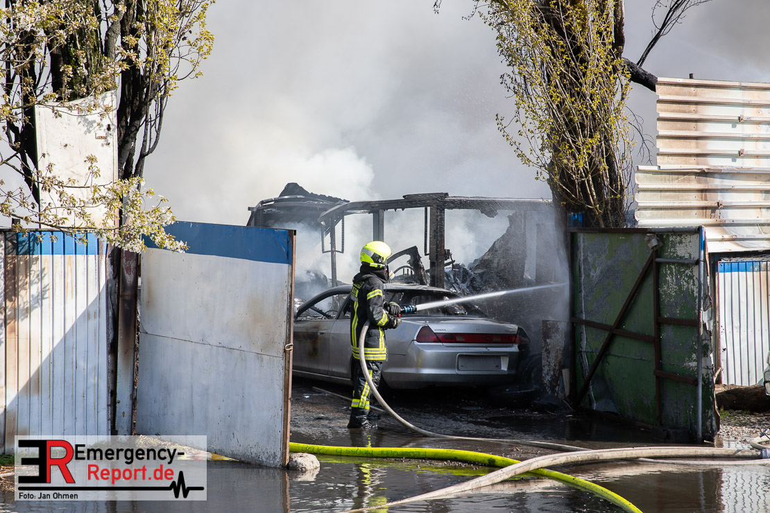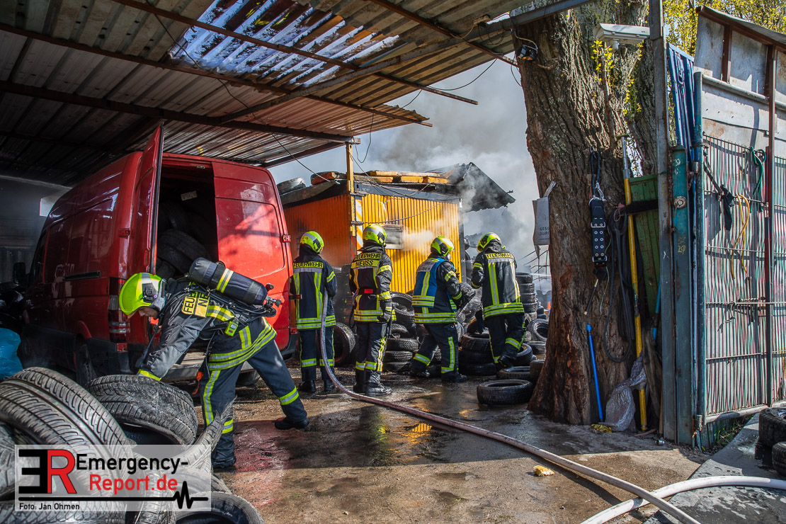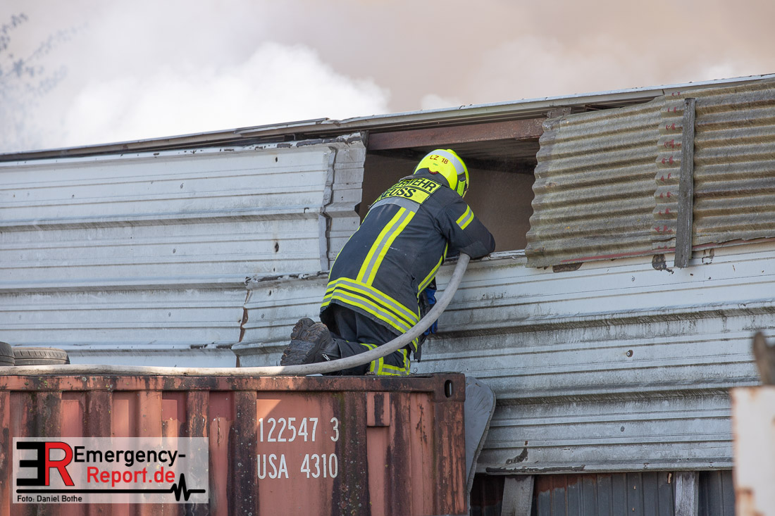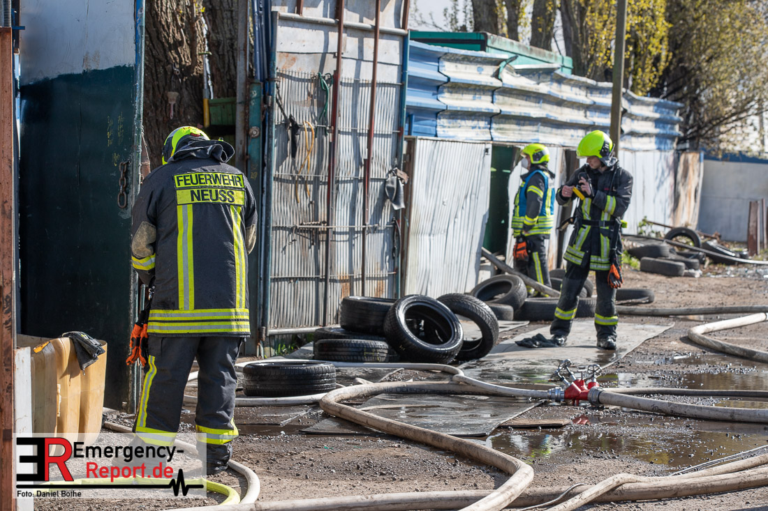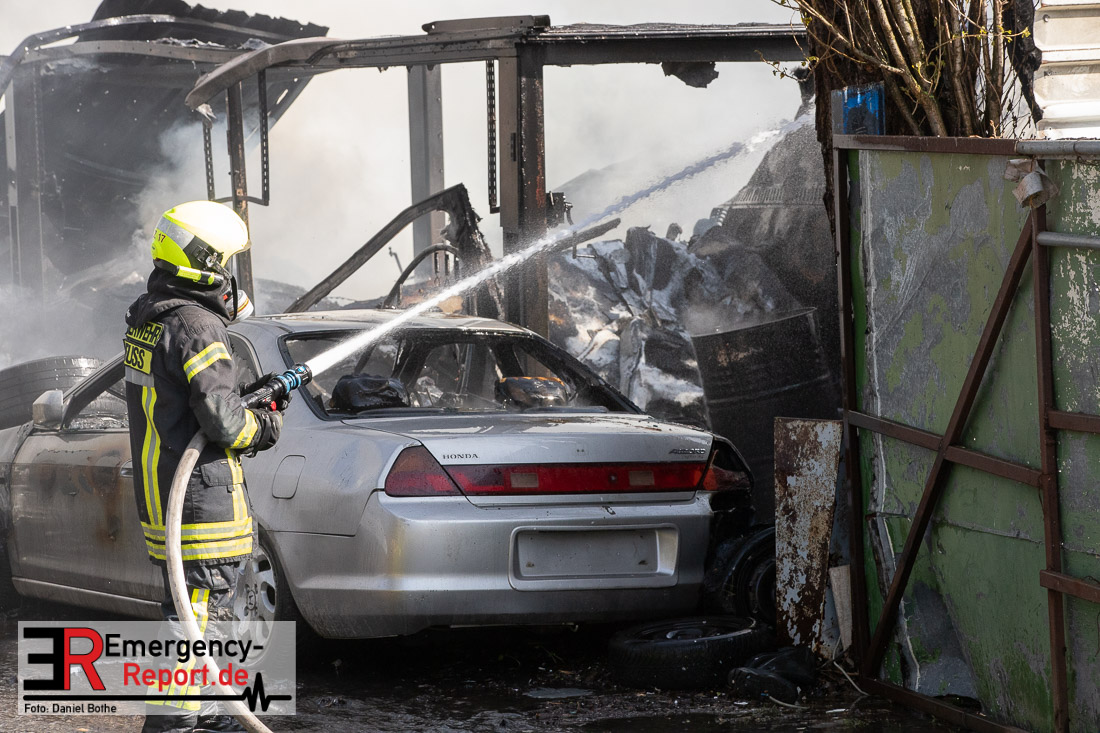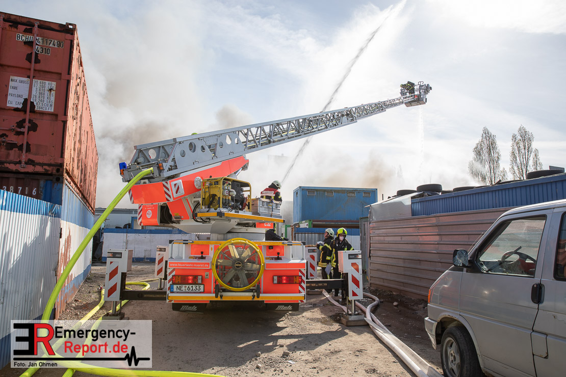 Folgemeldung 23:06 Uhr: Zur Stunde dauert der Einsatz auf dem Schrottplatz am Holzbüttgener Weg weiterhin an. Die Feuerwehr konnte den Vollbrand erfolgreich bekämpfen und ein anliegendes Wohnhaus, bei dem bereits die Garage in Brand geraten war, vor den Flammen schützen. Aktuell gehen Trupps unter schwerem Atemschutz auf dem Gelände vor und löschen einzelne verbliebene Brände ab. Diese Arbeiten werden vermutlich noch mehrere Stunden andauern. Das Technische Hilfswerk unterstützt diese Arbeiten mit schwerem Gerät und setzt hier einen Greifbagger und zwei Radlader zur Unterstützung der Feuerwehr ein.