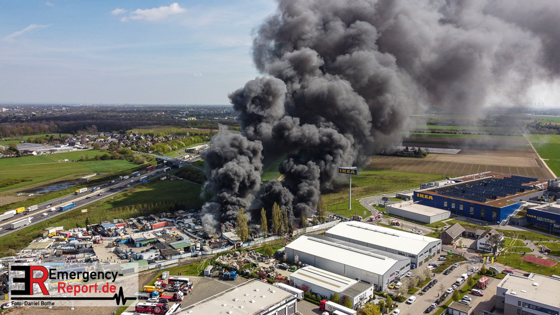 Erstmeldung 17:52 Uhr: Bedingt durch einen Brand auf einem Schrottplatz am Holzbüttgener Weg an der Stadtgrenze zu Kaarst kam es gegen 14:30 Uhr (22.04.2021) zu einer massiven Rauchentwicklung, die weit über die Stadtgrenzen zu sehen war.