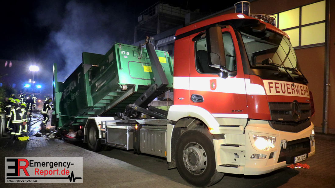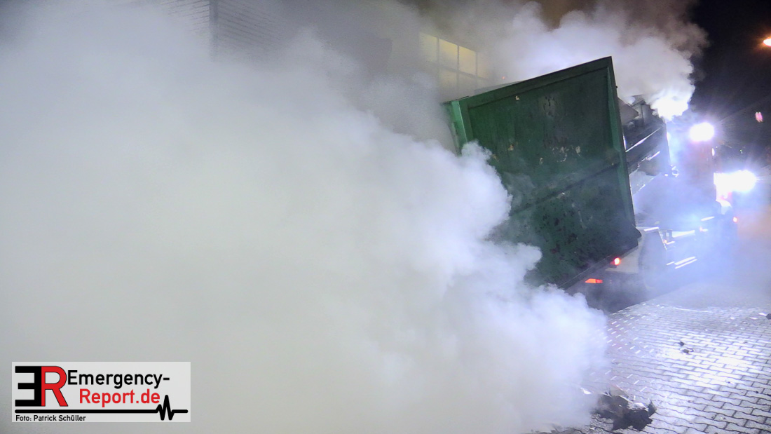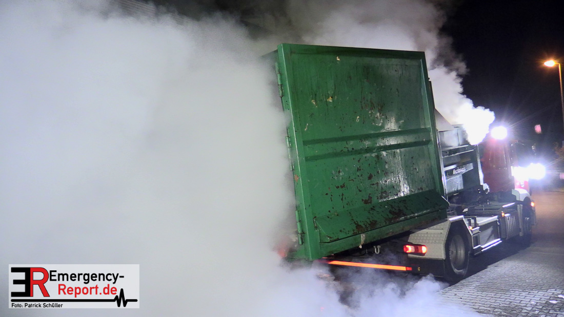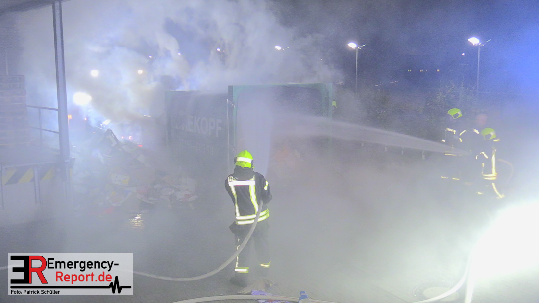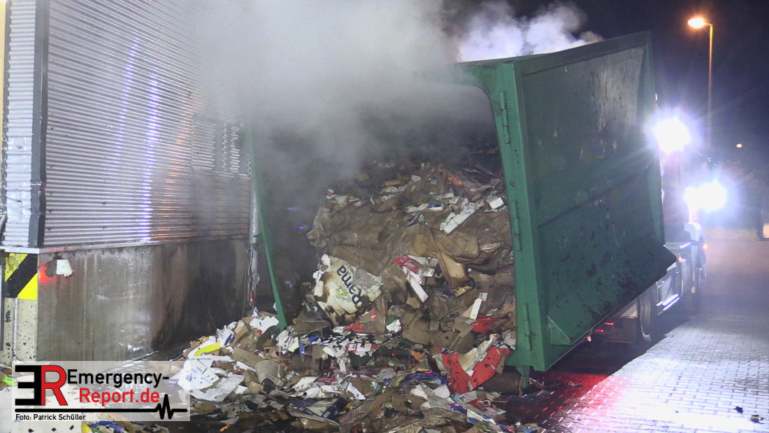 Der Container wurde durch das Wechselladerfahrzeug ausgekippt, anschließend wurde das brennende Altpapier auseinander gezogen und abgelöscht.