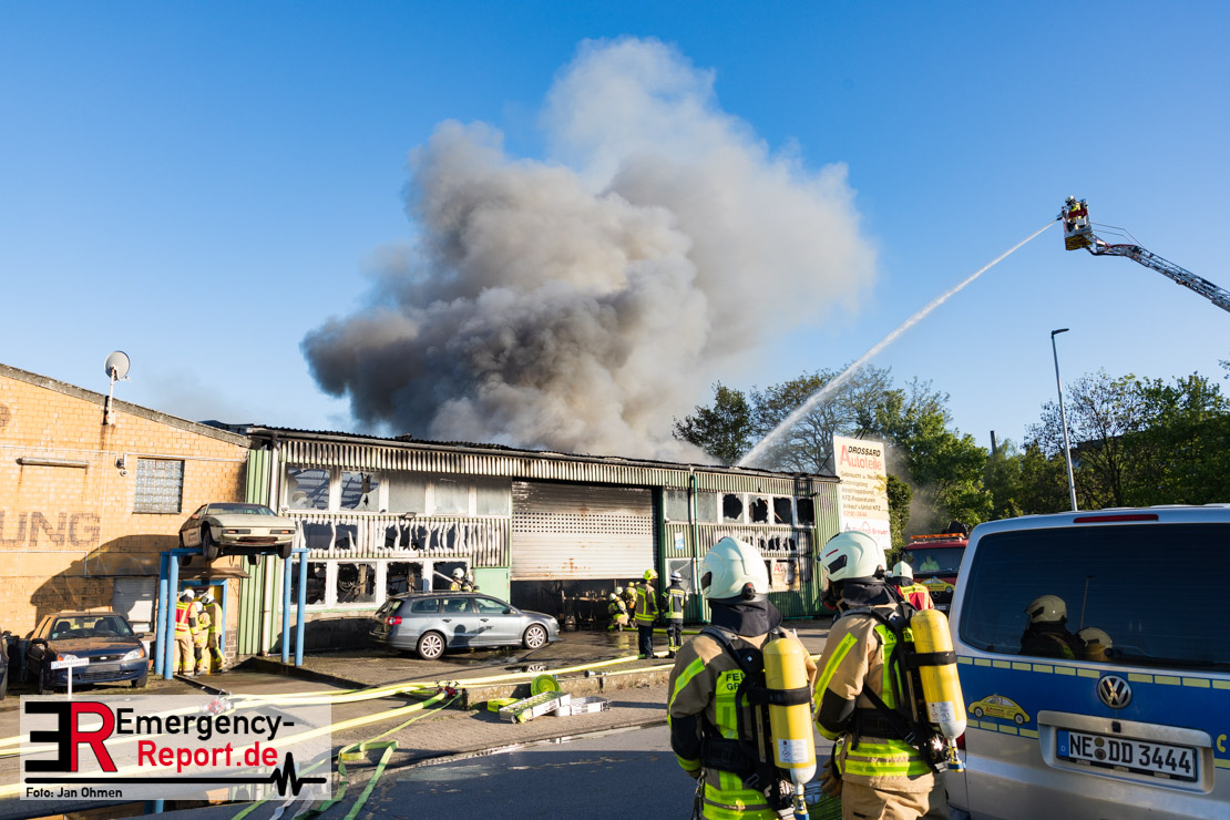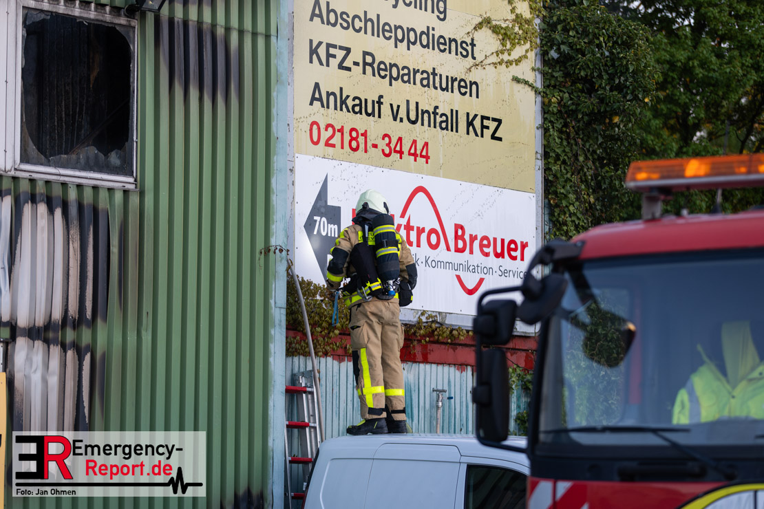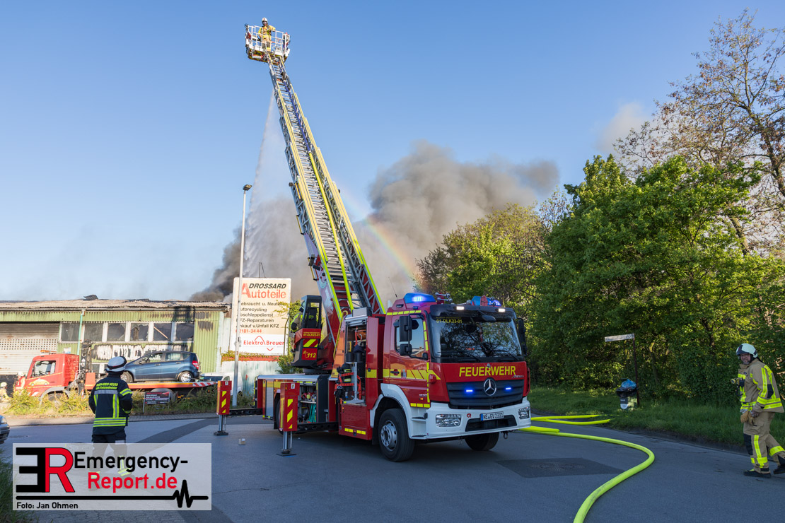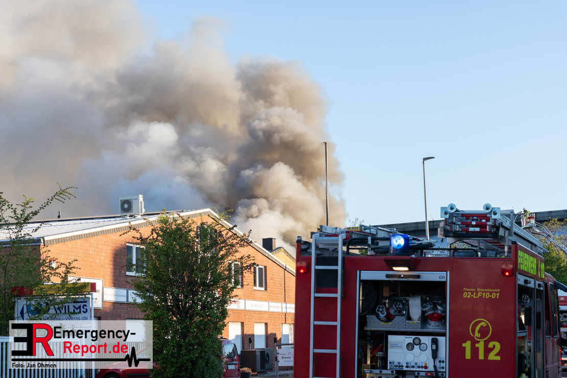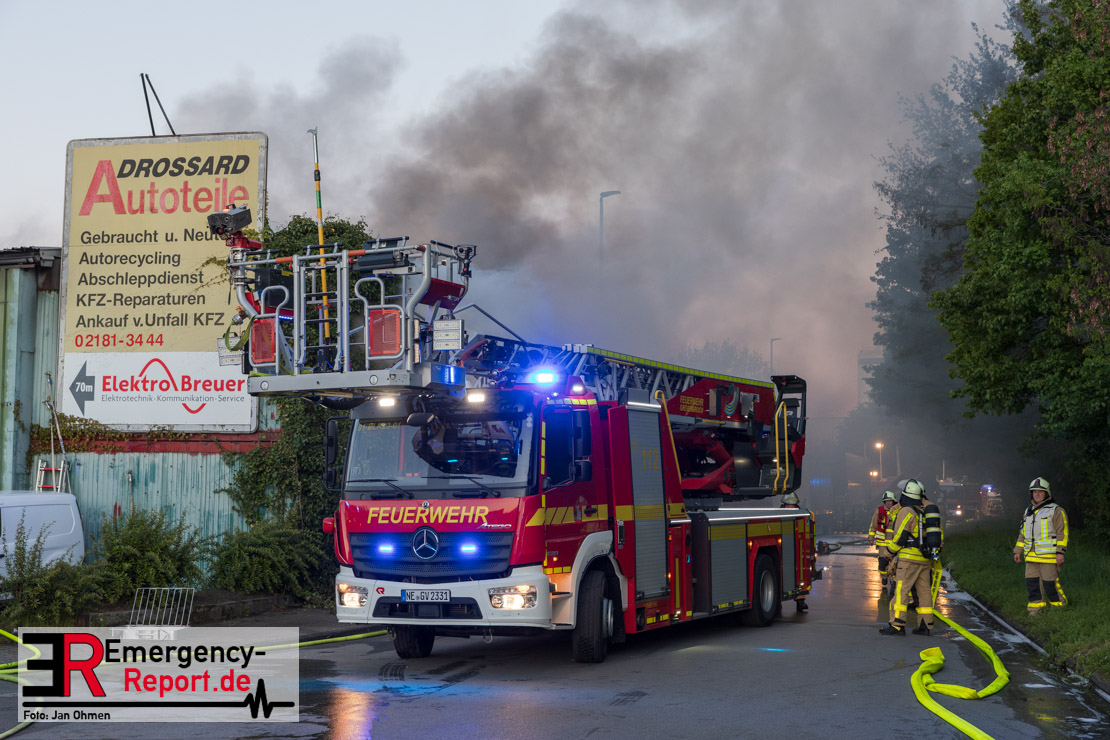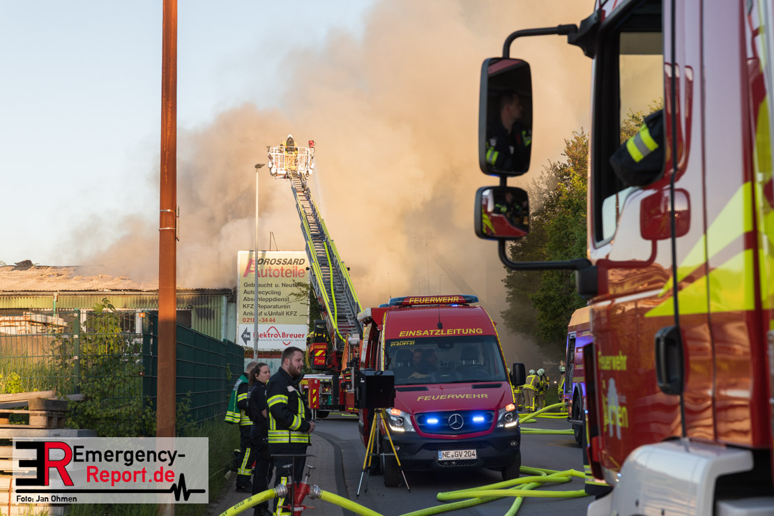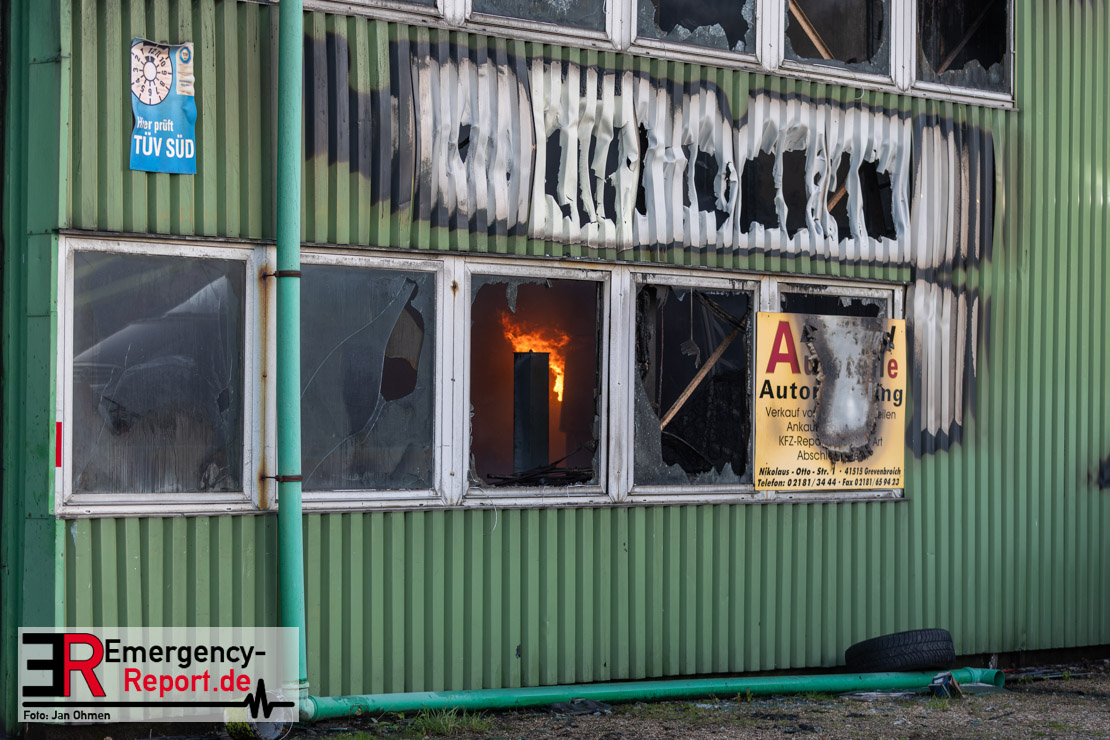 Grevenbroich (ots) – Beim mehrstündigen Großbrand im Industriegebiet Ost in Grevenbroich wurden am Dienstagabend (23.04.2026) Betriebsgebäude und Werkstatt eines Autoteilehandels an der Nikolaus-Otto-Straße vollständig zerstört. Ein Übergreifen des Feuers auf den direkt angrenzenden Schrottplatz des Betriebes sowie auf benachbarte Gebäude konnte die Feuerwehr durch einen massiven, mehrstündigen Löschangriff verhindern. Durch den Brand, der gegen 18:30 Uhr ausgebrochen war, wurde ein Beschäftigter des Betriebes leicht durch Rauchgase verletzt. Ein Transport ins Krankenhaus war aber nicht erforderlich.