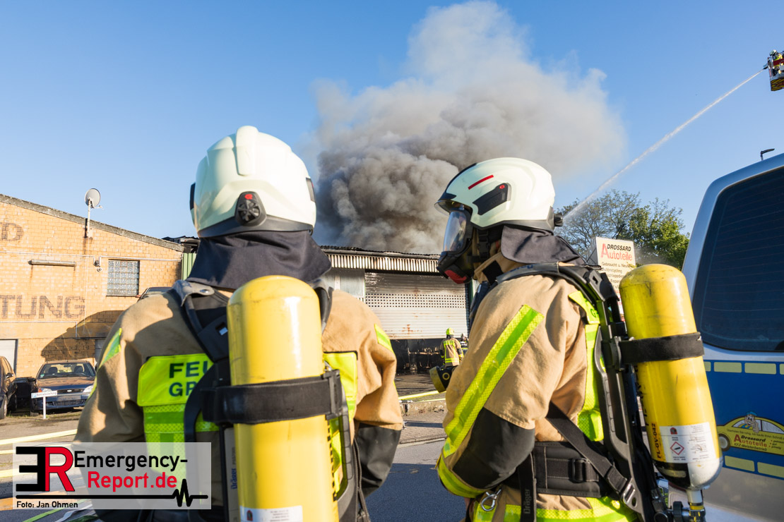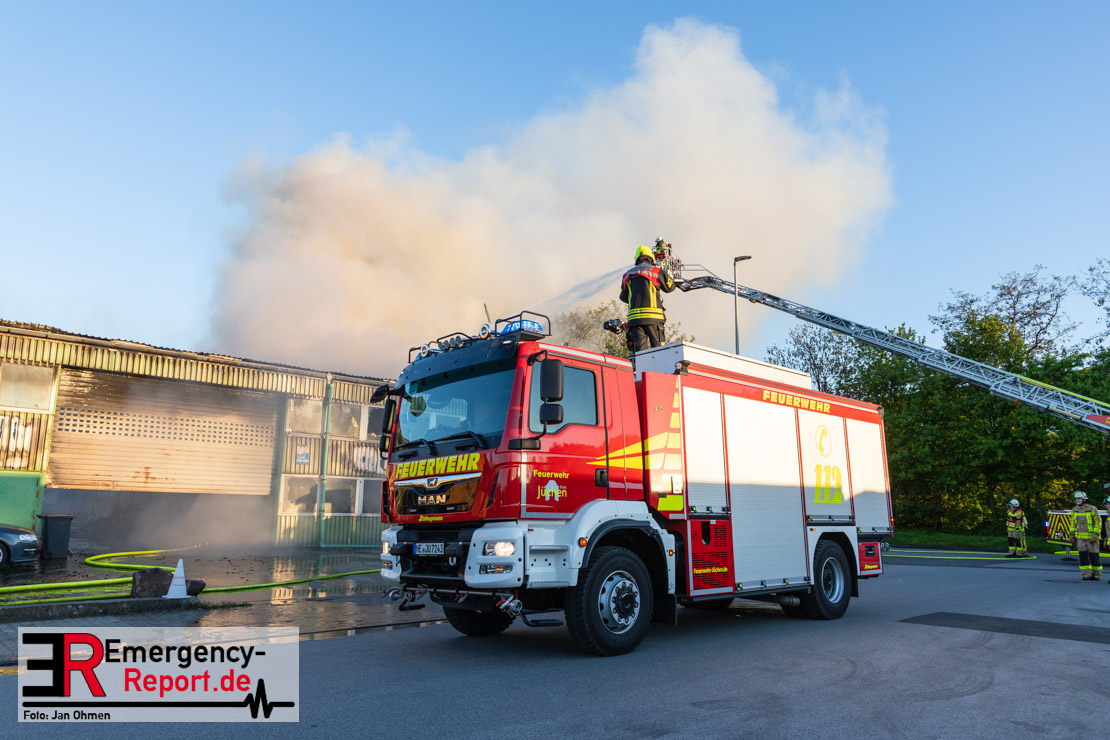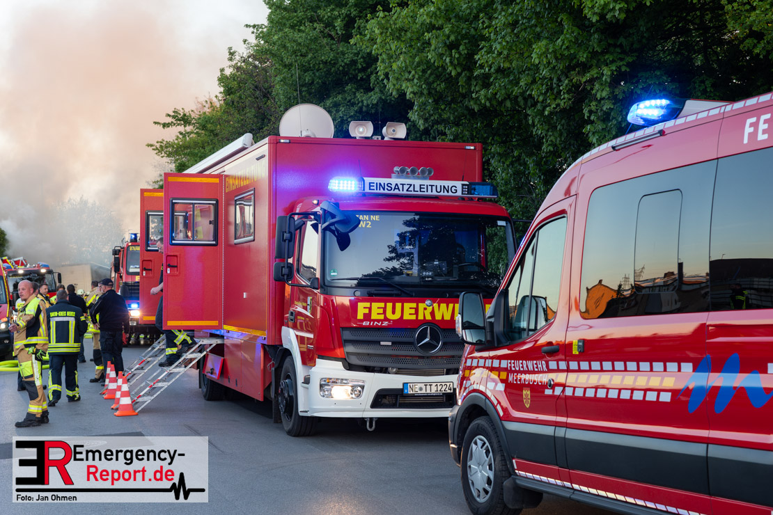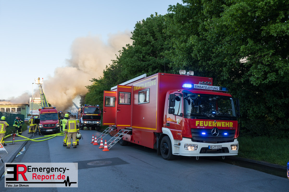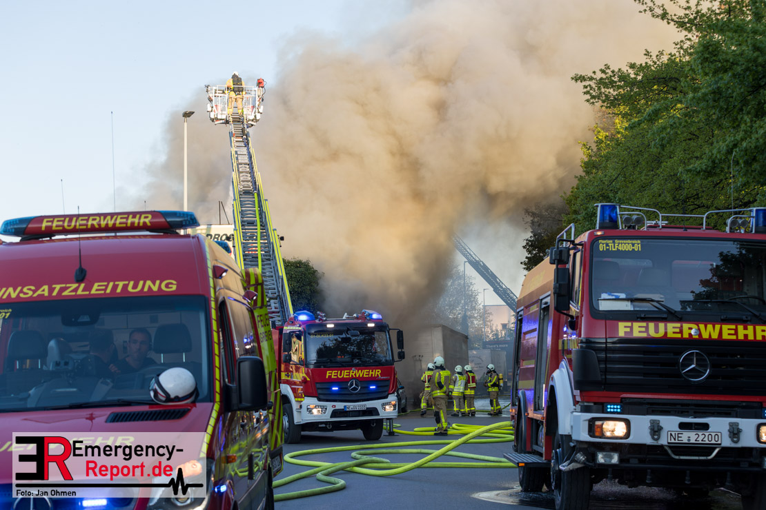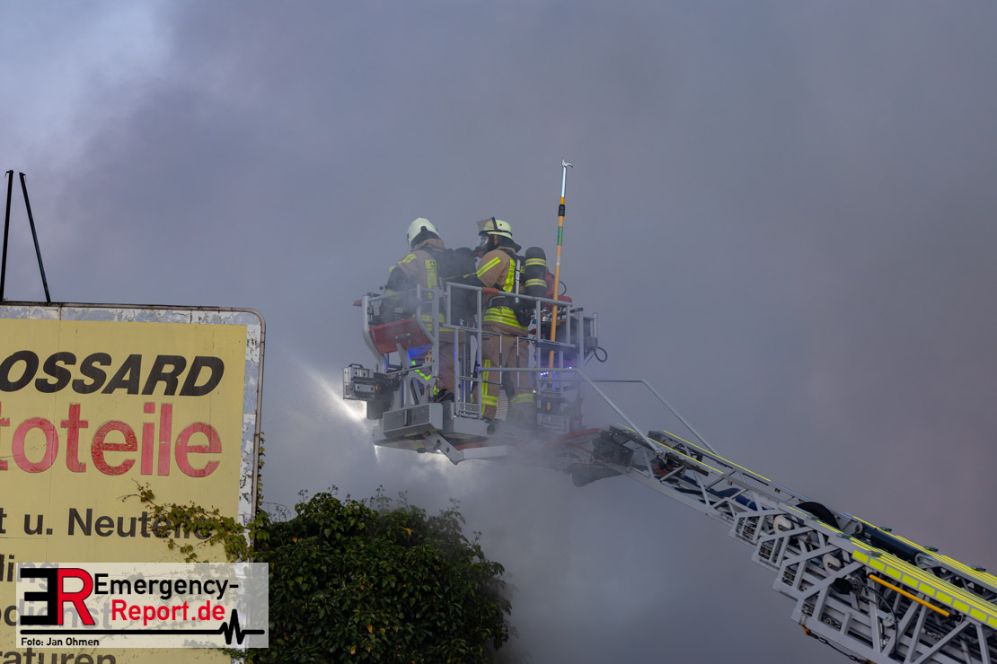 Grevenbroich (ots) – Beim mehrstündigen Großbrand im Industriegebiet Ost in Grevenbroich wurden am Dienstagabend (23.04.2026) Betriebsgebäude und Werkstatt eines Autoteilehandels an der Nikolaus-Otto-Straße vollständig zerstört. Ein Übergreifen des Feuers auf den direkt angrenzenden Schrottplatz des Betriebes sowie auf benachbarte Gebäude konnte die Feuerwehr durch einen massiven, mehrstündigen Löschangriff verhindern. Durch den Brand, der gegen 18:30 Uhr ausgebrochen war, wurde ein Beschäftigter des Betriebes leicht durch Rauchgase verletzt. Ein Transport ins Krankenhaus war aber nicht erforderlich.