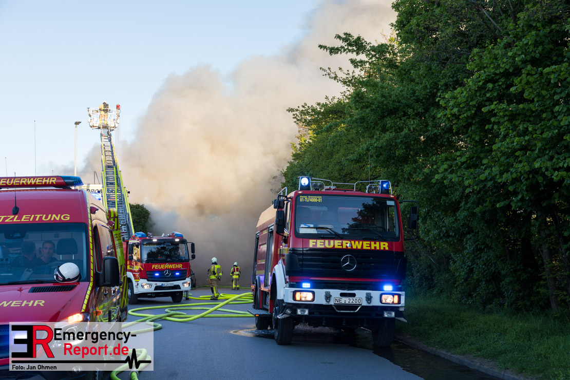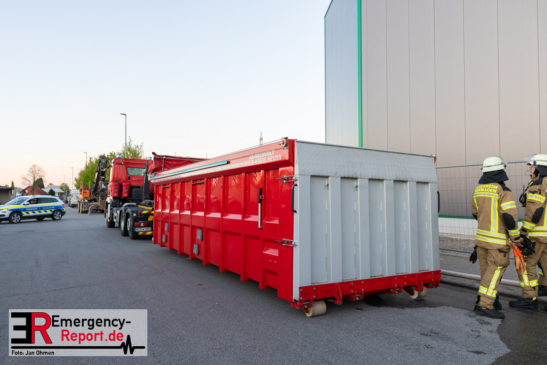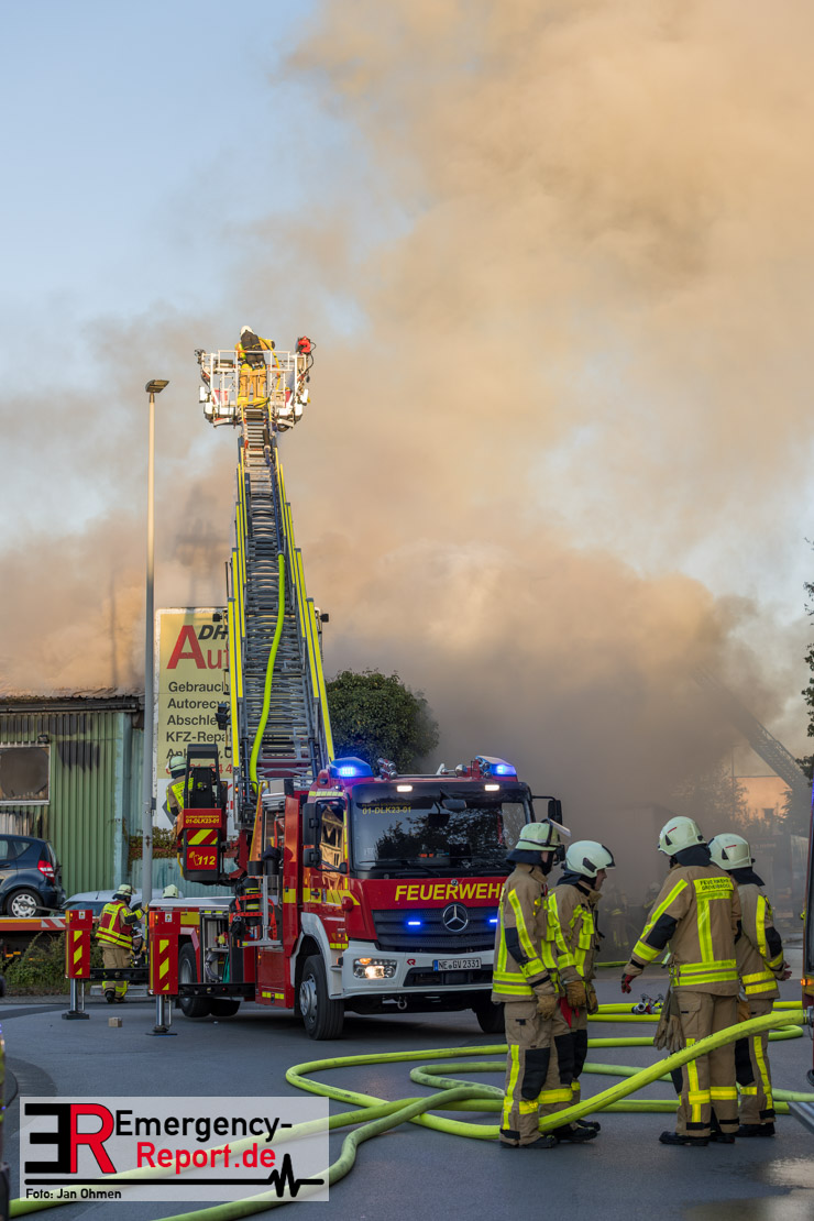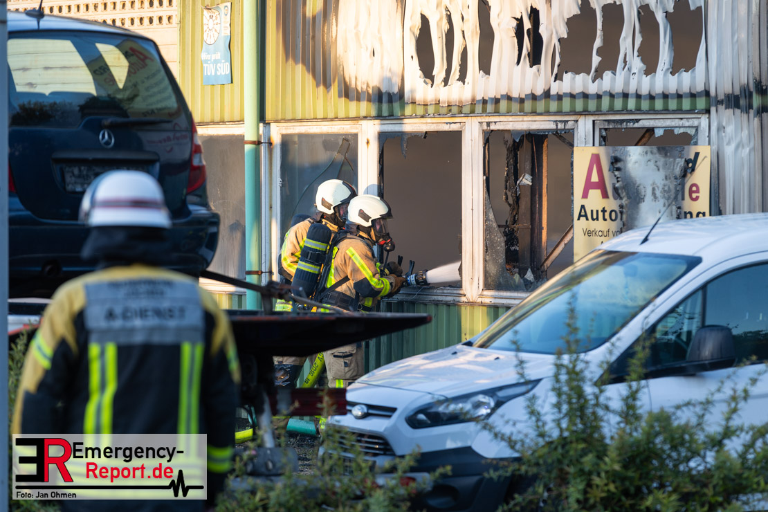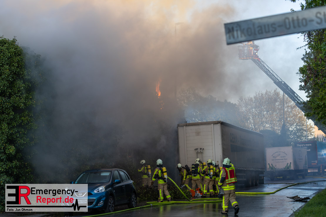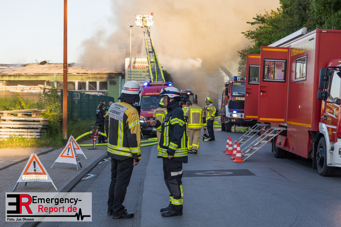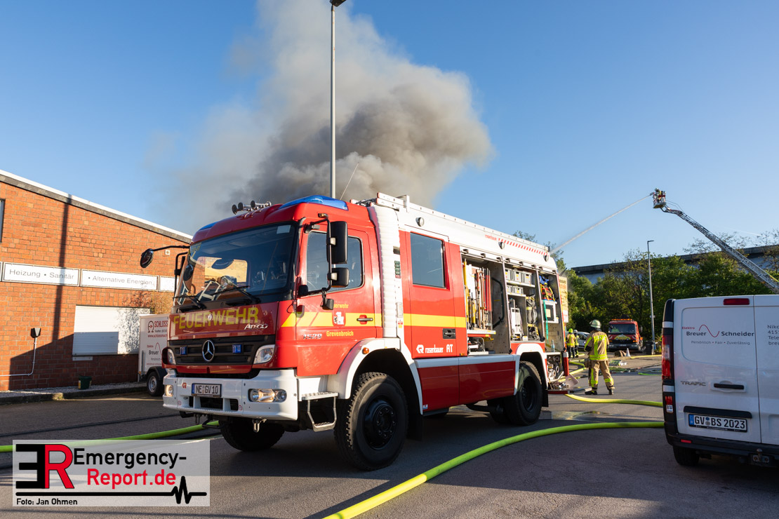 Grevenbroich (ots) – Beim mehrstündigen Großbrand im Industriegebiet Ost in Grevenbroich wurden am Dienstagabend (23.04.2026) Betriebsgebäude und Werkstatt eines Autoteilehandels an der Nikolaus-Otto-Straße vollständig zerstört. Ein Übergreifen des Feuers auf den direkt angrenzenden Schrottplatz des Betriebes sowie auf benachbarte Gebäude konnte die Feuerwehr durch einen massiven, mehrstündigen Löschangriff verhindern. Durch den Brand, der gegen 18:30 Uhr ausgebrochen war, wurde ein Beschäftigter des Betriebes leicht durch Rauchgase verletzt. Ein Transport ins Krankenhaus war aber nicht erforderlich.