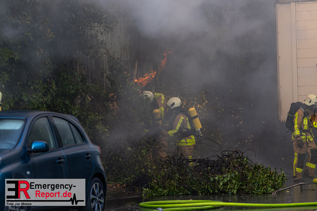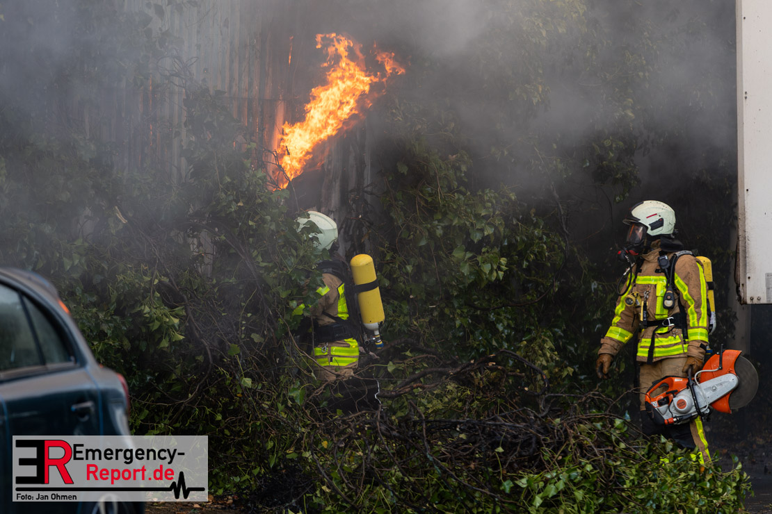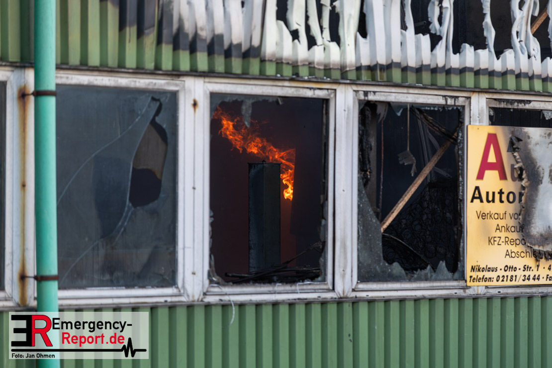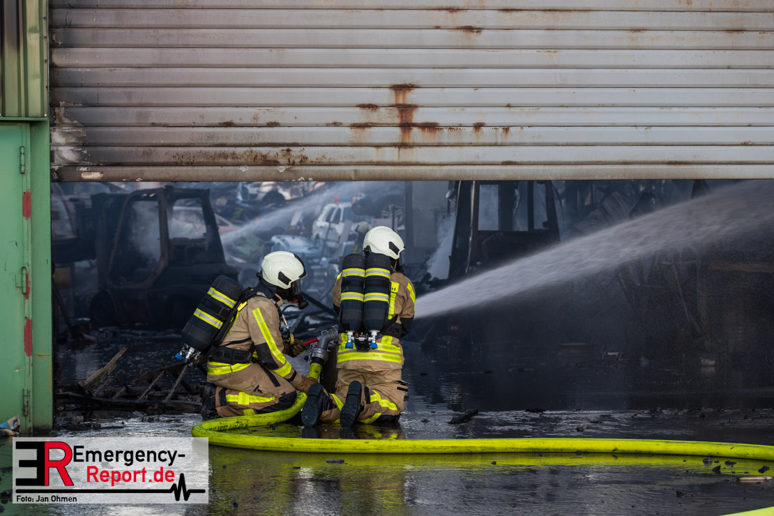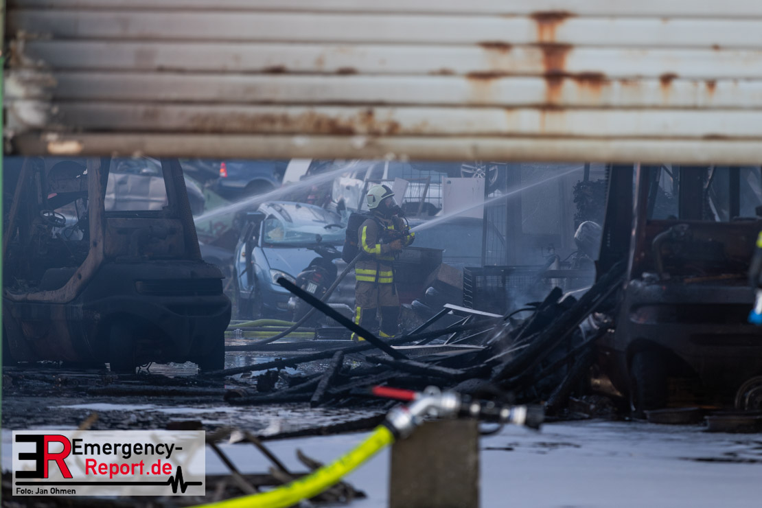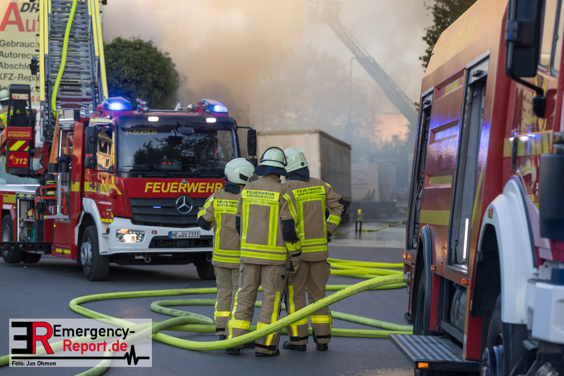 Während Betriebsgebäude, Lager und Werkstatt durch den Brand vollständig zerstört wurden, konnte die Grevenbroicher Feuerwehr, unterstützt durch Kräfte der Feuerwehren aus Jüchen und Dormagen, die anfänglich drohende Ausbreitung des Feuers auf einen zum Betrieb gehörenden, direkt angrenzenden Schrottplatz verhindern.
