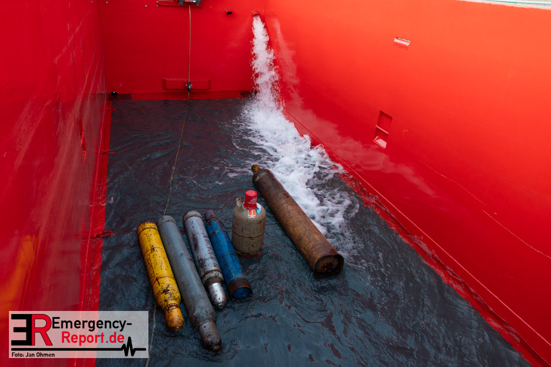 Besonders zu Beginn der Brandbekämpfung stellten die zahlreichen im Gebäude befindlichen Gasflaschen eine besondere Gefahr für die Rettungskräfte dar. Soweit möglich brachten die Wehrleute die Druckgasflaschen in Sicherheit oder kühlten sie, um Explosionen zu verhindern. Bis in den späten Abend wurden glücklicherweise keine Einsatzkräfte verletzt.
