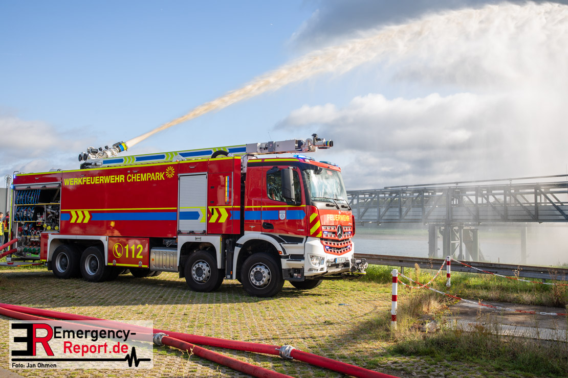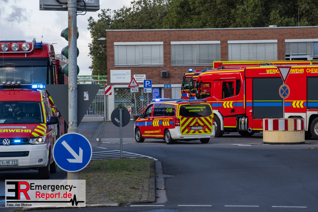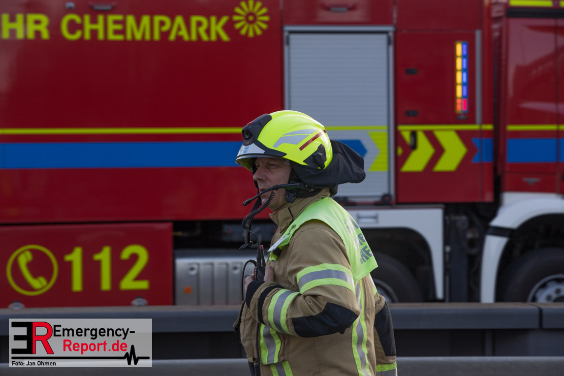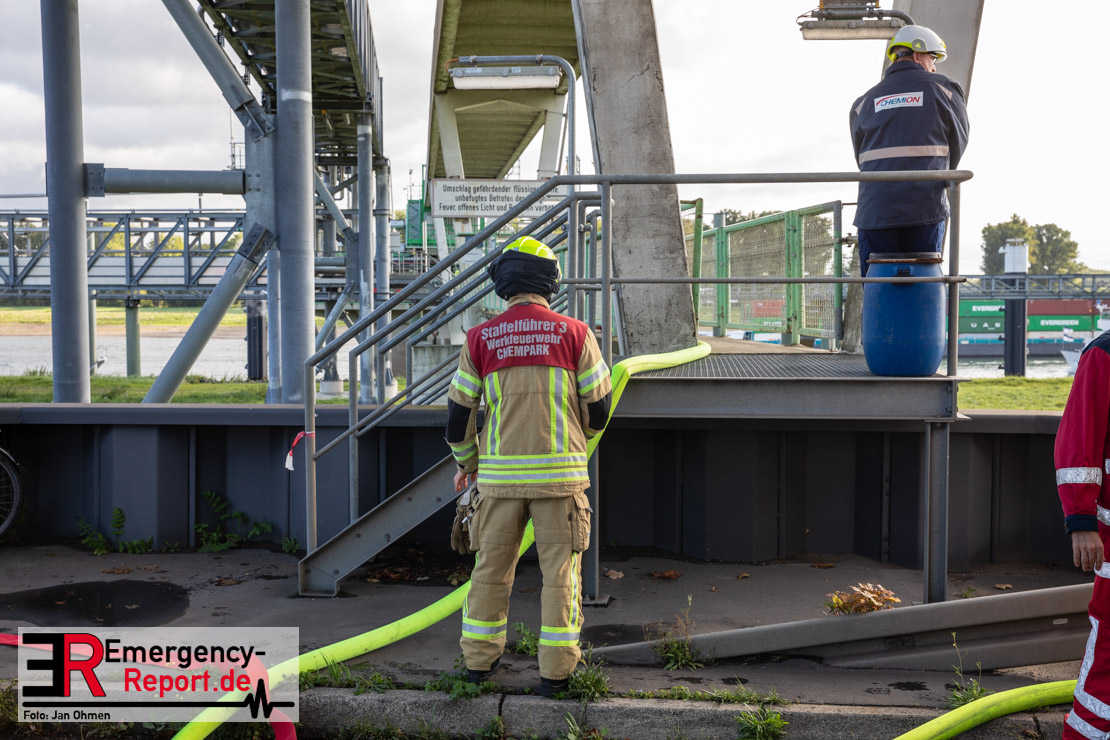 Am Morgen des 23.09.2023 führte die Werkfeuerwehr Chempark, am Standort Dormagen, eine Einsatzübung durch. Simuliert wurde ein Brand, an einer Tankerbrücke, der bei Wartungsarbeiten ausgebrochen ist. Eine Person wurde durch die Einsatzkräfte, von der Tankerbrücke, gerettet und an den Rettungsdienst übergeben. Während der Einsatzübung war die B9 für die Verkehr gesperrt.