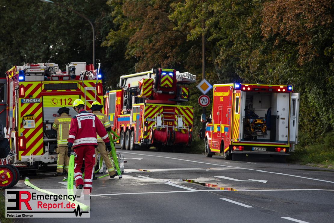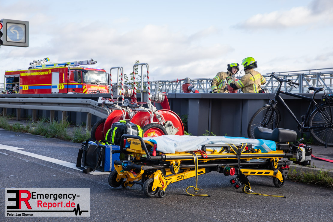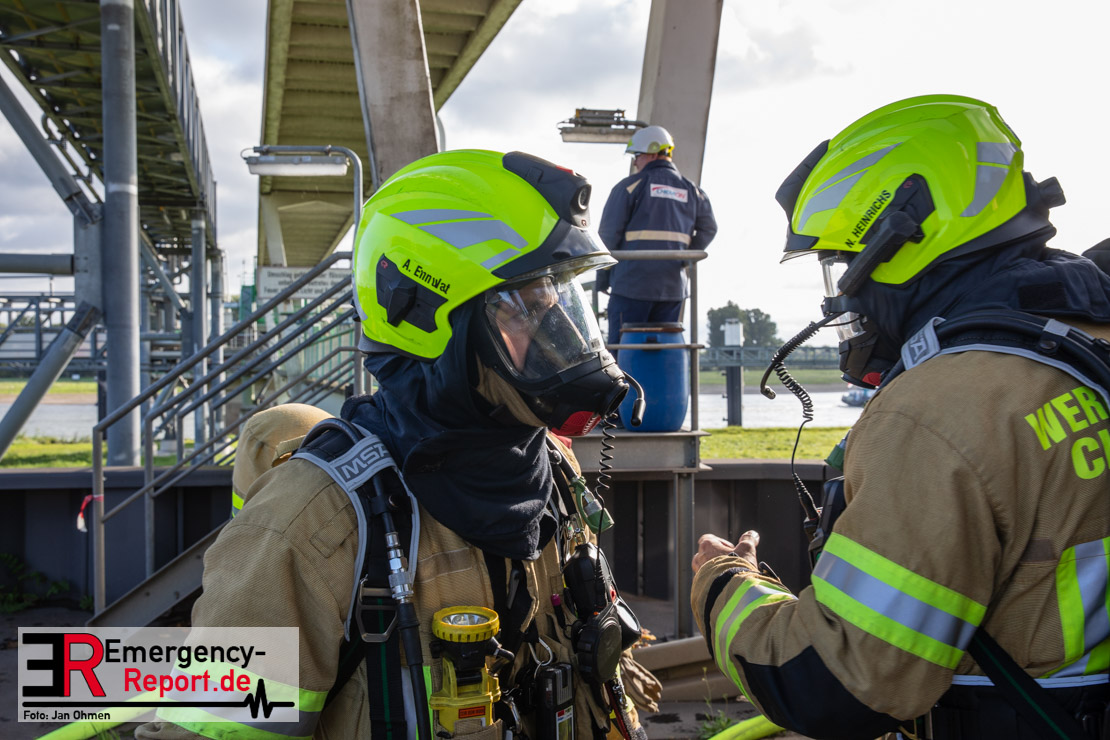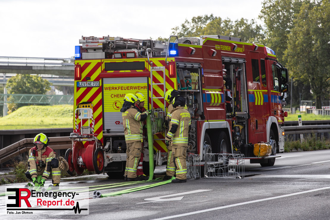 Am Morgen des 23.09.2023 führte die Werkfeuerwehr Chempark, am Standort Dormagen, eine Einsatzübung durch. Simuliert wurde ein Brand, an einer Tankerbrücke, der bei Wartungsarbeiten ausgebrochen ist. Eine Person wurde durch die Einsatzkräfte, von der Tankerbrücke, gerettet und an den Rettungsdienst übergeben. Während der Einsatzübung war die B9 für die Verkehr gesperrt.