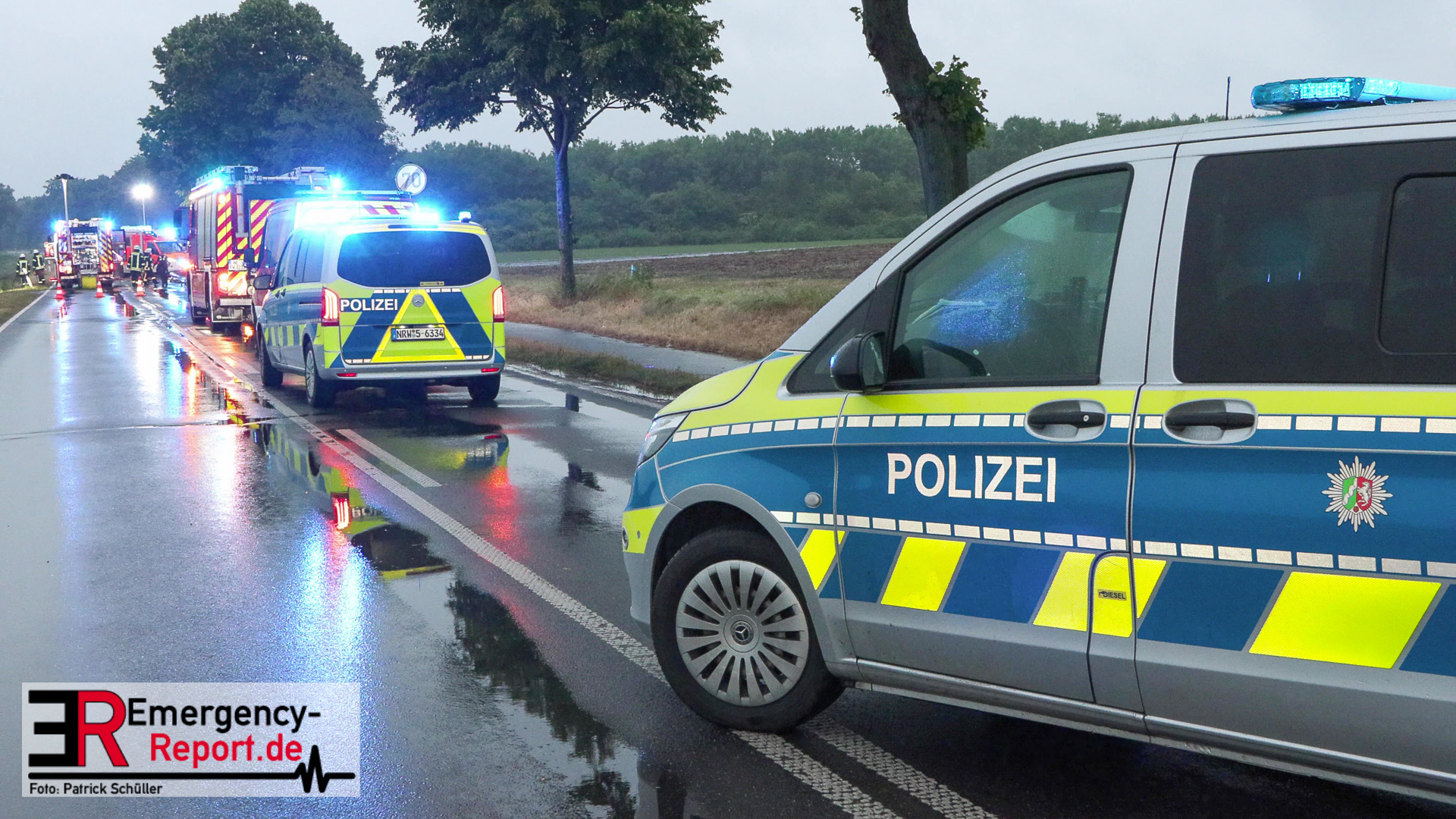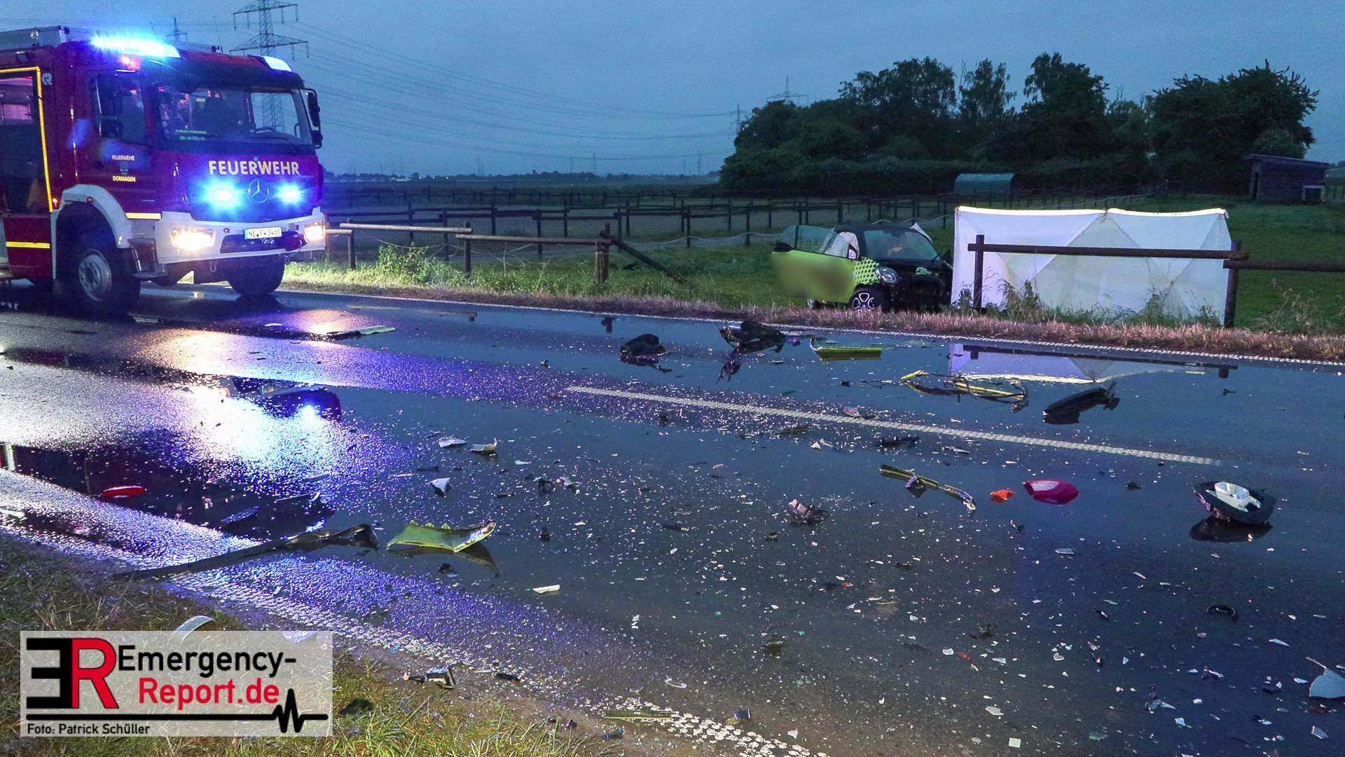 Etwa in Höhe der Einmündung Kohnacker kollidierten zwei PKW. Aufgrund der Kollision kamen beide Fahrzeuge von der Fahrbahn ab und sind auf einem Feld und einer angrenzenden Pferdekoppel zum Stehen gekommen. Beim Eintreffen der ersten Rettungskräfte befanden sich in einem der Fahrzeuge noch zwei eingeschlossene Personen. Der Fahrer des zweiten PKW wurde durch Ersthelfer vor Ort reanimiert. Umgehend haben Notfallsanitäter der Feuerwehr die Rettungsmaßnahmen fortgesetzt. Trotz aller Bemühungen verstarb der Fahrer noch an der Unfallstelle. Parallel dazu wurden die zwei Eingeschlossenen aus dem anderen Fahrzeug befreit. Sie wurden nach ihrer Befreiung durch den Rettungsdienst versorgt und in umliegende Krankenhäuser gebracht.