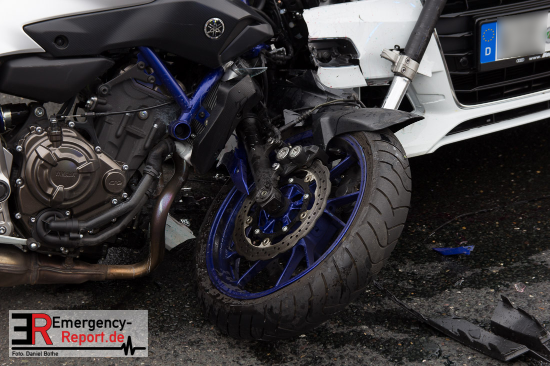 Neuss (ots) – Am Freitag Nachmittag, 24.06.2016, gegen 17.20 Uhr, kam es zu einem schweren Verkehrsunfall in Neuss. Ein 42 Jahre alter Pkw-Fahrer aus Nettetal befuhr mit seinem Audi die Kölner Straße aus Richtung Grüner Weg kommend in Fahrtrichtung Alexianerplatz. In Höhe der Fa. OBI beabsichtigte er nach links auf den OBI-Parkplatz einzubiegen. Dabei kam es zum Zusammenstoß mit einem 20-jährigen Neusser, der mit seinem Motorrad die Kölner Straße in Gegenrichtung befuhr. Durch die Kollision stürzte der Motorradfahrer und verletzte sich schwer. Nach notärztlicher Erstversorgung wurde der junge Mann in ein Krankenhaus gebracht. Beide Fahrzeuge wurden erheblich beschädigt. Während der Unfallaufnahme kam es zu erheblichen Verkehrsbeeinträchtigungen, da die Kölner Straße ab Hammfelddamm in Richtung Gnadental für ca. 45 Minuten gesperrt werden musste. (Ro.)