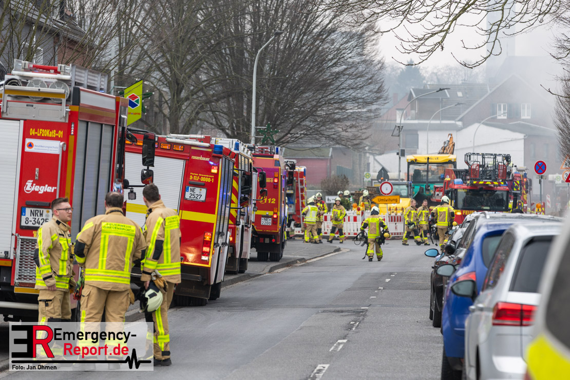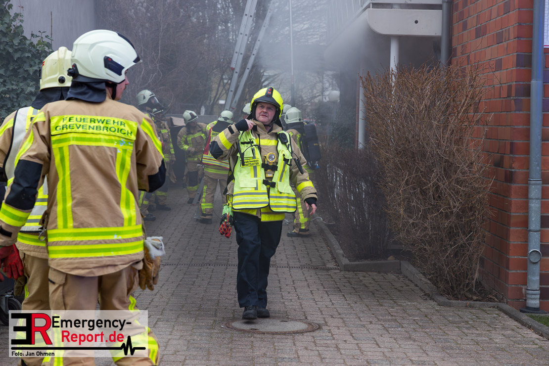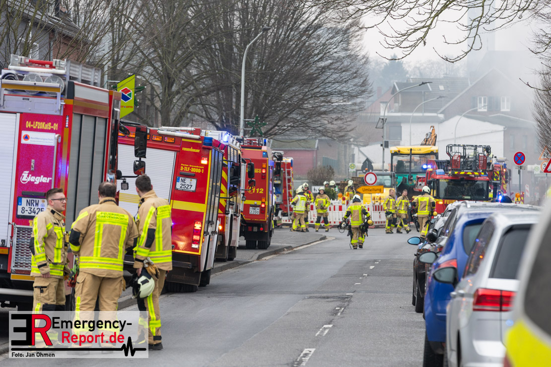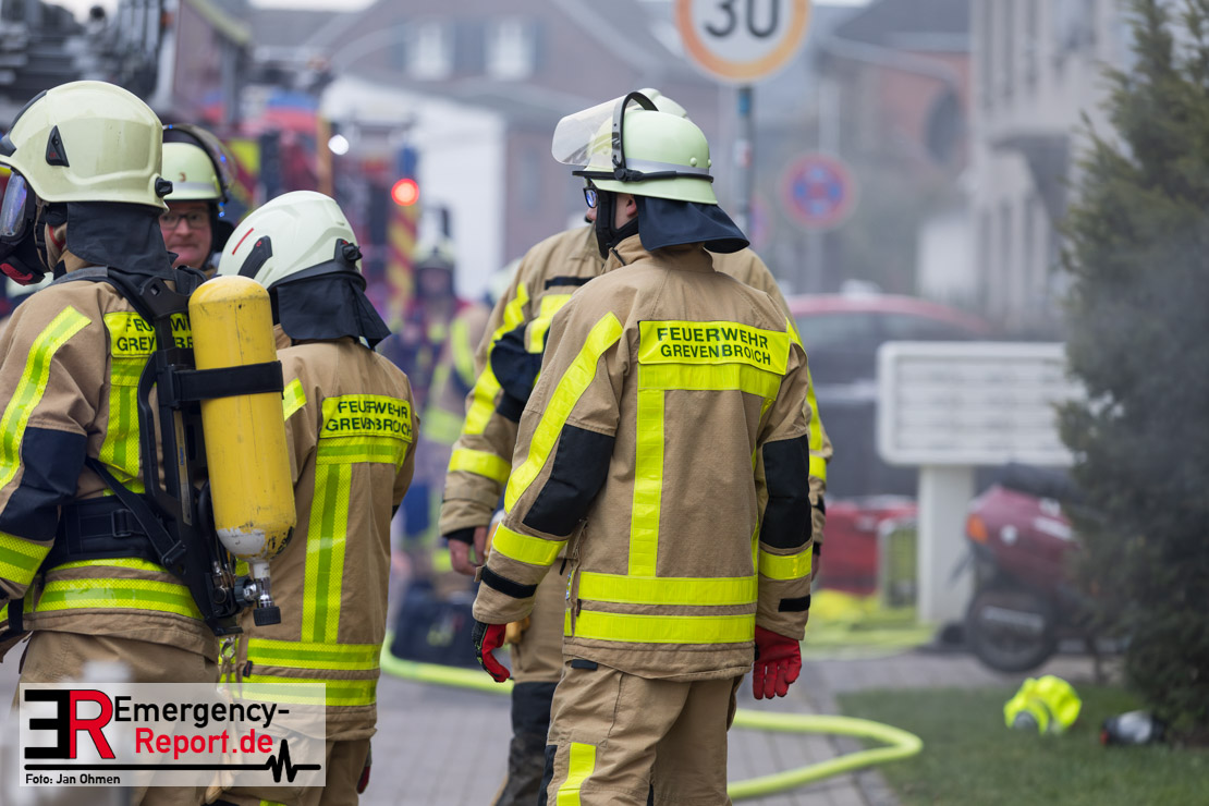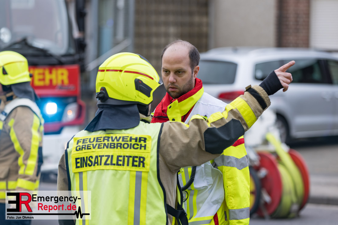 Sowohl Anwohner als auch Bewohner des Hauses meldeten sich daraufhin über Notruf. Aufgrund der Lagemeldung und der von weitem sichtbaren Rauchentwicklung veranlasste Einsatzleiter Heiko Ratz bereits auf der Anfahrt eine erste Alarmstufenerhöhung. Beim Eintreffen forderte er nochmals weitere Einsatzkräfte nach. Daraufhin wurde für alle Kräfte der Grevenbroicher Wehr Stadtalarm ausgelöst.