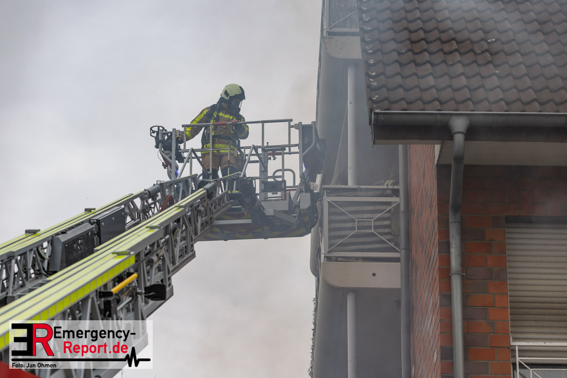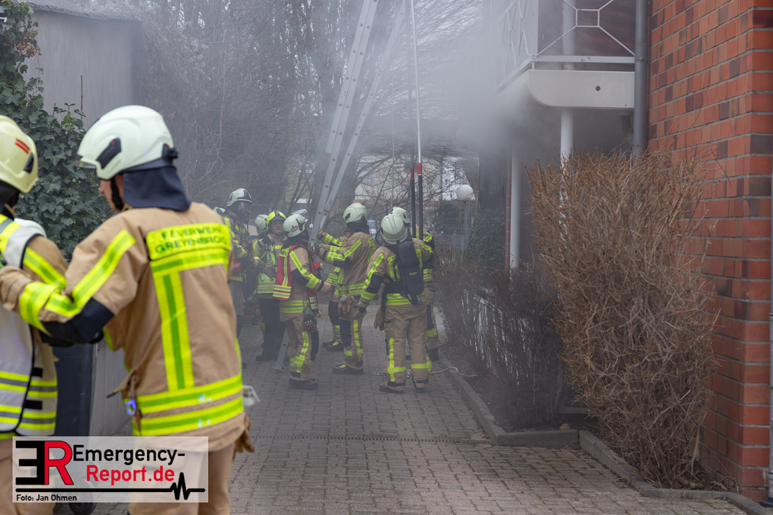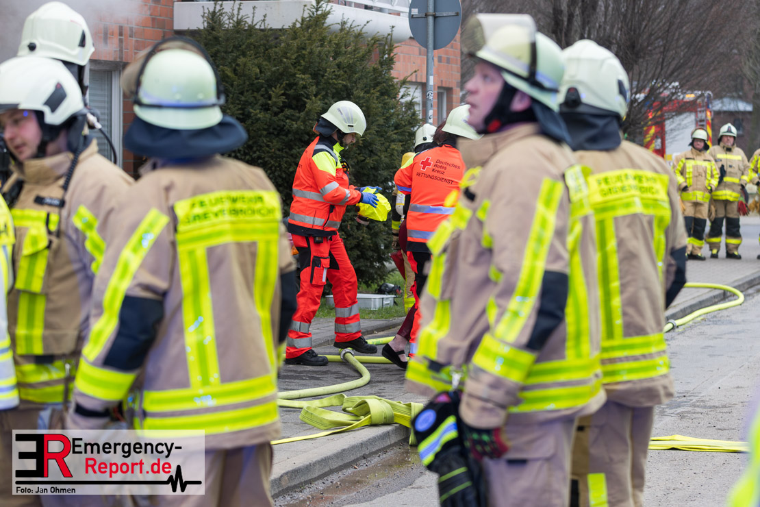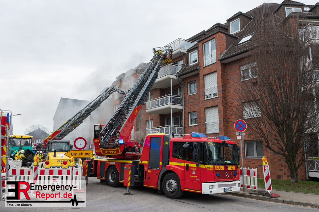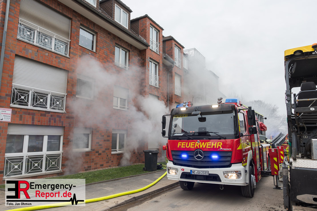 Sowohl Anwohner als auch Bewohner des Hauses meldeten sich daraufhin über Notruf. Aufgrund der Lagemeldung und der von weitem sichtbaren Rauchentwicklung veranlasste Einsatzleiter Heiko Ratz bereits auf der Anfahrt eine erste Alarmstufenerhöhung. Beim Eintreffen forderte er nochmals weitere Einsatzkräfte nach. Daraufhin wurde für alle Kräfte der Grevenbroicher Wehr Stadtalarm ausgelöst.