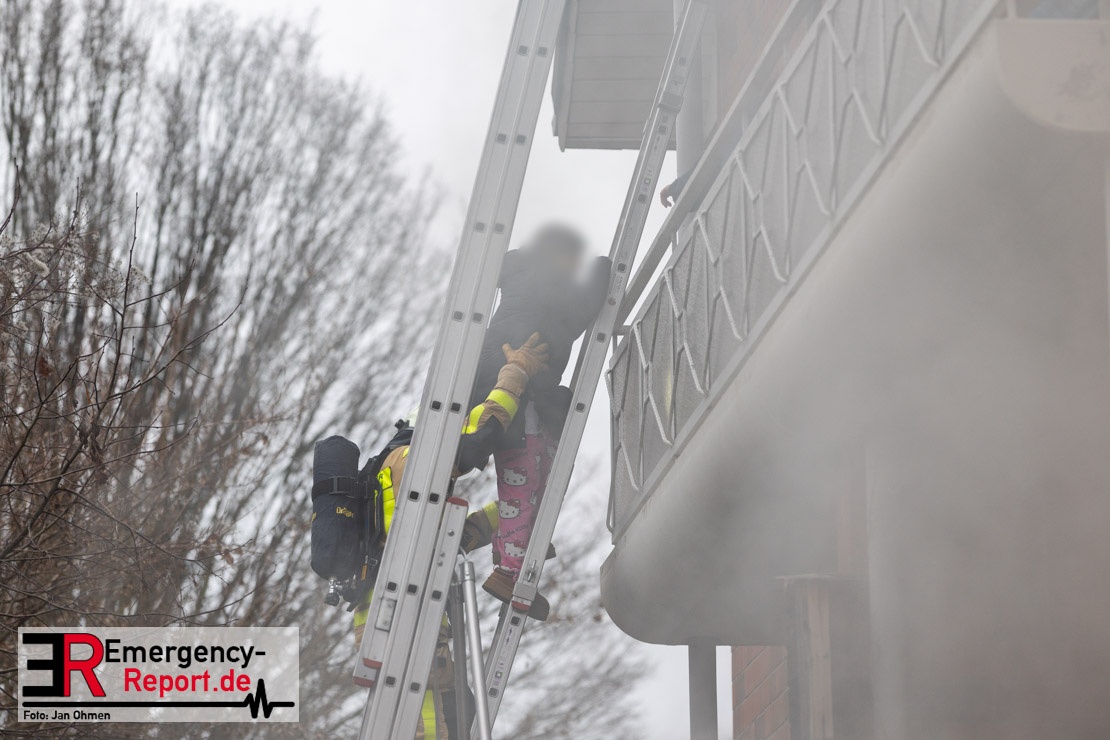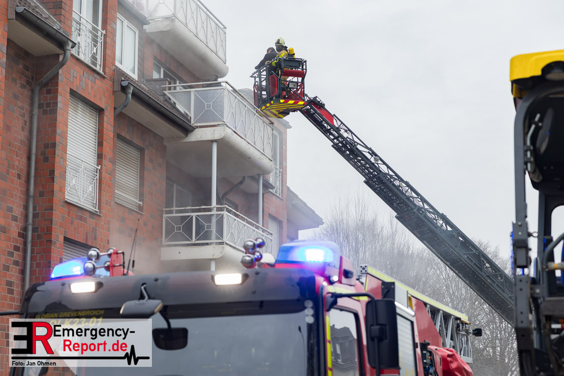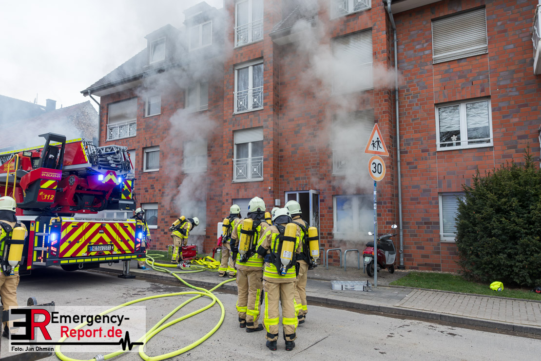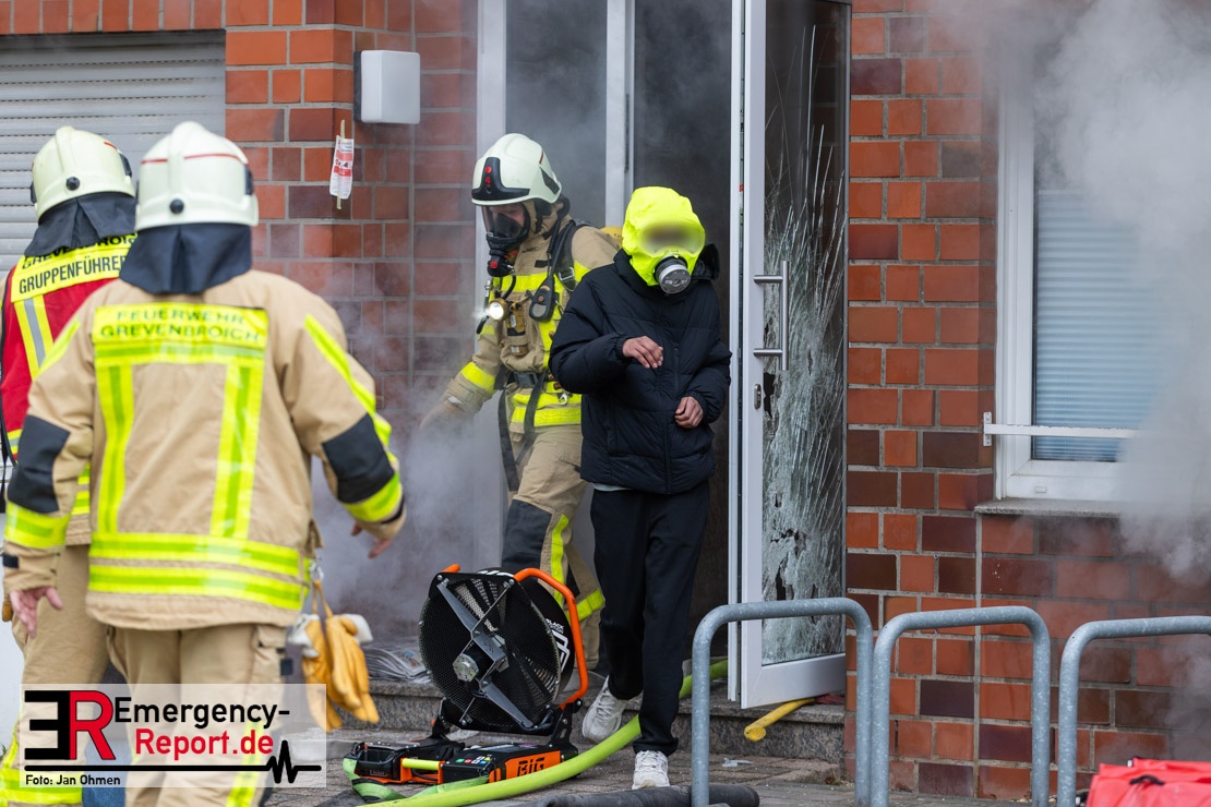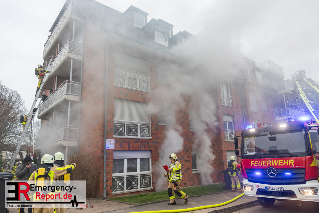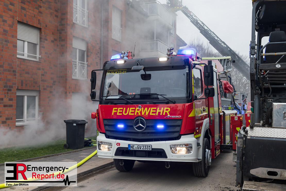 Bei einem ausgedehnten Kellerbrand in einem Wohnhaus im Ortsteil Neuenhausen haben Einsatzkräfte der Feuerwehr Grevenbroich am Sonntag (25.01.26) mehr als 30 Bewohner des Hauses über Leitern in Sicherheit gebracht. Eine Person kam mit Verdacht auf Rauchgasvergiftung ins Krankenhaus, ein Feuerwehrmann wurde bei den Rettungsmaßnahmen leicht verletzt, konnte aber vor Ort behandelt werden. Das betroffene Gebäude sowie ein Nachbarhaus waren zunächst nicht mehr bewohnbar.
