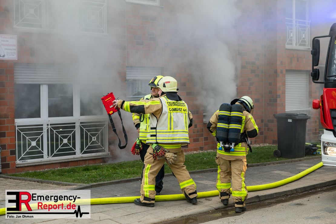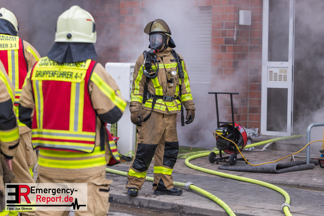 Mehrere Einsatztrupps der Feuerwehr begannen sofort mit der Rettung der eingeschlossenen Bewohner. Dabei kamen beide Drehleitern der Feuerwehr Grevenbroich zum Einsatz. Zusätzliche Trupps retteten zahlreiche Bewohner zudem über tragbare Leitern von Balkonen. Weitere Personen wurden von den Trupps mit sogenannten Fluchthauben ausgestattet, die einen integrierten Filter besitzen und eine Rettung von Menschen auch durch verrauchte Räume ermöglichen.