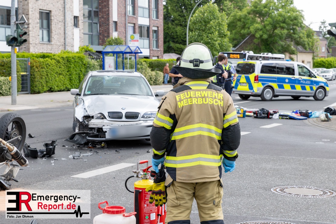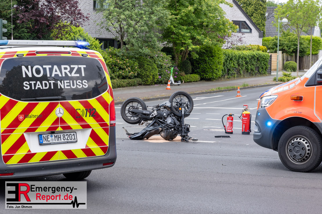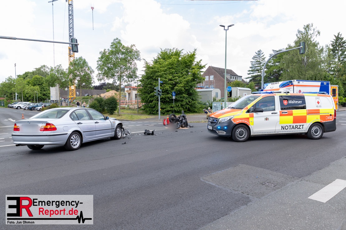 Am Montag (26.5.) ist es im Meerbuscher Stadtteil Büderich zu einem Verkehrsunfall gekommen. Nach bisherigem Stand der Erkenntnisse war ein 19-jähriger Meerbuscher gegen 12.20 Uhr von der Meerbuscher Straße kommend auf der Moerser Straße unterwegs gewesen. Ein ihm entgegenkommender Pkw-Fahrer beabsichtigte, nach links in die Hildegundisallee einzubiegen. Dabei kam es aus bisher nicht geklärter Ursache zur Kollision zwischen den beiden Fahrzeugen, der 19-Jährige Motorradfahrer kam zu Fall und verletzte sich schwer. Nach derzeitigem Stand kann eine Lebensgefahr nicht ausgeschlossen werden. Er wurde mit einem Rettungshubschrauber in ein Krankenhaus gebracht.