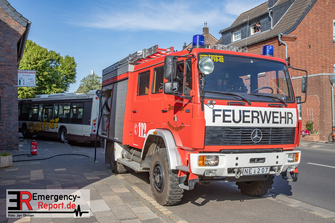 An der Straße Jakobusplatz im Grevenbroicher Ortsteil Neukirchen war der Bus am Sonntagnachmittag von der Straße abgekommen und gegen ein Haus geprallt. Zeugen meldeten den Unfall per Notruf an die Kreisleitstelle in Neuss. Diese alarmierte daraufhin mehrere Feuerwehr- und Rettungskräfte mit dem Stichwort „Verkehrsunfall mit Bus“. Zudem wurde der Rüstzug der Feuerwehr Dormagen alarmiert, die die Einsatzkräfte mit einem Abrollbehälter „Bau“ unterstützen sollten.
