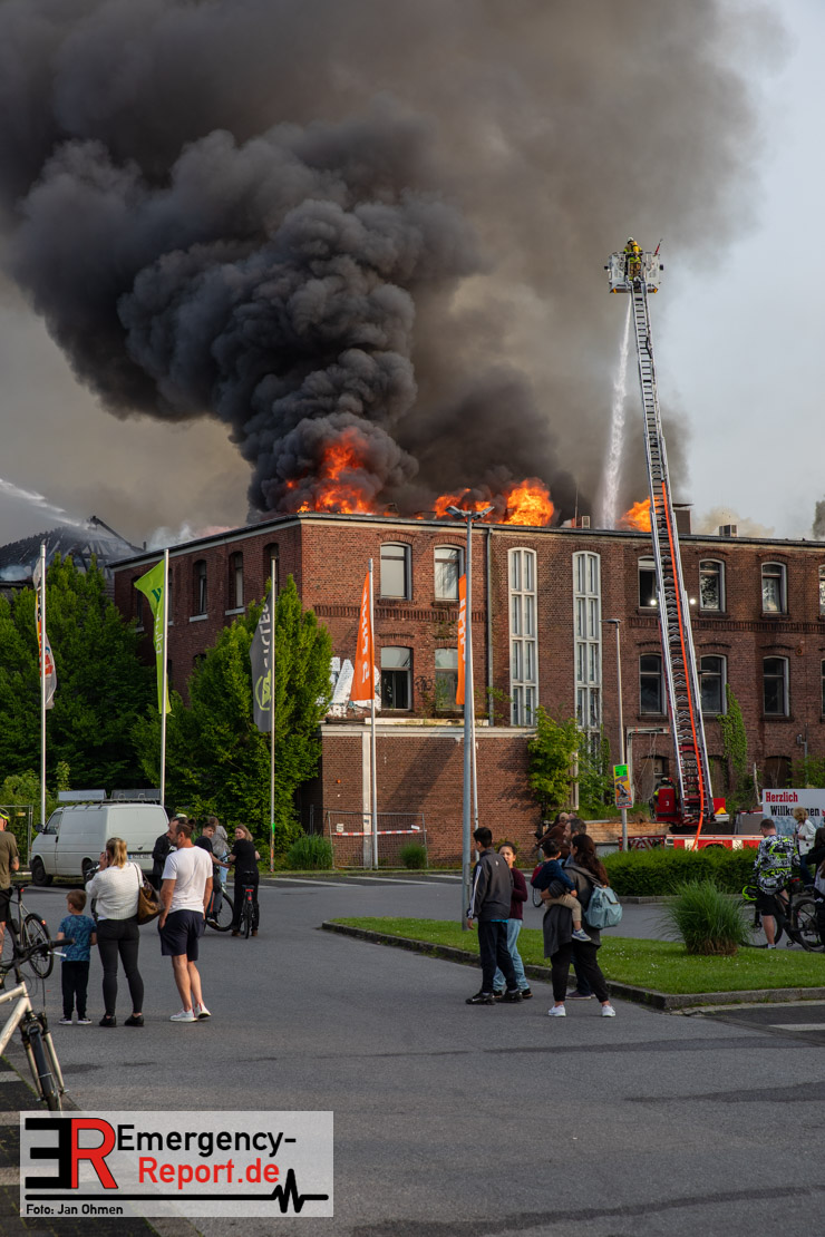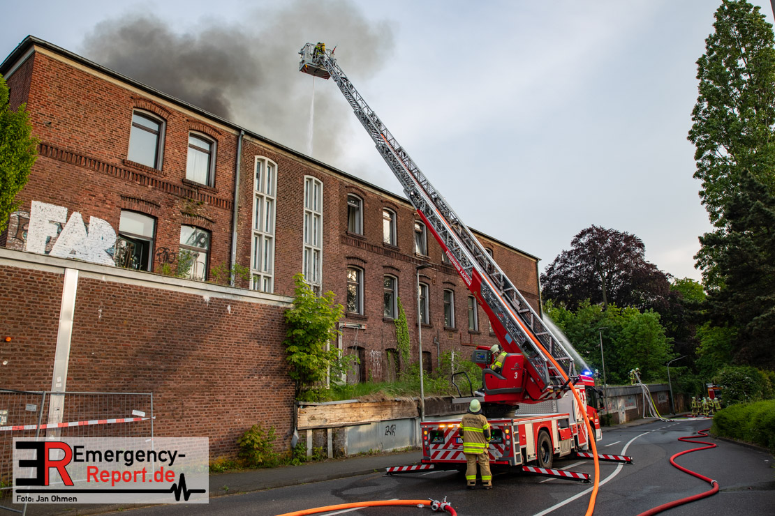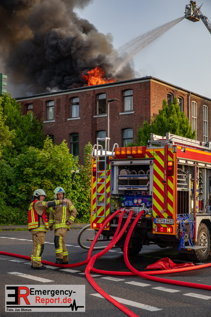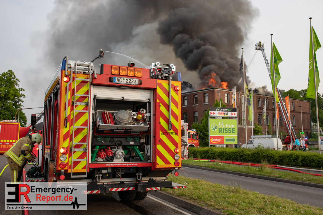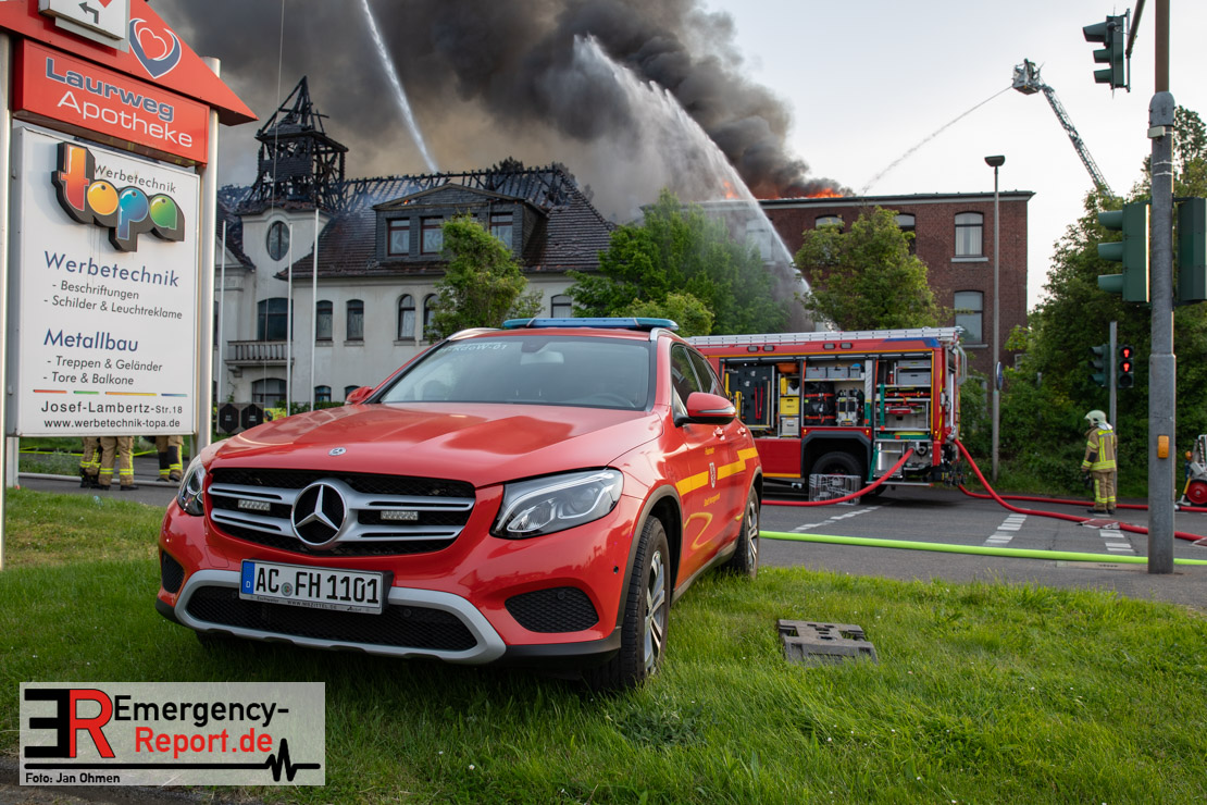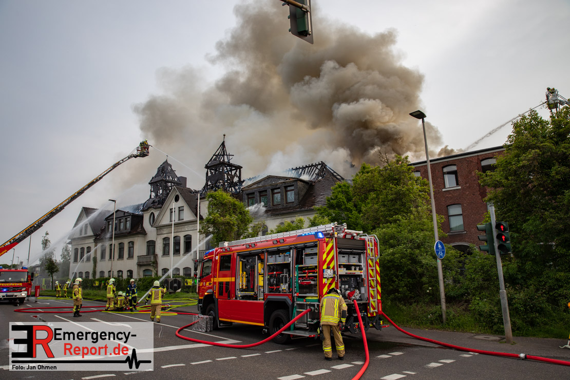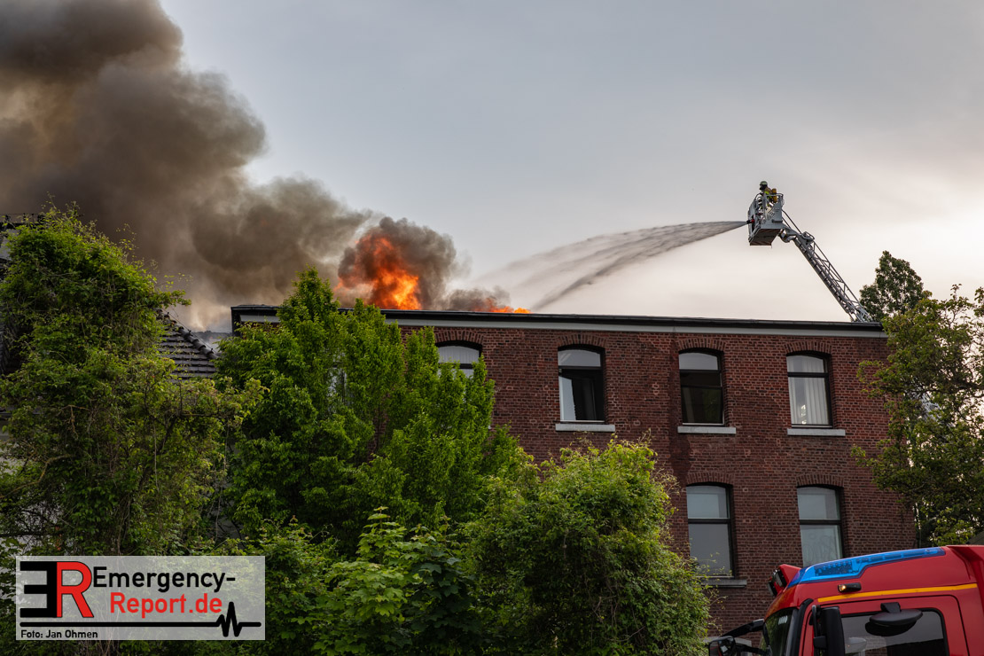 Die Feuerwehr Herzogenrath wurde am Abend des 21.05.2023, auf die Roermonder Straße in den Stadtteil Kohlscheid, alarmiert. Bereits auf der Anfahrt war die starke Rauchentwicklung für die Einsatzkräfte sichtbar. Bei Eintreffen stellte sich heraus, dass der Dachstuhl eines ehemaligen Verwaltungsgebäudes brannte. Das Feuer zündete kurz nach dem Eintreffen der Einsatzkräfte durch und breitete sich auf die gesamte Gebäudelänge aus. Mit mehreren Löschrohren und unter dem Einsatz von insgesamt vier Drehleitern wurde das Feuer stundenlang bekämpft. Insgesamt waren rund 130 Einsatzkräfte aus der Städteregion Aachen im Einsatz. Auch aus den benachbarten Niederlanden kam Unterstützung. Die Polizei geht von vorsätzlicher Brandstiftung aus. Drei Tatverdächtige konnten ermittelt werden.