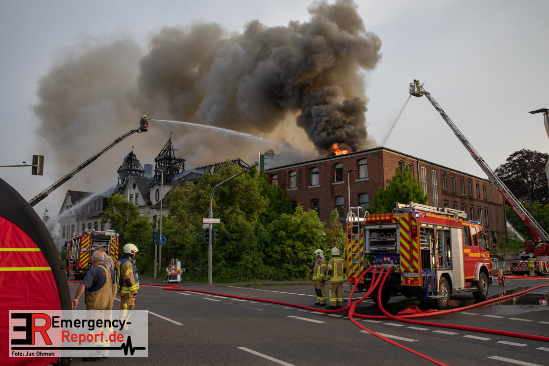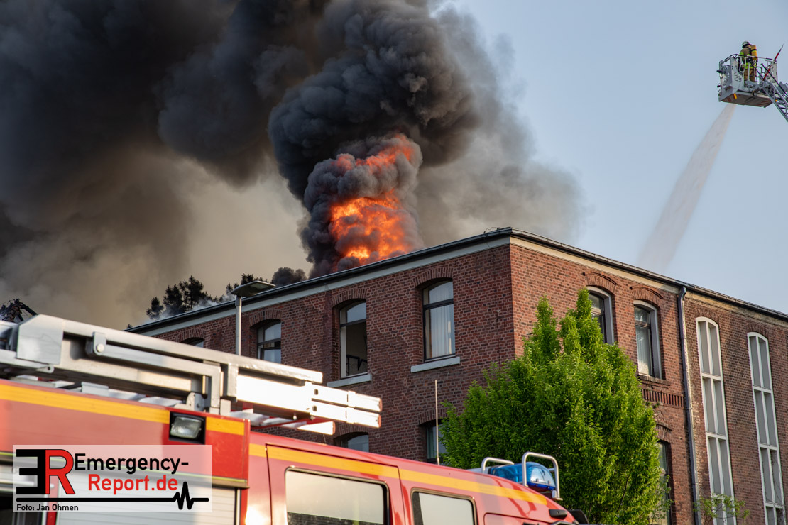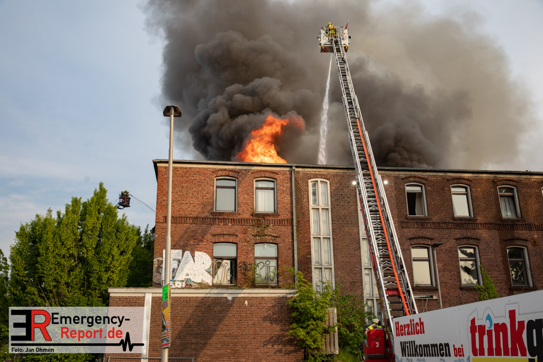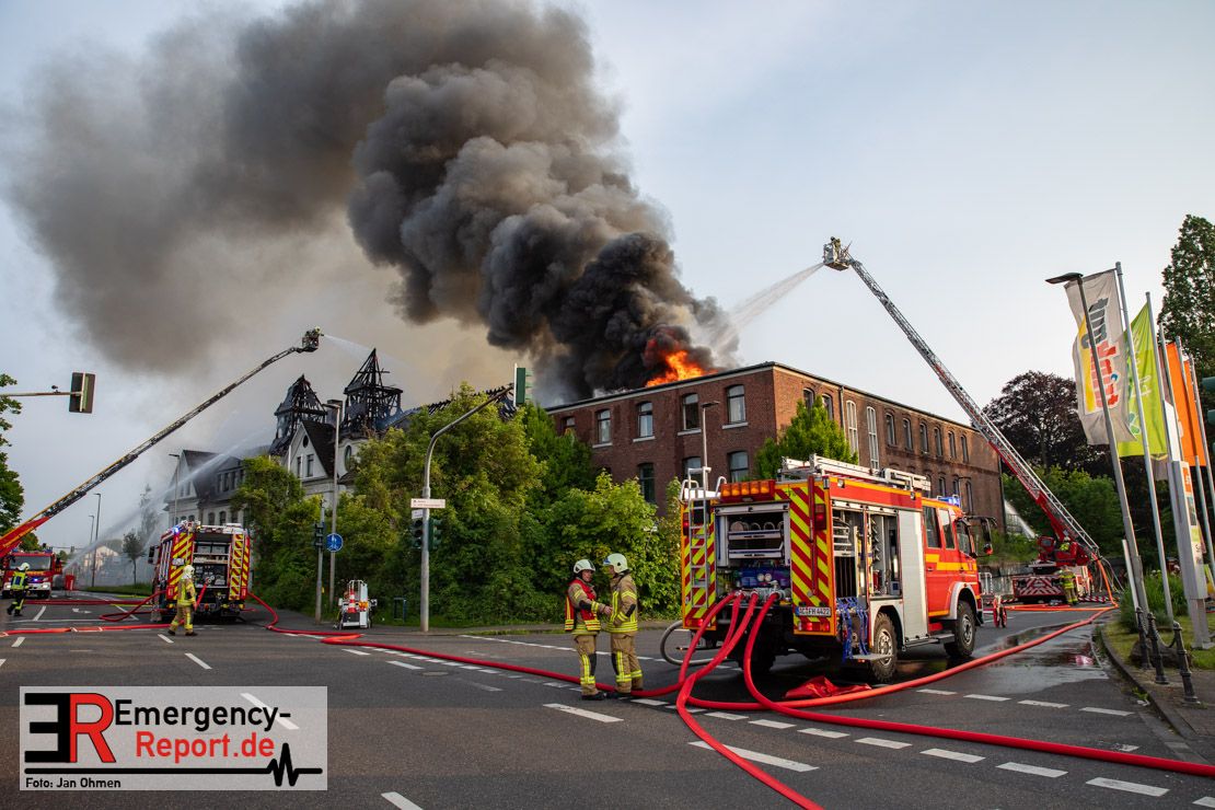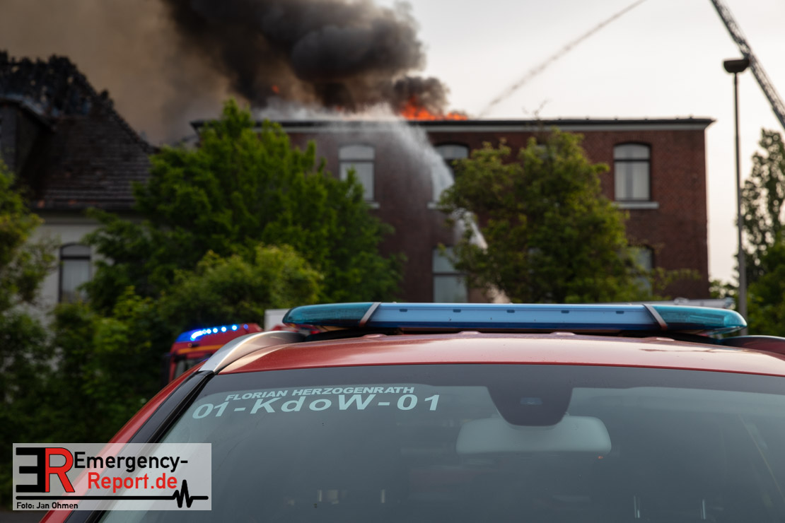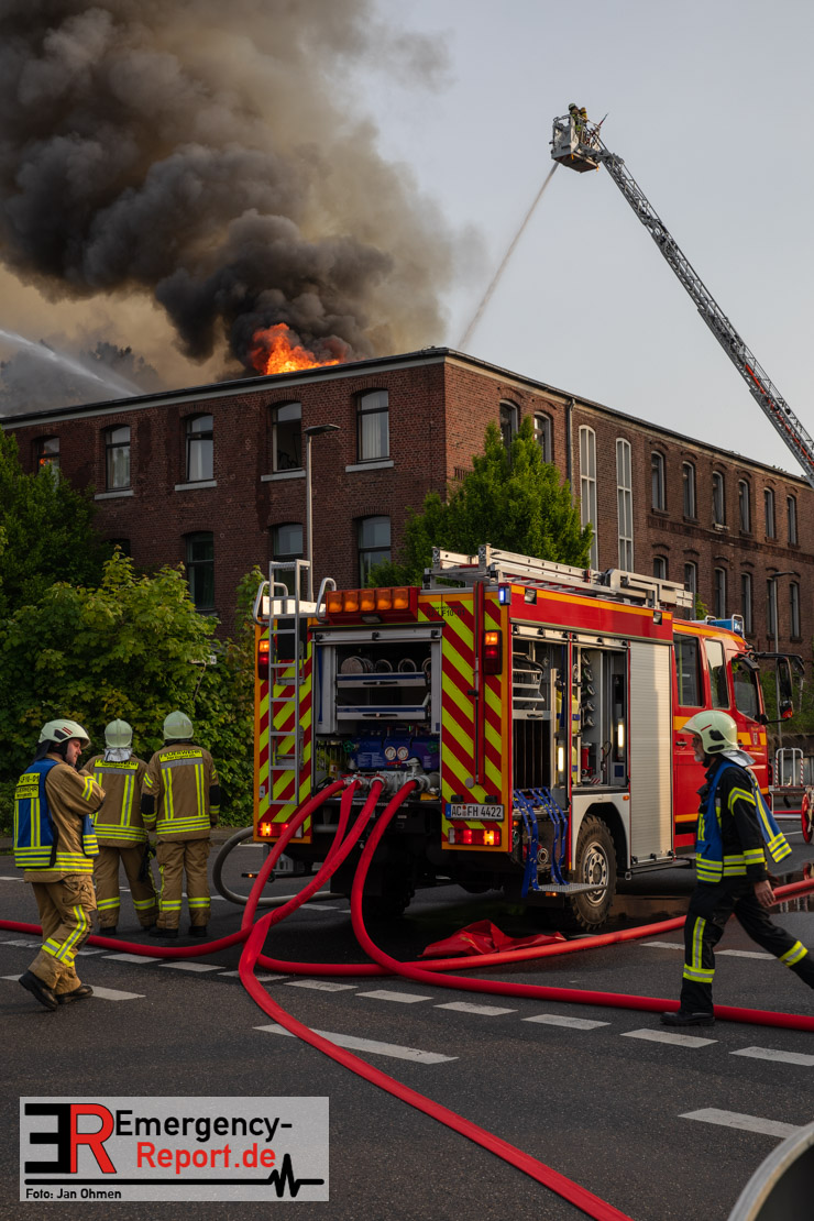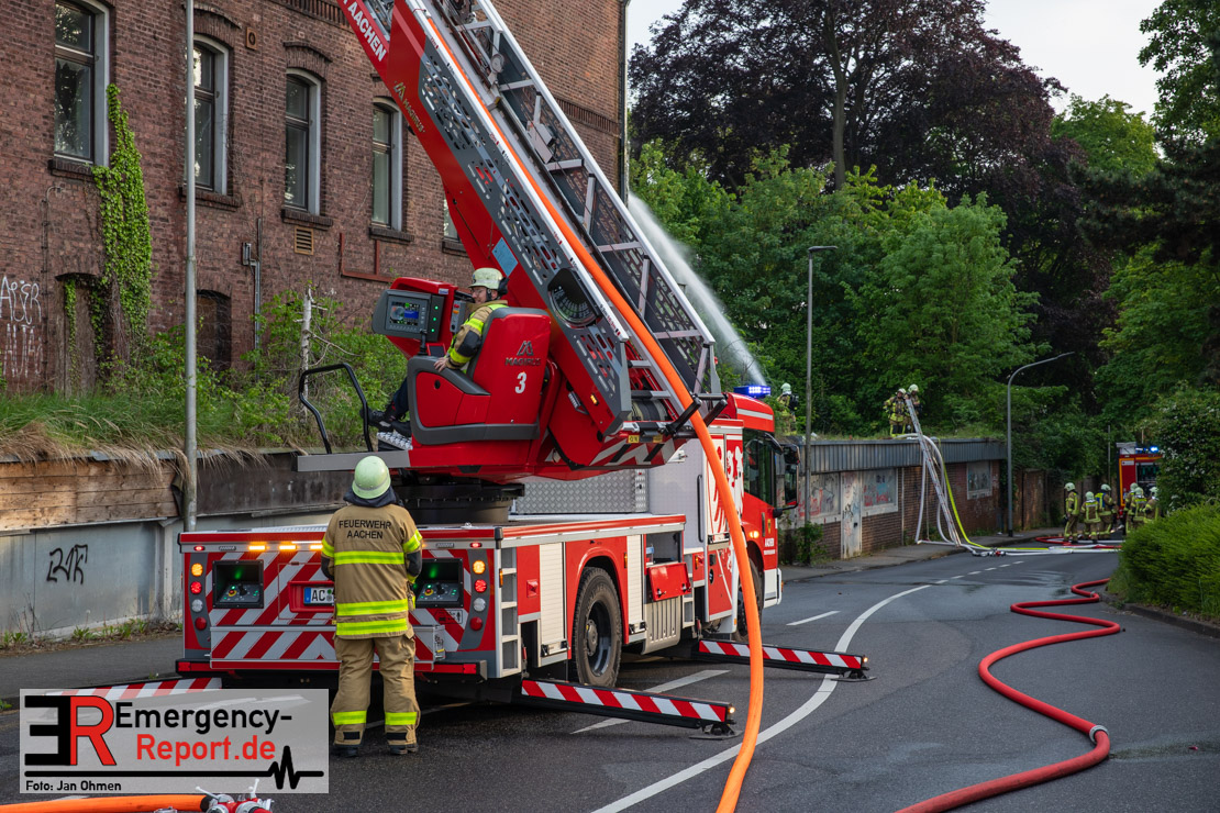 Die Feuerwehr Herzogenrath wurde am Abend des 21.05.2023, auf die Roermonder Straße in den Stadtteil Kohlscheid, alarmiert. Bereits auf der Anfahrt war die starke Rauchentwicklung für die Einsatzkräfte sichtbar. Bei Eintreffen stellte sich heraus, dass der Dachstuhl eines ehemaligen Verwaltungsgebäudes brannte. Das Feuer zündete kurz nach dem Eintreffen der Einsatzkräfte durch und breitete sich auf die gesamte Gebäudelänge aus. Mit mehreren Löschrohren und unter dem Einsatz von insgesamt vier Drehleitern wurde das Feuer stundenlang bekämpft. Insgesamt waren rund 130 Einsatzkräfte aus der Städteregion Aachen im Einsatz. Auch aus den benachbarten Niederlanden kam Unterstützung. Die Polizei geht von vorsätzlicher Brandstiftung aus. Drei Tatverdächtige konnten ermittelt werden.