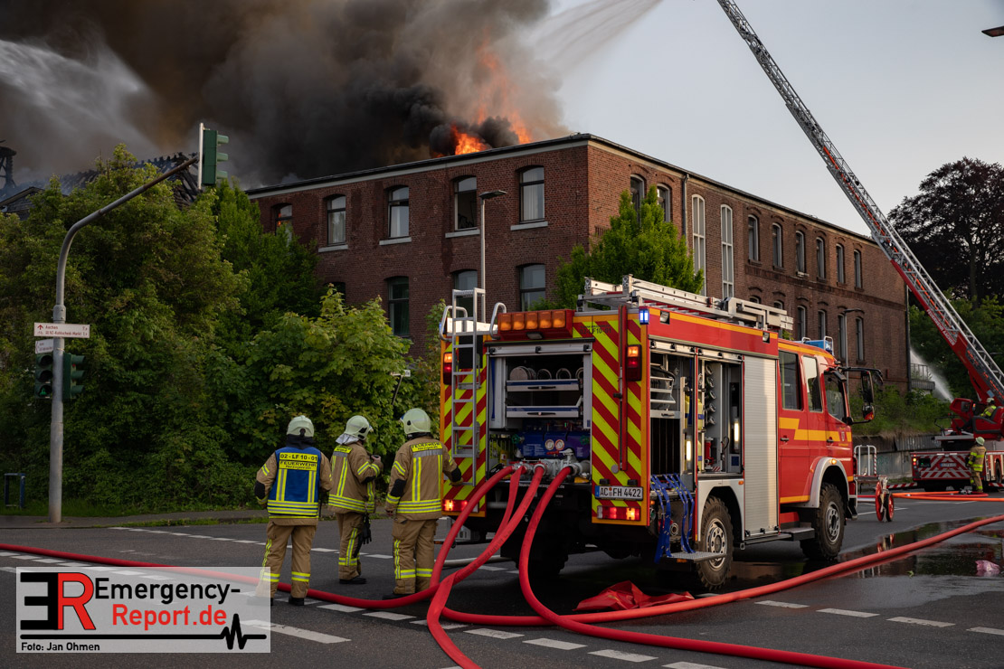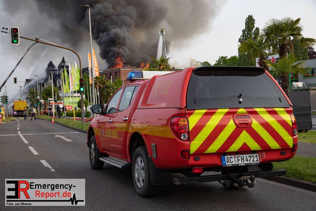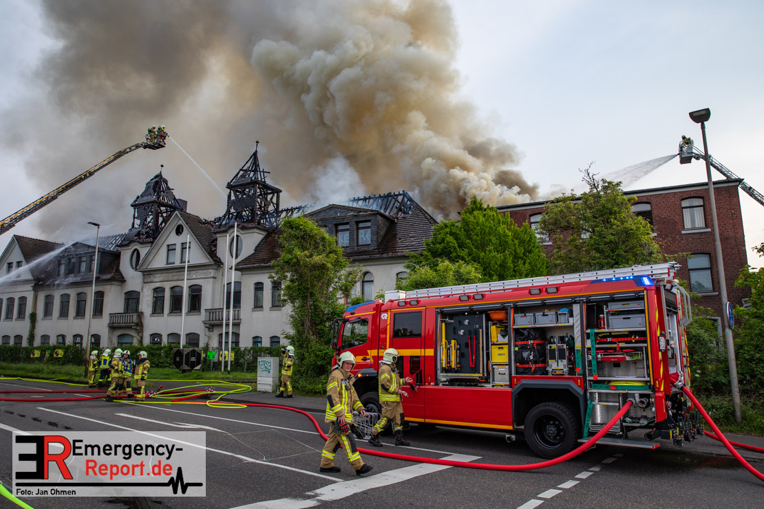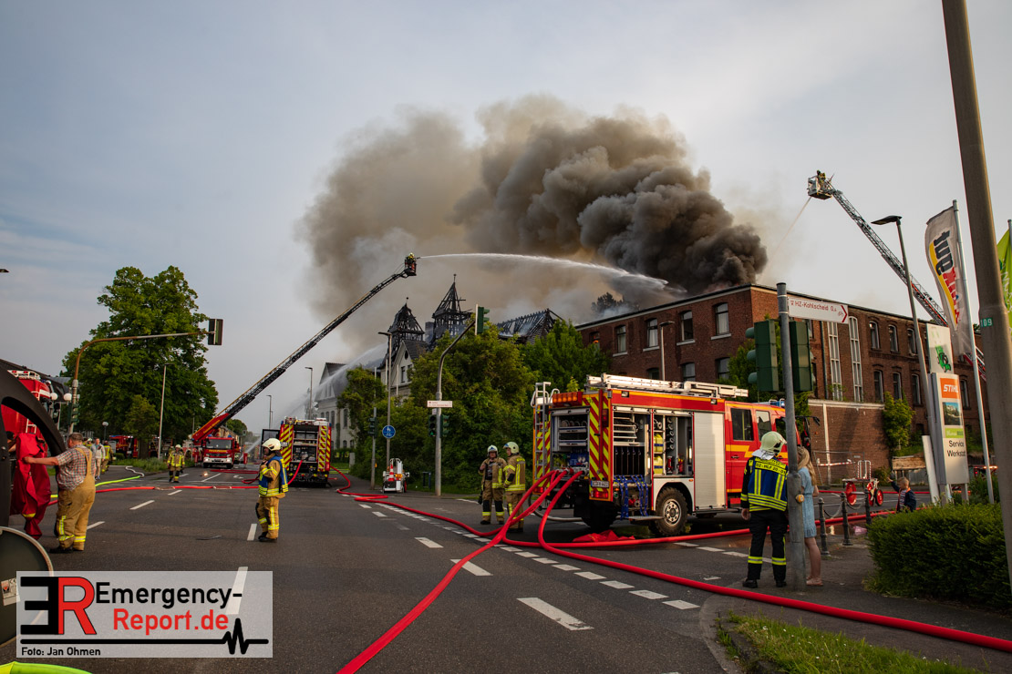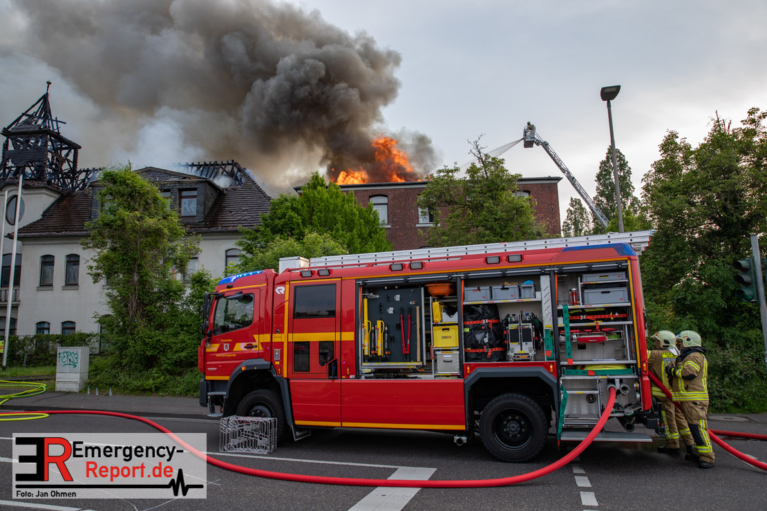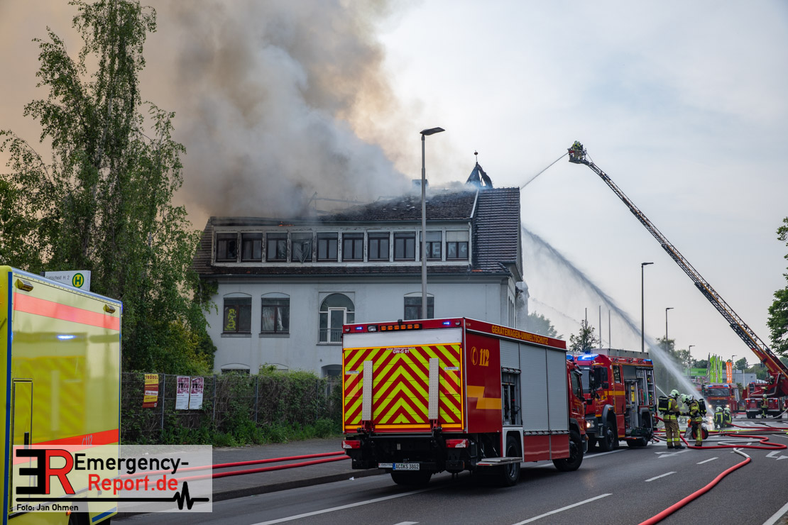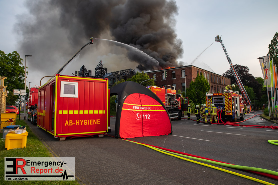 Die Feuerwehr Herzogenrath wurde am Abend des 21.05.2023, auf die Roermonder Straße in den Stadtteil Kohlscheid, alarmiert. Bereits auf der Anfahrt war die starke Rauchentwicklung für die Einsatzkräfte sichtbar. Bei Eintreffen stellte sich heraus, dass der Dachstuhl eines ehemaligen Verwaltungsgebäudes brannte. Das Feuer zündete kurz nach dem Eintreffen der Einsatzkräfte durch und breitete sich auf die gesamte Gebäudelänge aus. Mit mehreren Löschrohren und unter dem Einsatz von insgesamt vier Drehleitern wurde das Feuer stundenlang bekämpft. Insgesamt waren rund 130 Einsatzkräfte aus der Städteregion Aachen im Einsatz. Auch aus den benachbarten Niederlanden kam Unterstützung. Die Polizei geht von vorsätzlicher Brandstiftung aus. Drei Tatverdächtige konnten ermittelt werden.