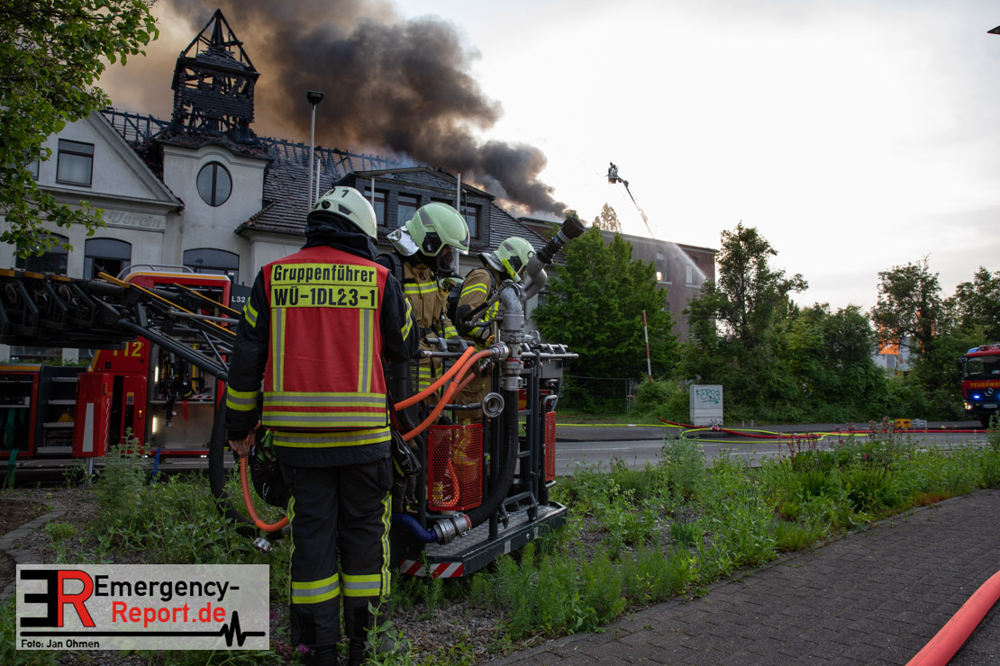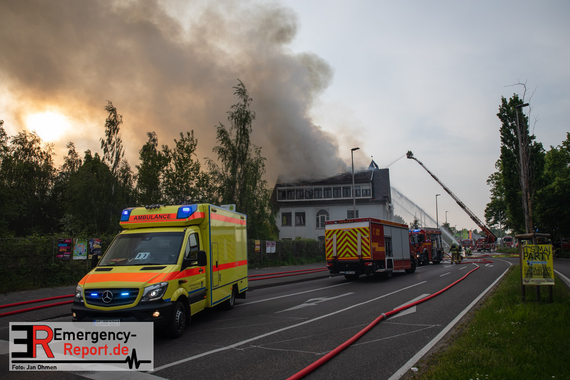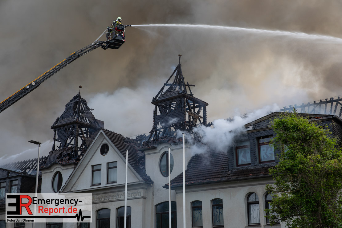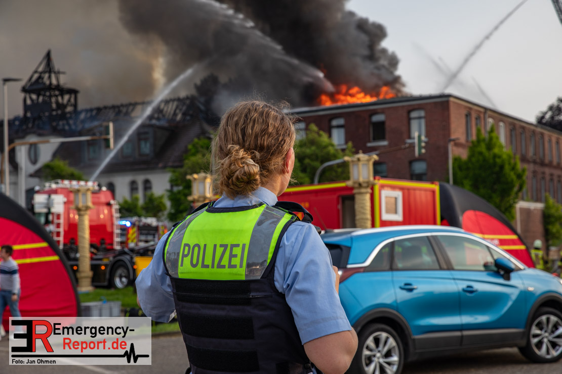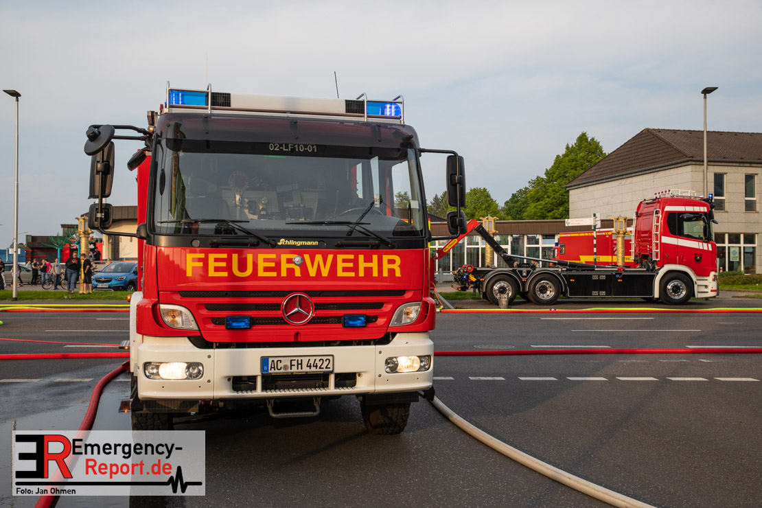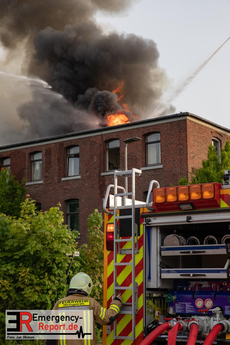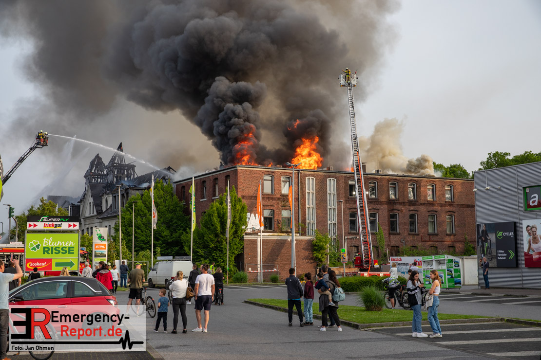 Die Feuerwehr Herzogenrath wurde am Abend des 21.05.2023, auf die Roermonder Straße in den Stadtteil Kohlscheid, alarmiert. Bereits auf der Anfahrt war die starke Rauchentwicklung für die Einsatzkräfte sichtbar. Bei Eintreffen stellte sich heraus, dass der Dachstuhl eines ehemaligen Verwaltungsgebäudes brannte. Das Feuer zündete kurz nach dem Eintreffen der Einsatzkräfte durch und breitete sich auf die gesamte Gebäudelänge aus. Mit mehreren Löschrohren und unter dem Einsatz von insgesamt vier Drehleitern wurde das Feuer stundenlang bekämpft. Insgesamt waren rund 130 Einsatzkräfte aus der Städteregion Aachen im Einsatz. Auch aus den benachbarten Niederlanden kam Unterstützung. Die Polizei geht von vorsätzlicher Brandstiftung aus. Drei Tatverdächtige konnten ermittelt werden.