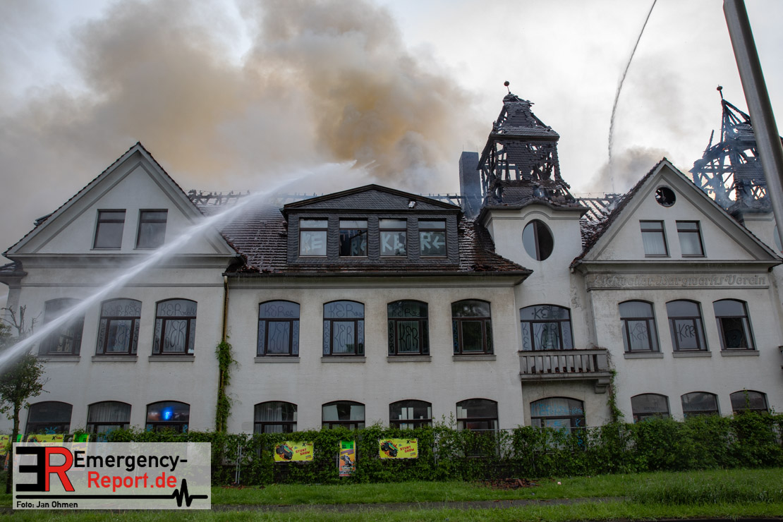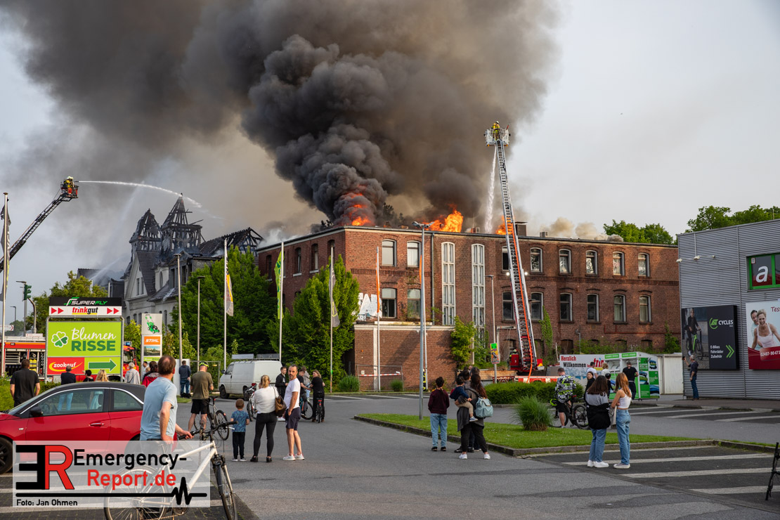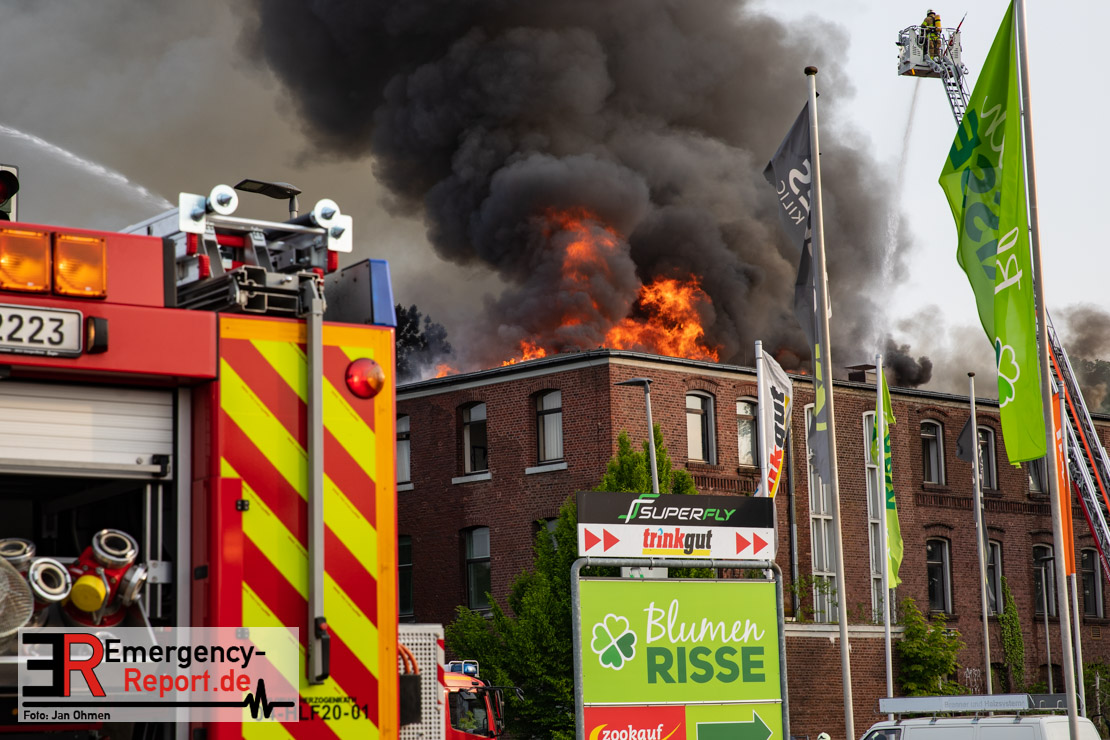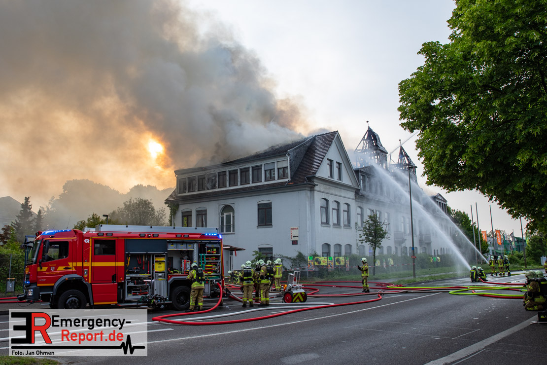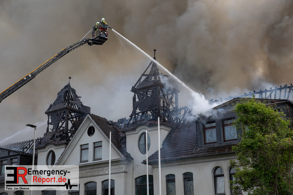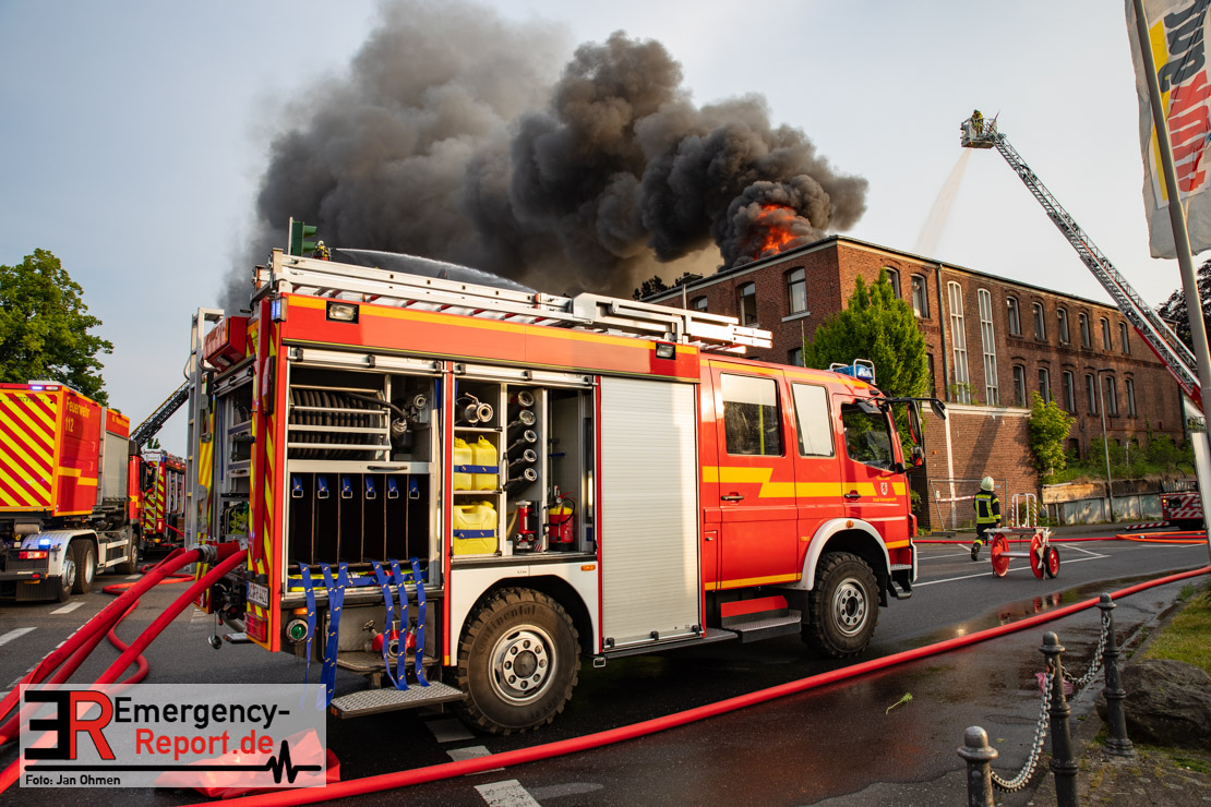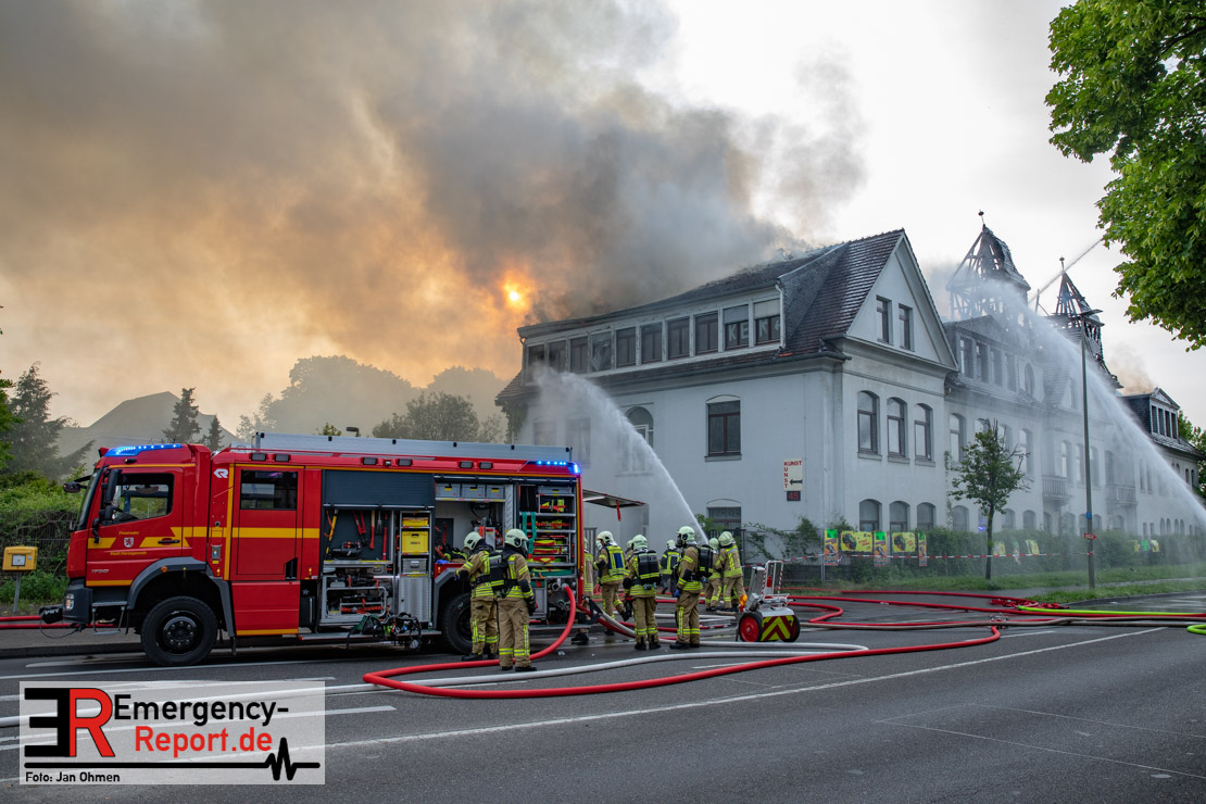 Die Feuerwehr Herzogenrath wurde am Abend des 21.05.2023, auf die Roermonder Straße in den Stadtteil Kohlscheid, alarmiert. Bereits auf der Anfahrt war die starke Rauchentwicklung für die Einsatzkräfte sichtbar. Bei Eintreffen stellte sich heraus, dass der Dachstuhl eines ehemaligen Verwaltungsgebäudes brannte. Das Feuer zündete kurz nach dem Eintreffen der Einsatzkräfte durch und breitete sich auf die gesamte Gebäudelänge aus. Mit mehreren Löschrohren und unter dem Einsatz von insgesamt vier Drehleitern wurde das Feuer stundenlang bekämpft. Insgesamt waren rund 130 Einsatzkräfte aus der Städteregion Aachen im Einsatz. Auch aus den benachbarten Niederlanden kam Unterstützung. Die Polizei geht von vorsätzlicher Brandstiftung aus. Drei Tatverdächtige konnten ermittelt werden.