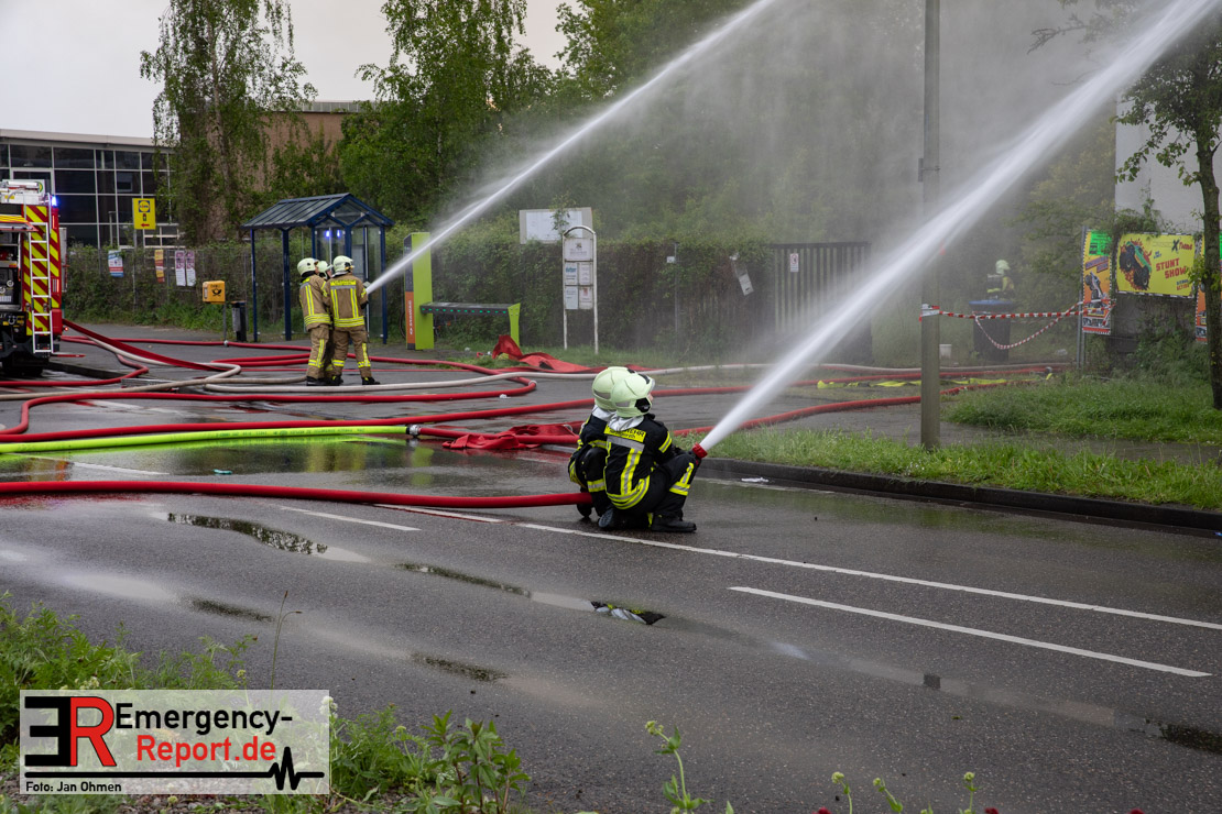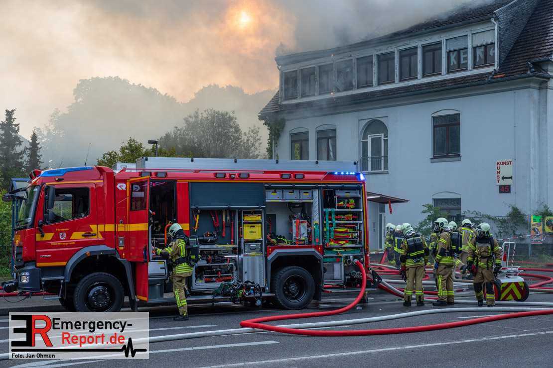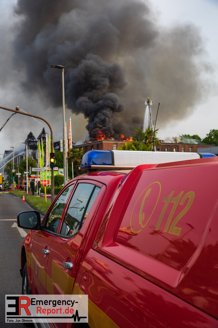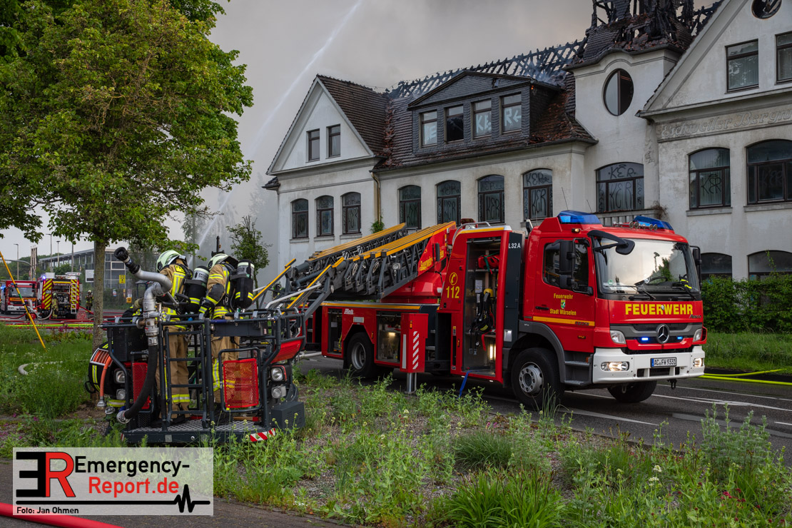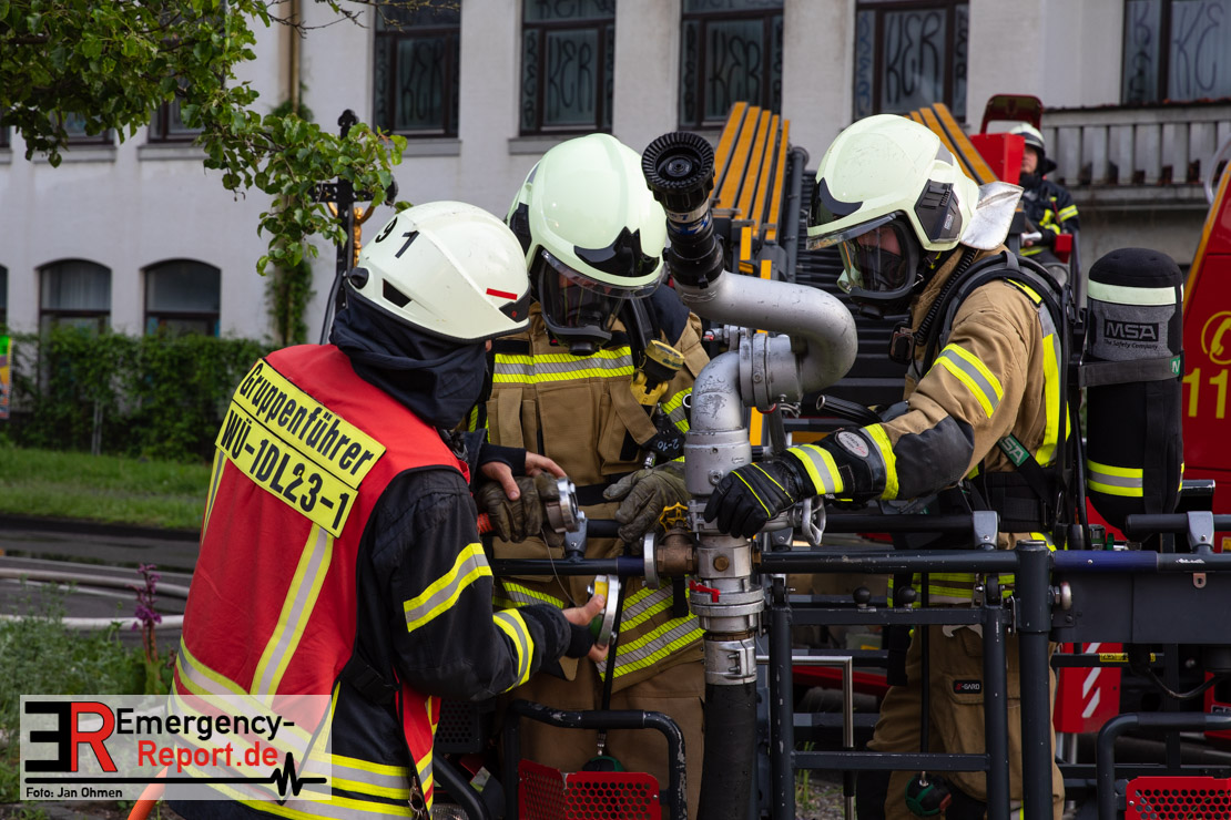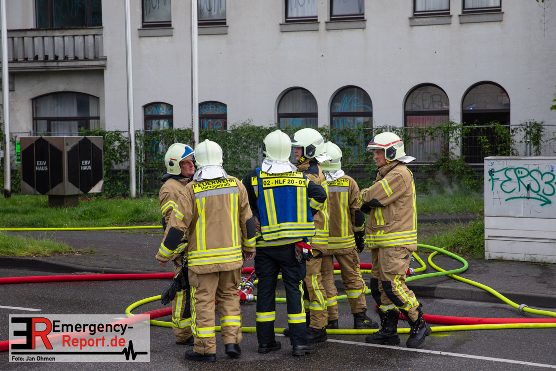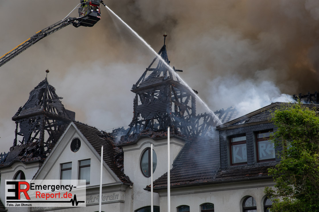 Die Feuerwehr Herzogenrath wurde am Abend des 21.05.2023, auf die Roermonder Straße in den Stadtteil Kohlscheid, alarmiert. Bereits auf der Anfahrt war die starke Rauchentwicklung für die Einsatzkräfte sichtbar. Bei Eintreffen stellte sich heraus, dass der Dachstuhl eines ehemaligen Verwaltungsgebäudes brannte. Das Feuer zündete kurz nach dem Eintreffen der Einsatzkräfte durch und breitete sich auf die gesamte Gebäudelänge aus. Mit mehreren Löschrohren und unter dem Einsatz von insgesamt vier Drehleitern wurde das Feuer stundenlang bekämpft. Insgesamt waren rund 130 Einsatzkräfte aus der Städteregion Aachen im Einsatz. Auch aus den benachbarten Niederlanden kam Unterstützung. Die Polizei geht von vorsätzlicher Brandstiftung aus. Drei Tatverdächtige konnten ermittelt werden.