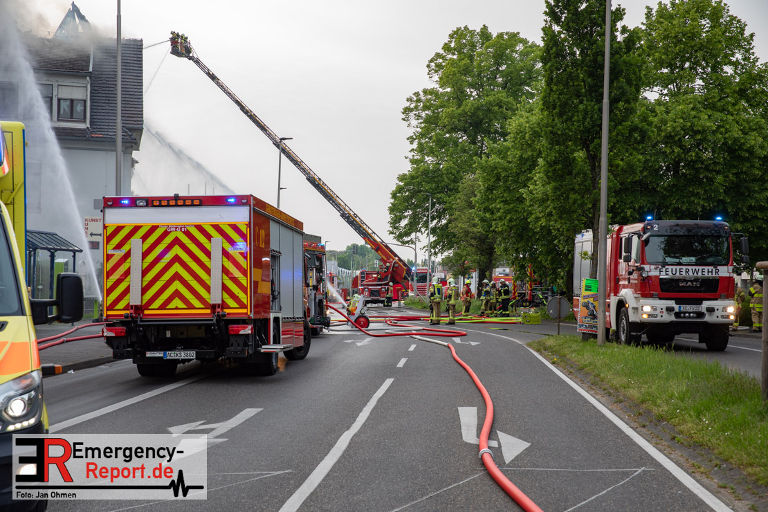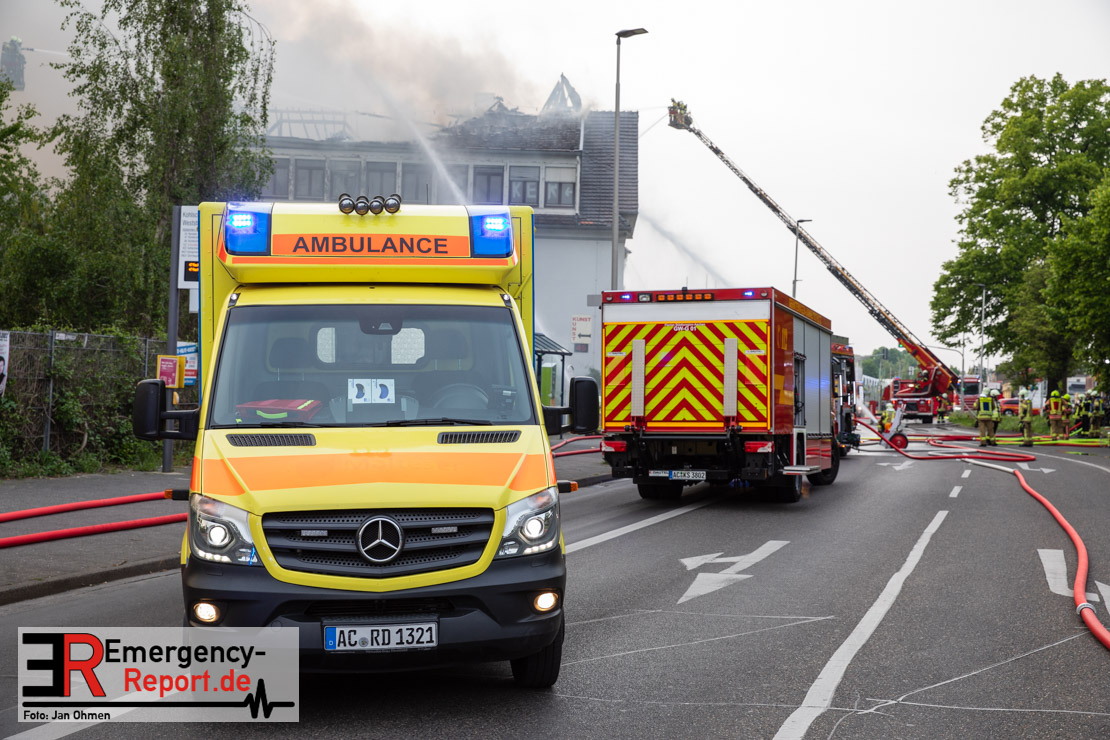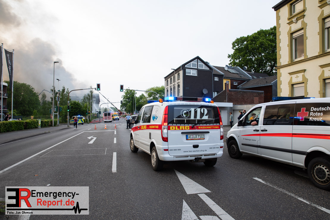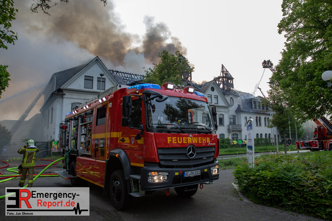 Die Feuerwehr Herzogenrath wurde am Abend des 21.05.2023, auf die Roermonder Straße in den Stadtteil Kohlscheid, alarmiert. Bereits auf der Anfahrt war die starke Rauchentwicklung für die Einsatzkräfte sichtbar. Bei Eintreffen stellte sich heraus, dass der Dachstuhl eines ehemaligen Verwaltungsgebäudes brannte. Das Feuer zündete kurz nach dem Eintreffen der Einsatzkräfte durch und breitete sich auf die gesamte Gebäudelänge aus. Mit mehreren Löschrohren und unter dem Einsatz von insgesamt vier Drehleitern wurde das Feuer stundenlang bekämpft. Insgesamt waren rund 130 Einsatzkräfte aus der Städteregion Aachen im Einsatz. Auch aus den benachbarten Niederlanden kam Unterstützung. Die Polizei geht von vorsätzlicher Brandstiftung aus. Drei Tatverdächtige konnten ermittelt werden.