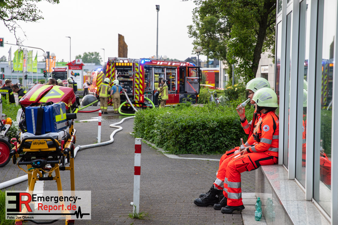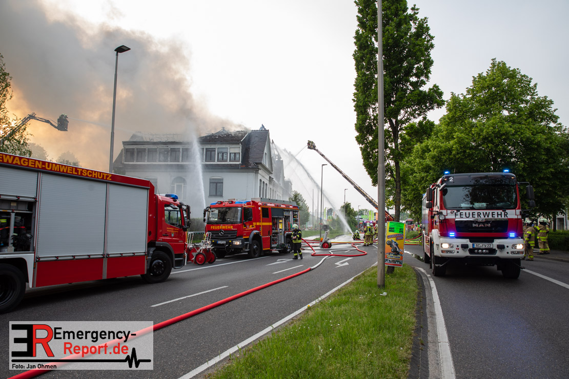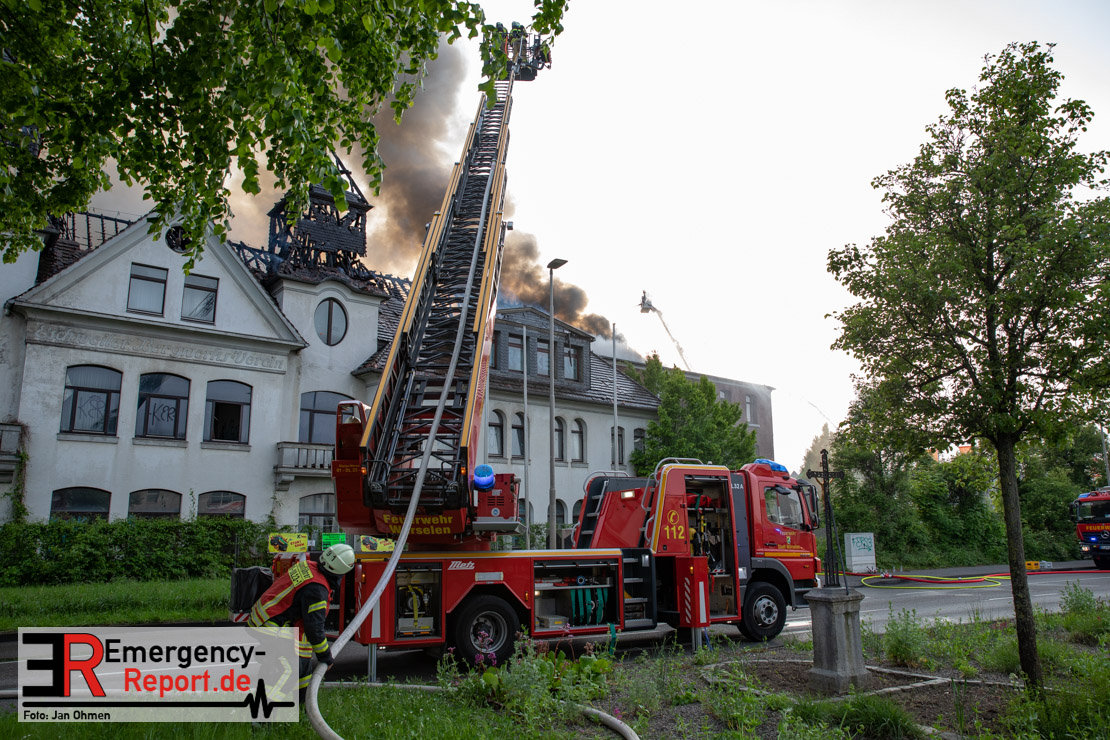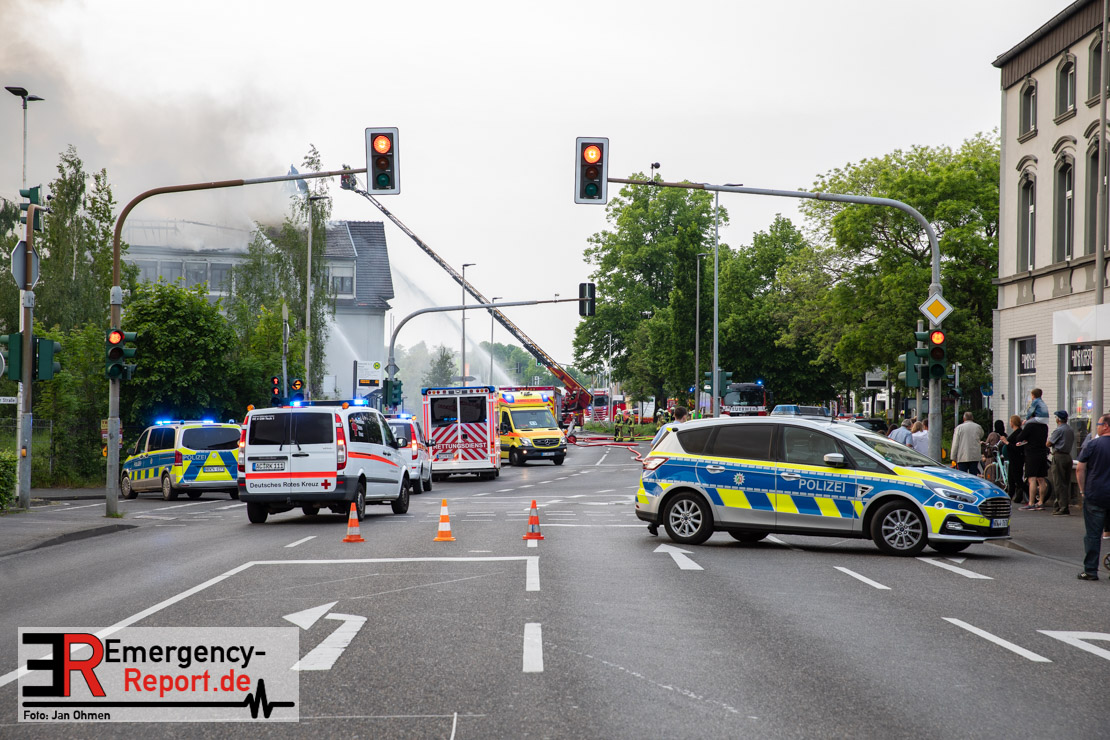 Die Feuerwehr Herzogenrath wurde am Abend des 21.05.2023, auf die Roermonder Straße in den Stadtteil Kohlscheid, alarmiert. Bereits auf der Anfahrt war die starke Rauchentwicklung für die Einsatzkräfte sichtbar. Bei Eintreffen stellte sich heraus, dass der Dachstuhl eines ehemaligen Verwaltungsgebäudes brannte. Das Feuer zündete kurz nach dem Eintreffen der Einsatzkräfte durch und breitete sich auf die gesamte Gebäudelänge aus. Mit mehreren Löschrohren und unter dem Einsatz von insgesamt vier Drehleitern wurde das Feuer stundenlang bekämpft. Insgesamt waren rund 130 Einsatzkräfte aus der Städteregion Aachen im Einsatz. Auch aus den benachbarten Niederlanden kam Unterstützung. Die Polizei geht von vorsätzlicher Brandstiftung aus. Drei Tatverdächtige konnten ermittelt werden.